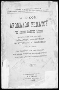 Μαθητικό βοήθημα Αρχαίων Ελληνικών για τους μαθητές των Ημιγυμνασίων, Παρθεναγωγείων, Αστικών σχολείων και Παρθεναγωγείων που περιλαμβάνει κατάλογο ανωμάλων ρημάτων και σειρά σημειώσεων και ασκήσεων για ...