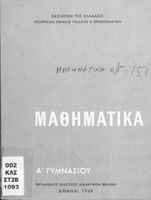Σχολικό εγχειρίδιο Μαθηματικών Α' Γυμνασίου που περιλαμβάνει γεωμετρία με έμφαση στον υπολογισμό γωνιών και εμβαδού και άλγεβρας με έμφαση στους ακέραιους αριθμούς και τα κλάσματα. Φέρει το σύμβολο της ...