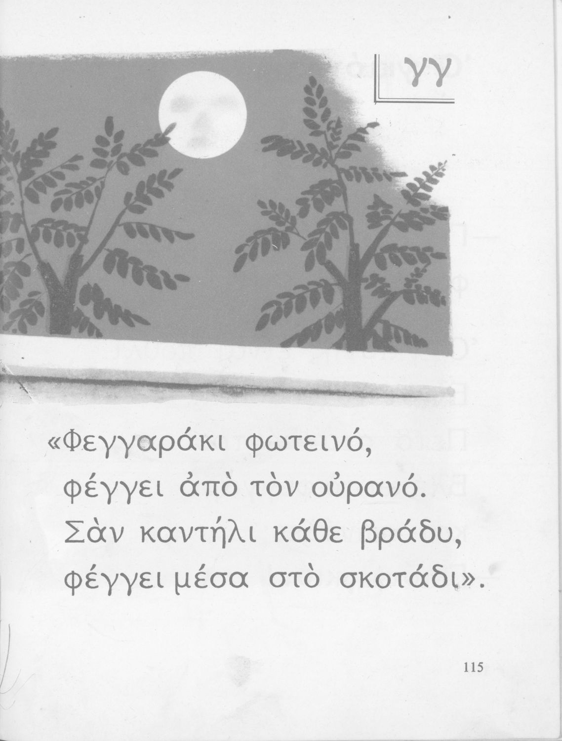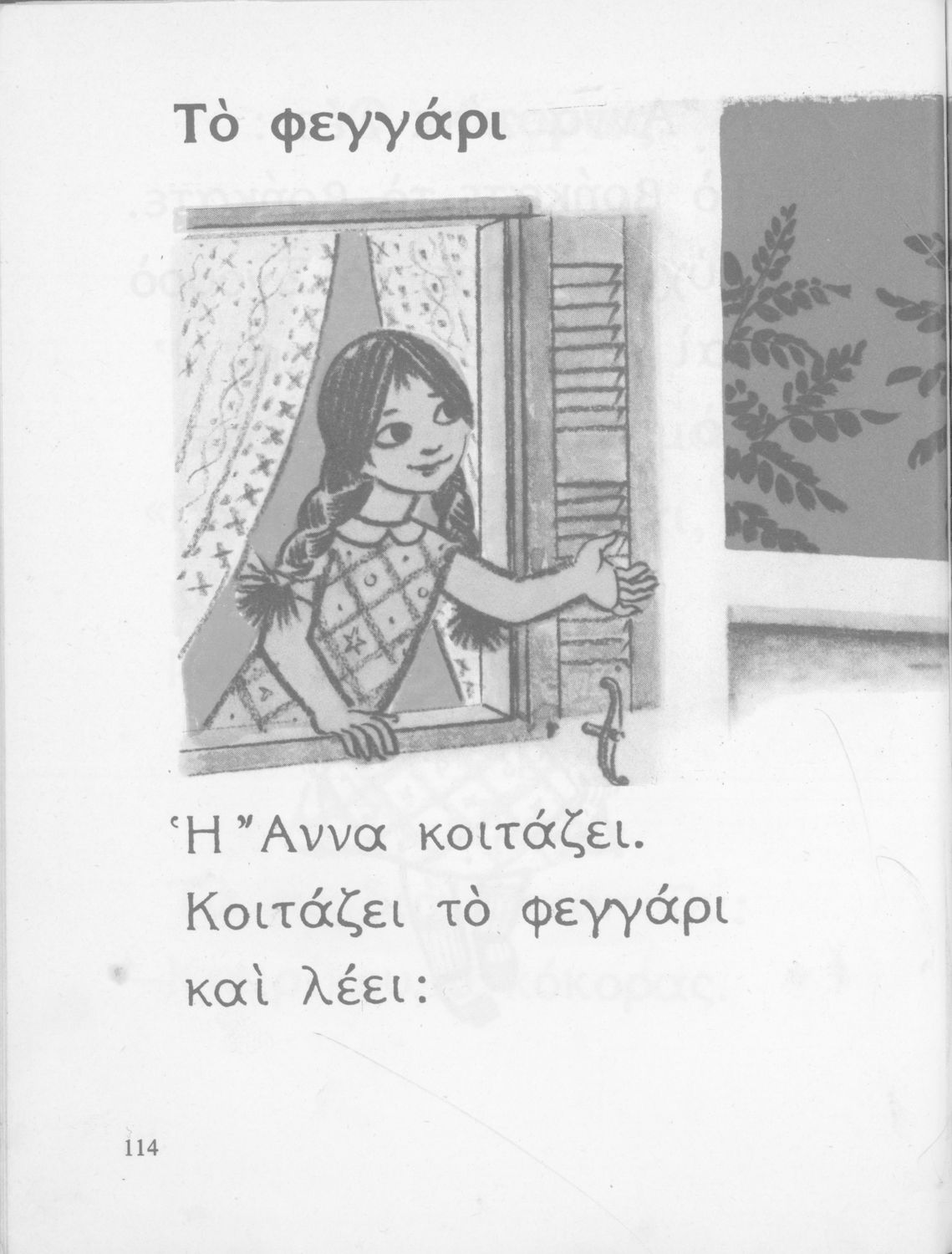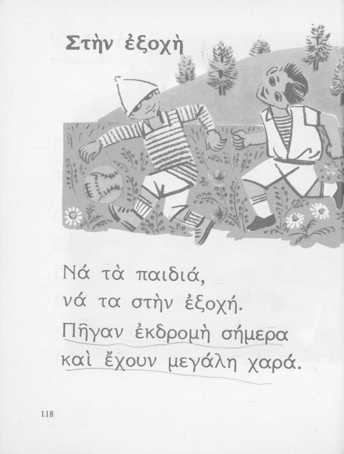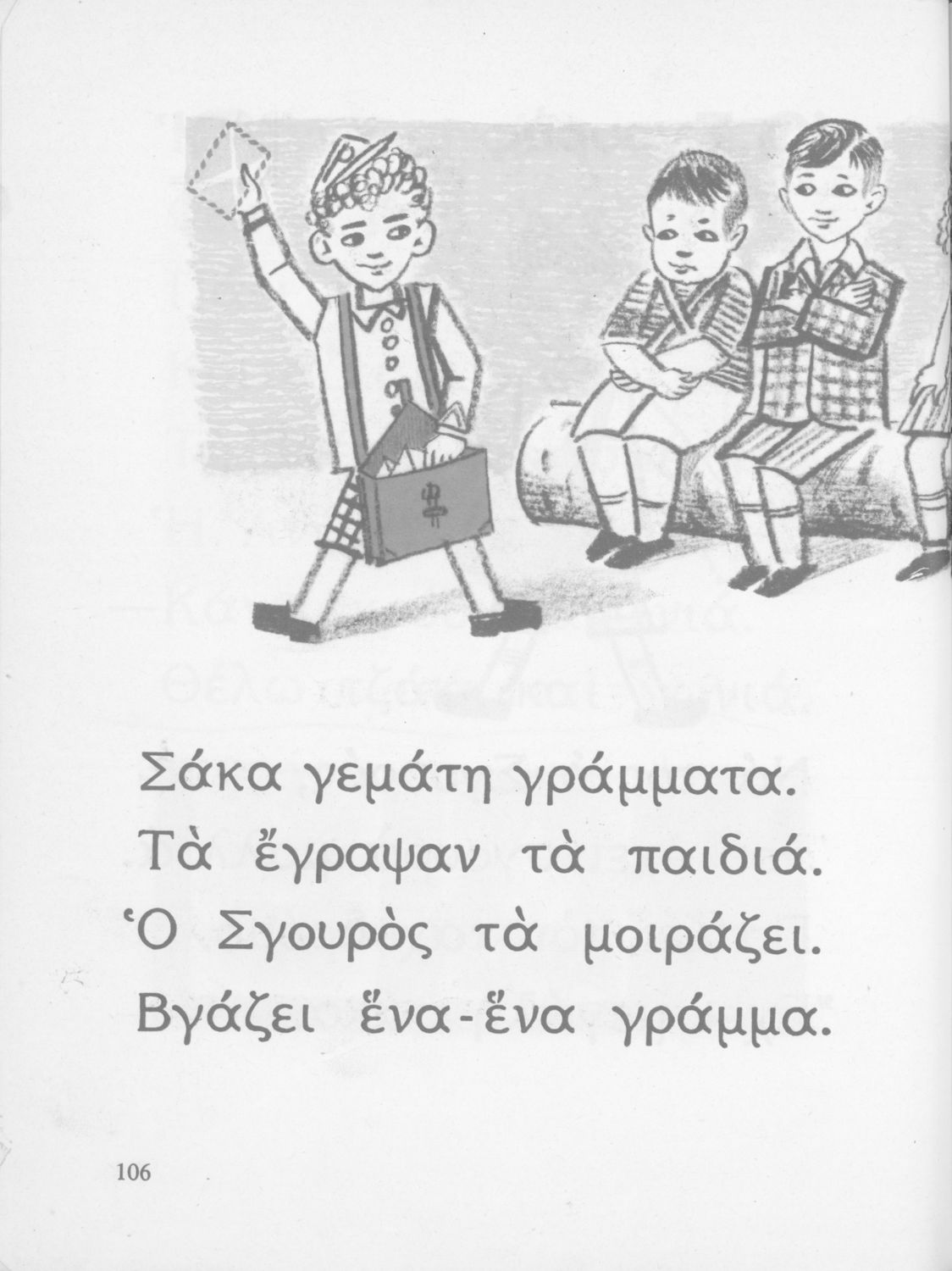 Αναγνωστικό Α΄ Δημοτικού που περιέχει γράμματα, συλλαβές, λέξεις, προτάσεις και κείμενα εμπνευσμένα από την οικογενειακή και κοινωνική ζωή του τόπου. Φέρει το σύμβολο της δικτατορίας.