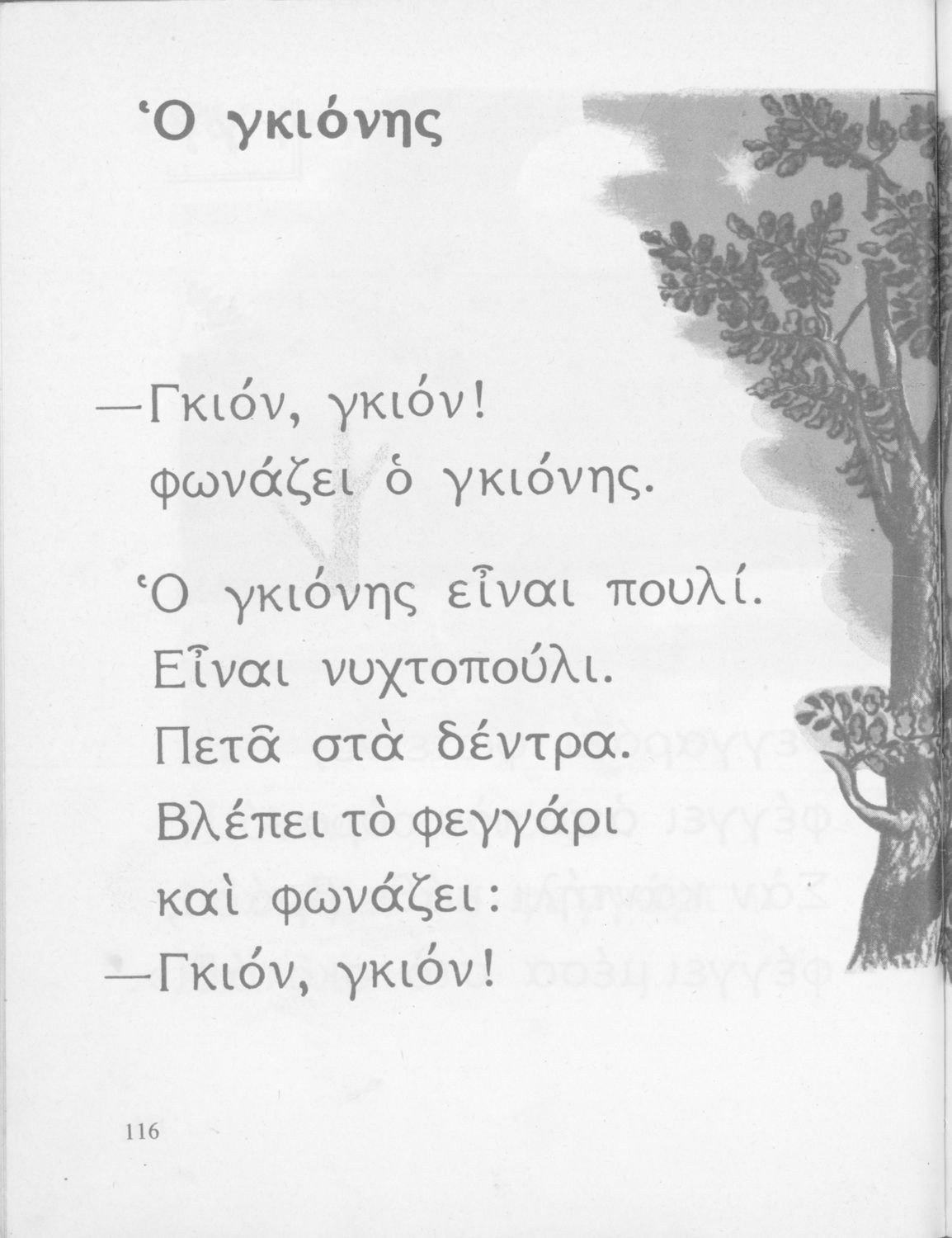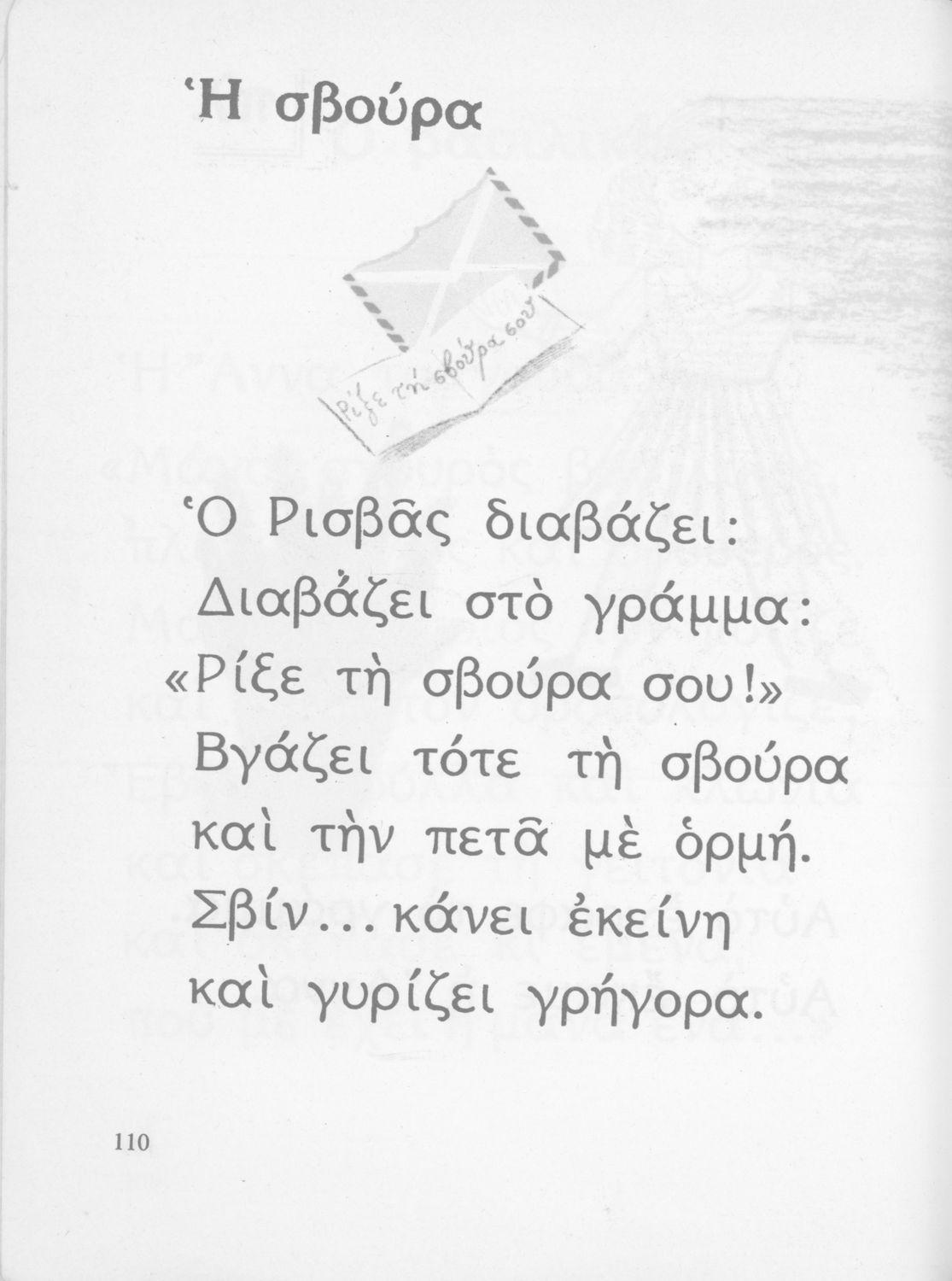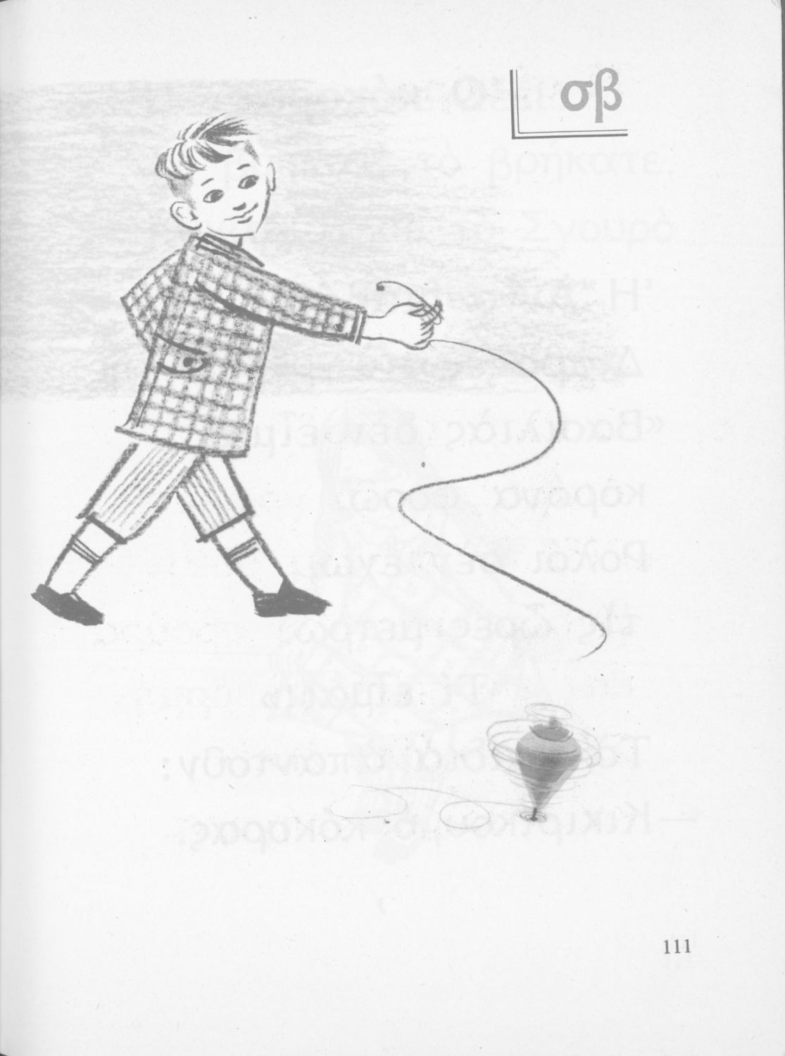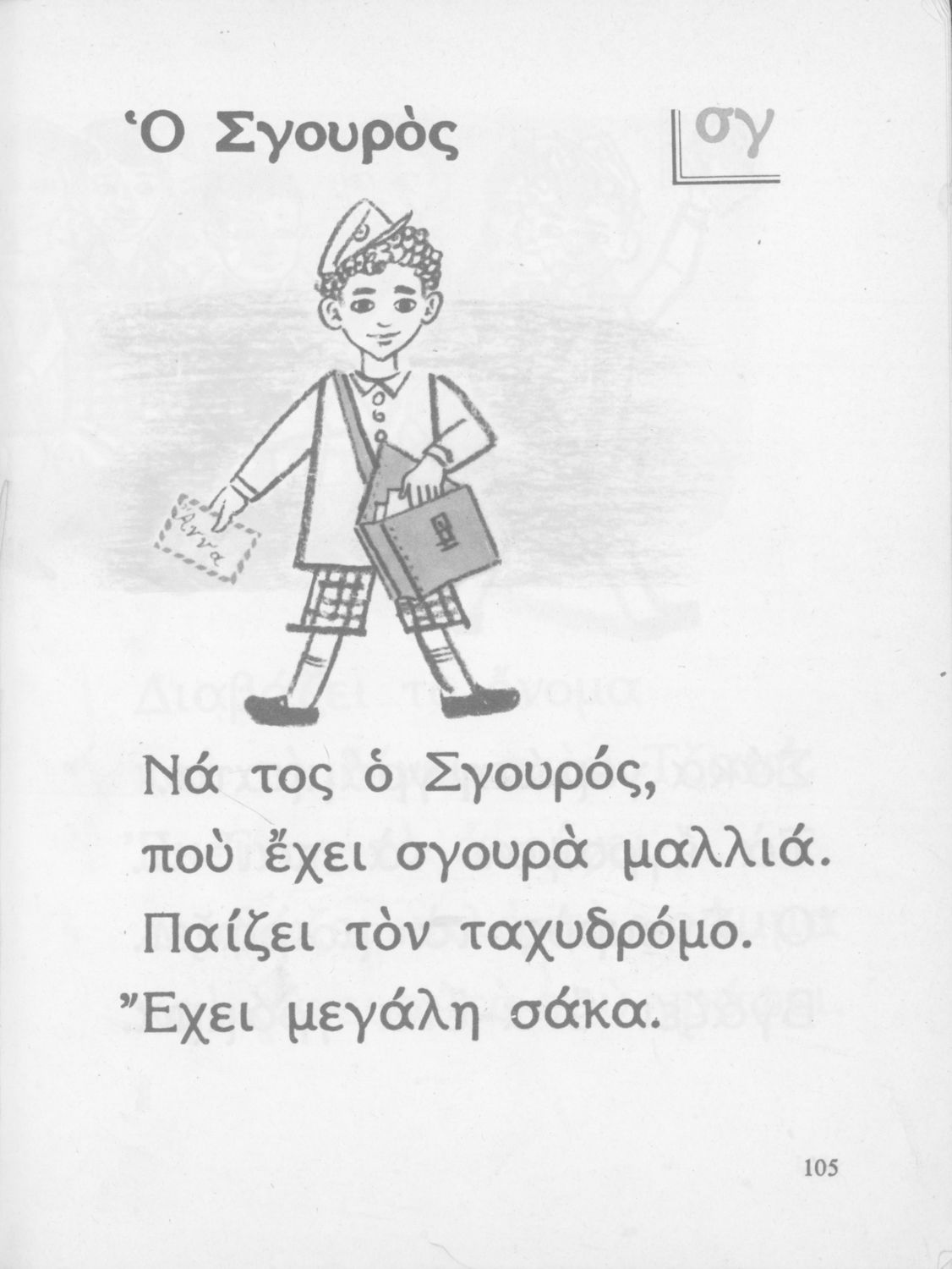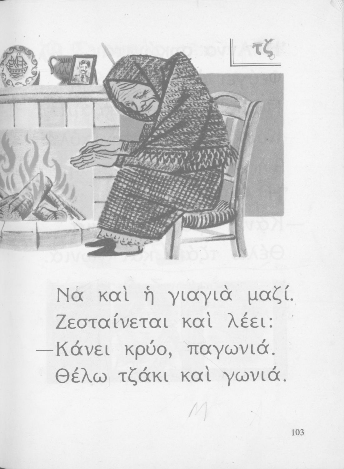 Αναγνωστικό Α΄ Δημοτικού που περιέχει γράμματα, συλλαβές, λέξεις, προτάσεις και κείμενα εμπνευσμένα από την οικογενειακή και κοινωνική ζωή του τόπου. Φέρει το σύμβολο της δικτατορίας.