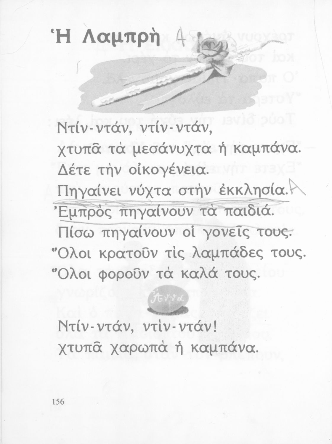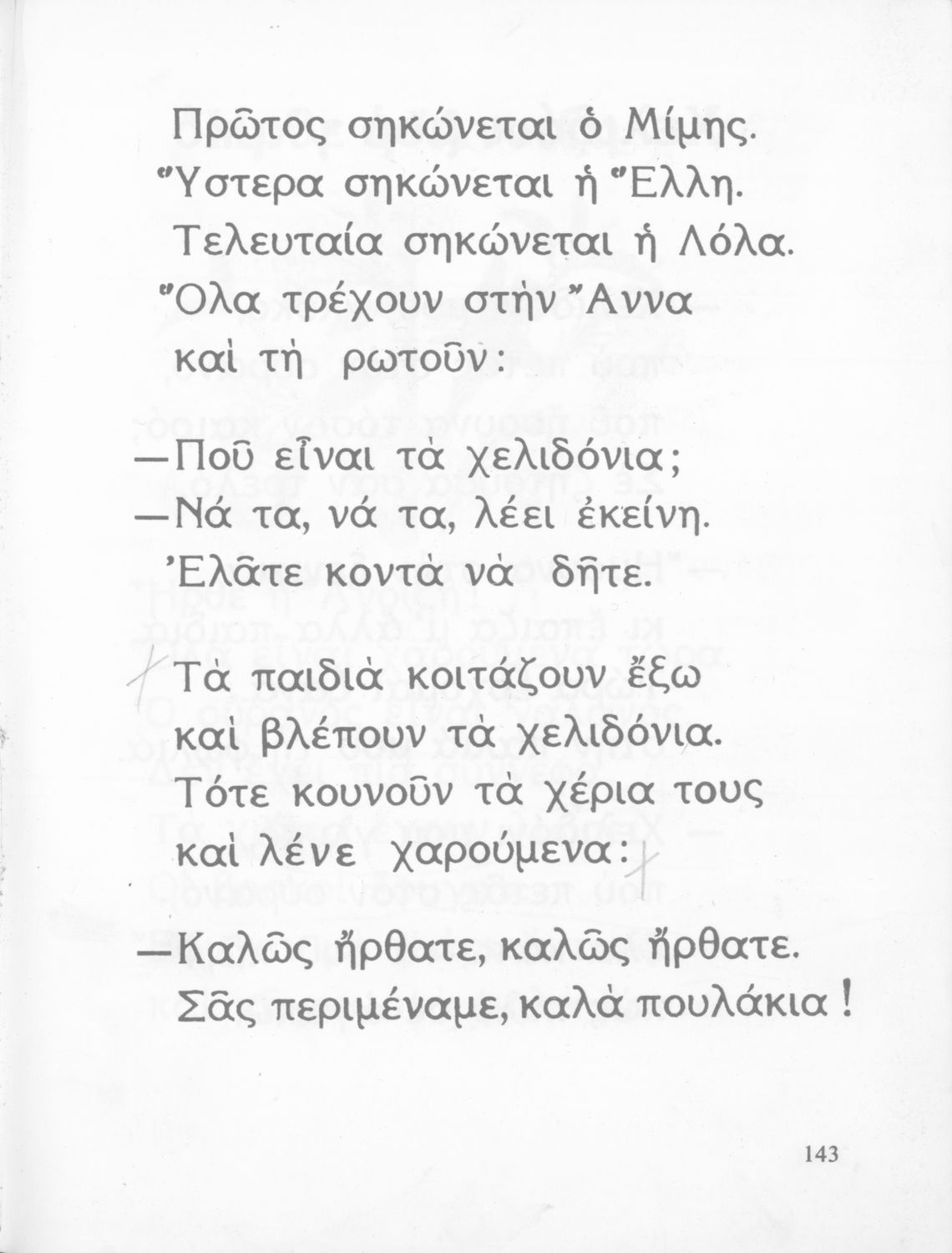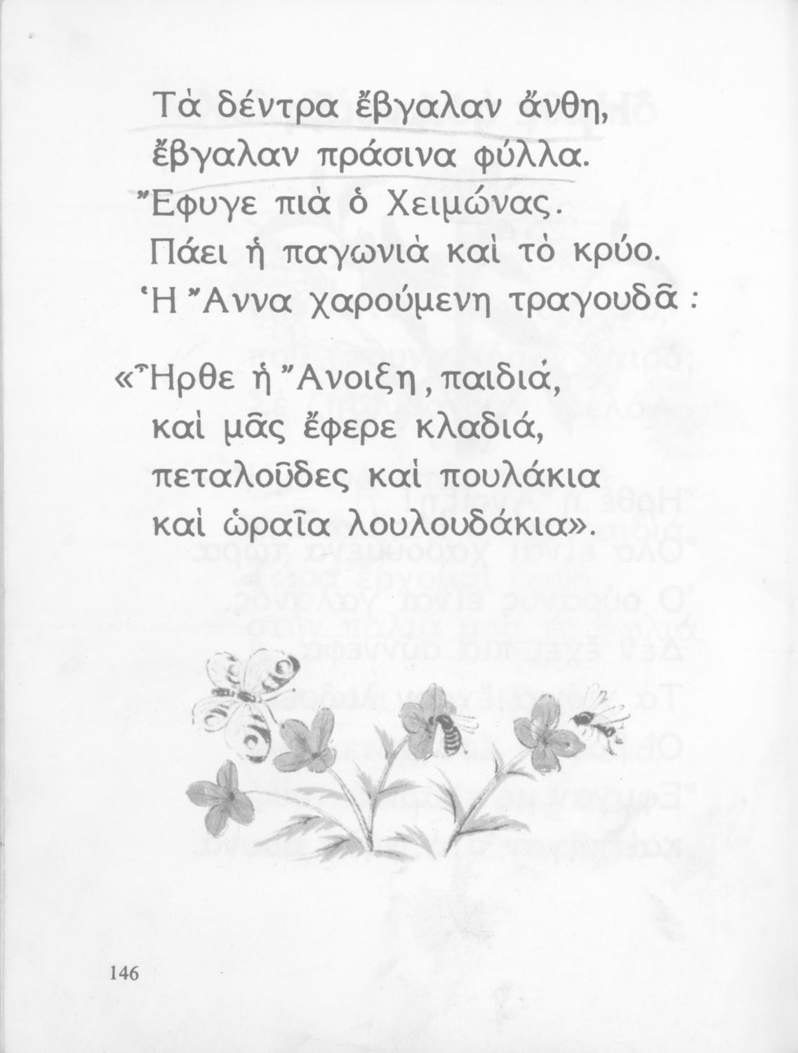Αναγνωστικό Α΄ Δημοτικού που περιέχει γράμματα, συλλαβές, λέξεις, προτάσεις και κείμενα εμπνευσμένα από την οικογενειακή και κοινωνική ζωή του τόπου. Φέρει το σύμβολο της δικτατορίας.