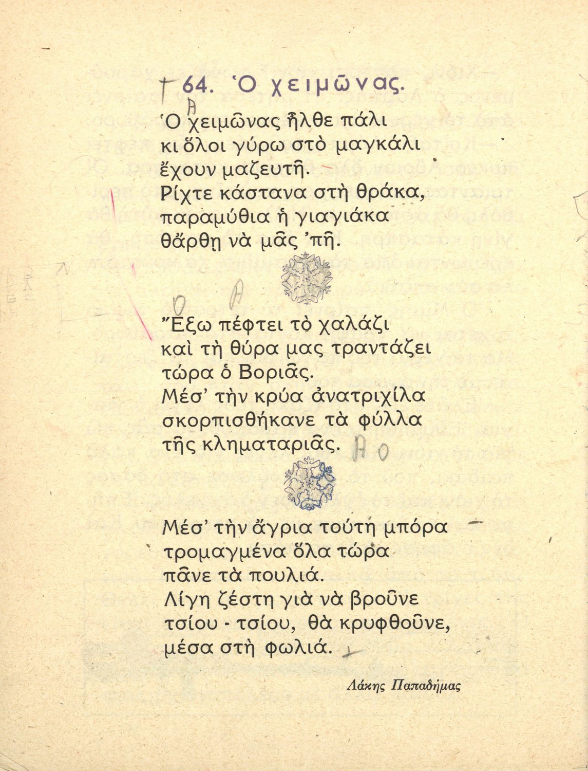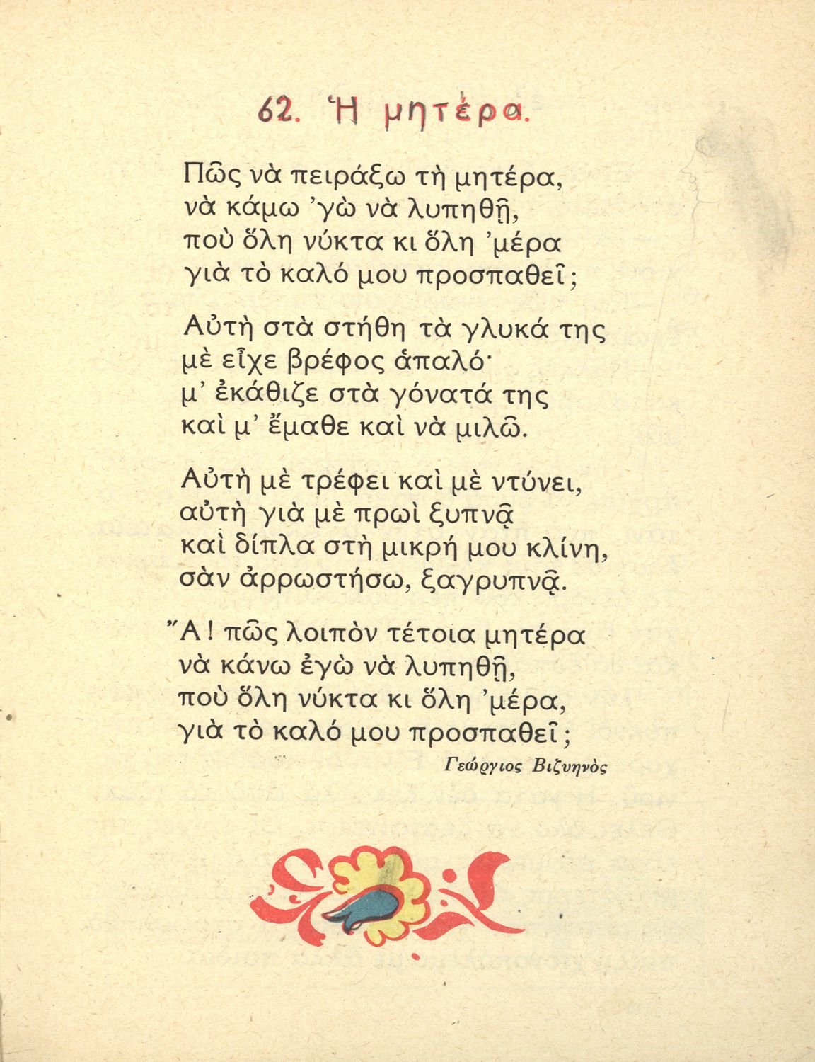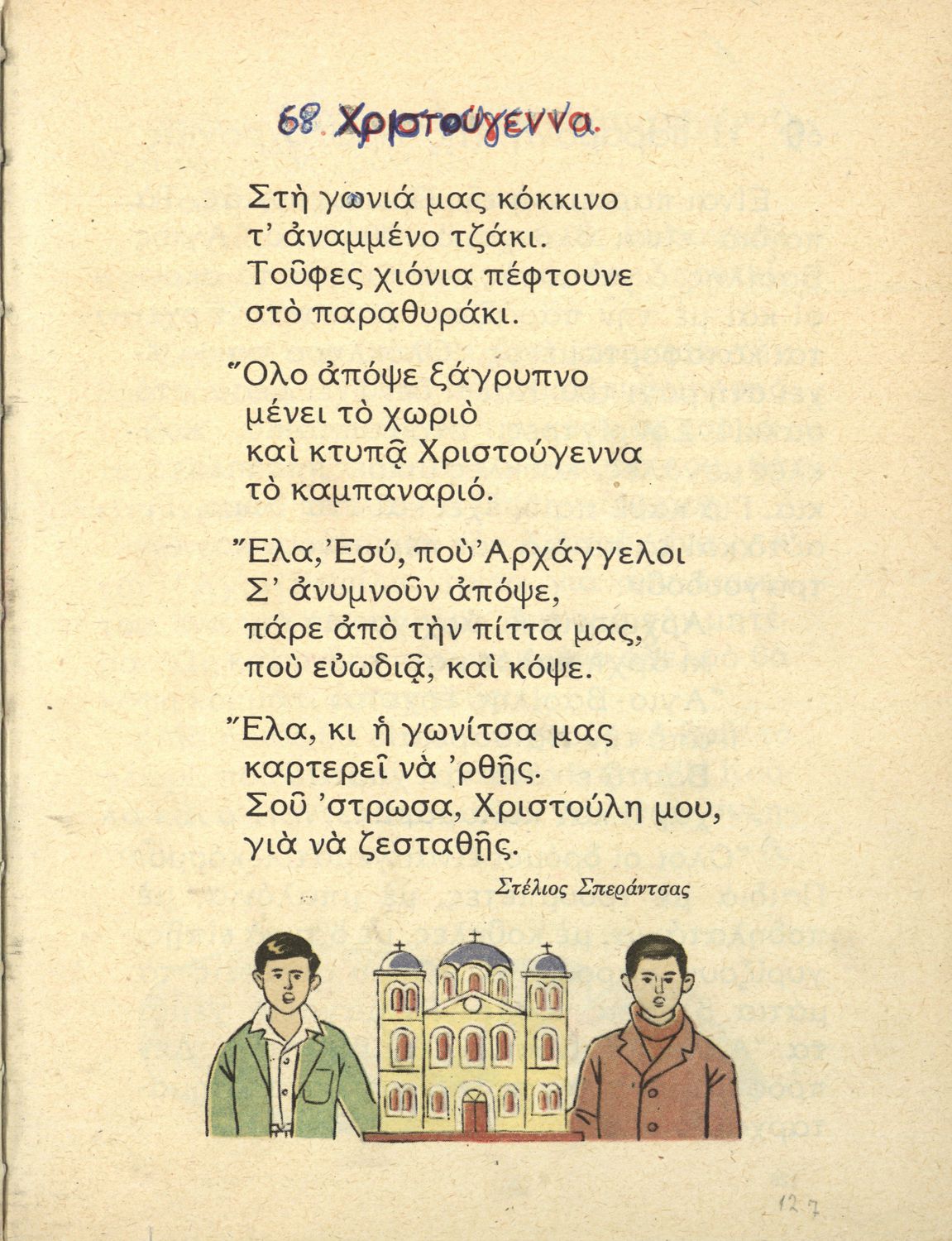 Αναγνωστικό Β' Δημοτικού που είναι χωρισμένο σύμφωνα με τις εποχές του χρόνου και περιλαμβάνει κείμενα ηθοποιητικού περιεχομένου εμπνευσμένα από τη θρησκευτική, εθνική, κοινωνική και οικογενειακή ζωή. Φέρει το