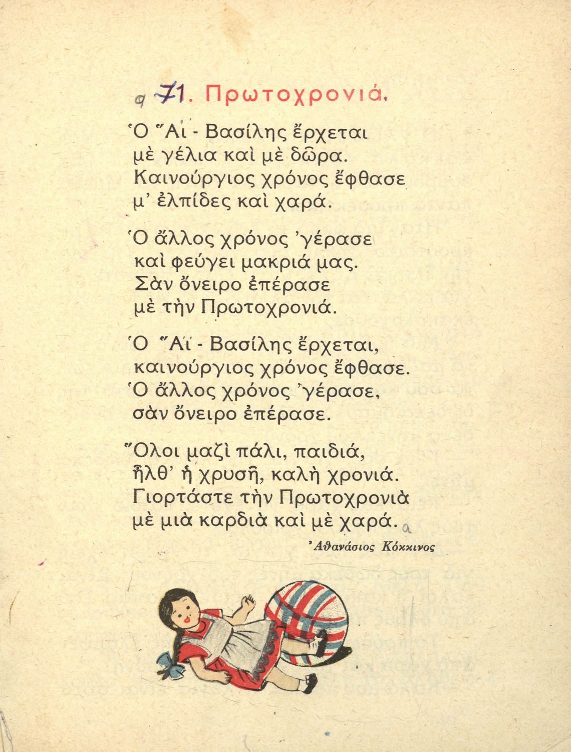 Αναγνωστικό Β' Δημοτικού που είναι χωρισμένο σύμφωνα με τις εποχές του χρόνου και περιλαμβάνει κείμενα ηθοποιητικού περιεχομένου εμπνευσμένα από τη θρησκευτική, εθνική, κοινωνική και οικογενειακή ζωή.