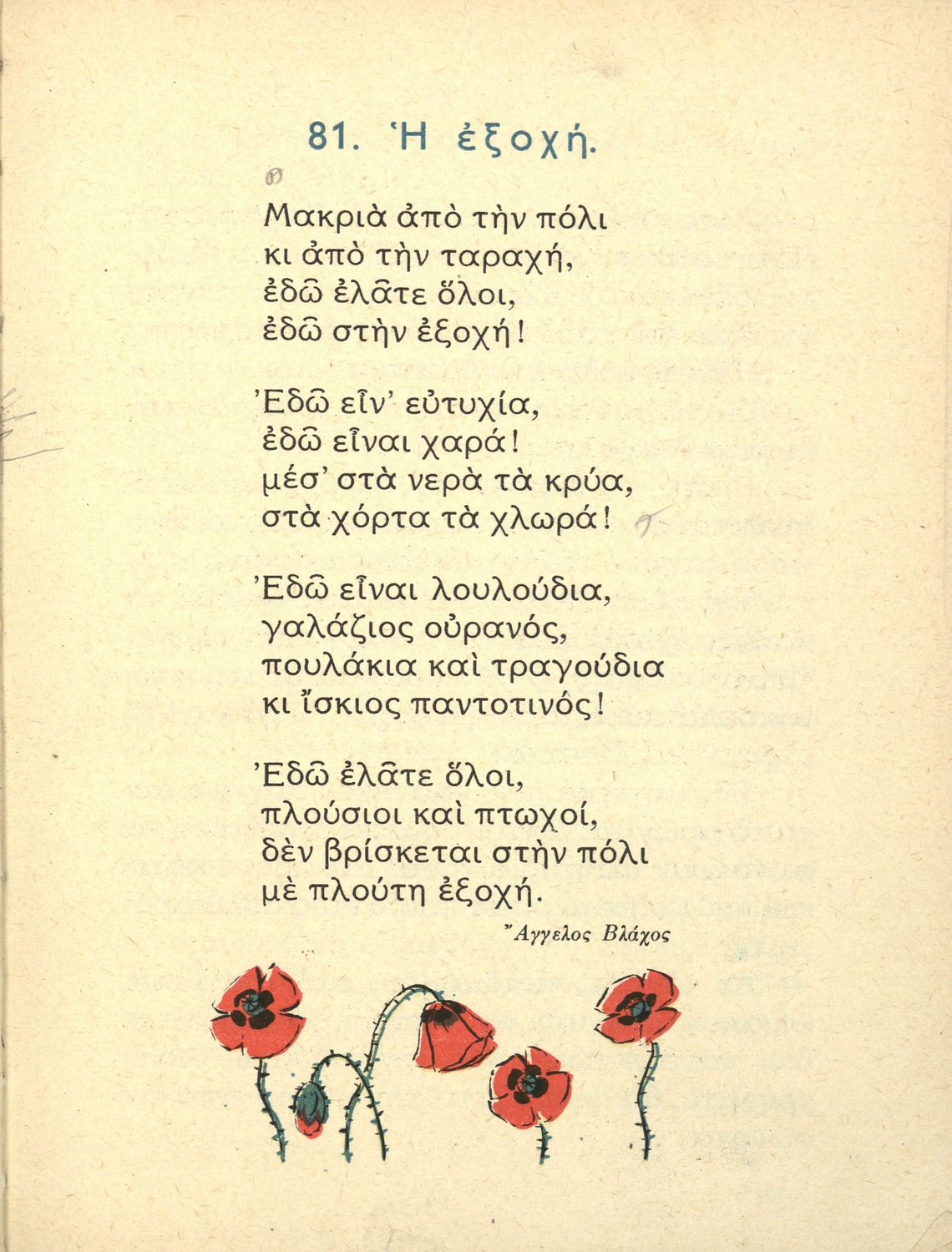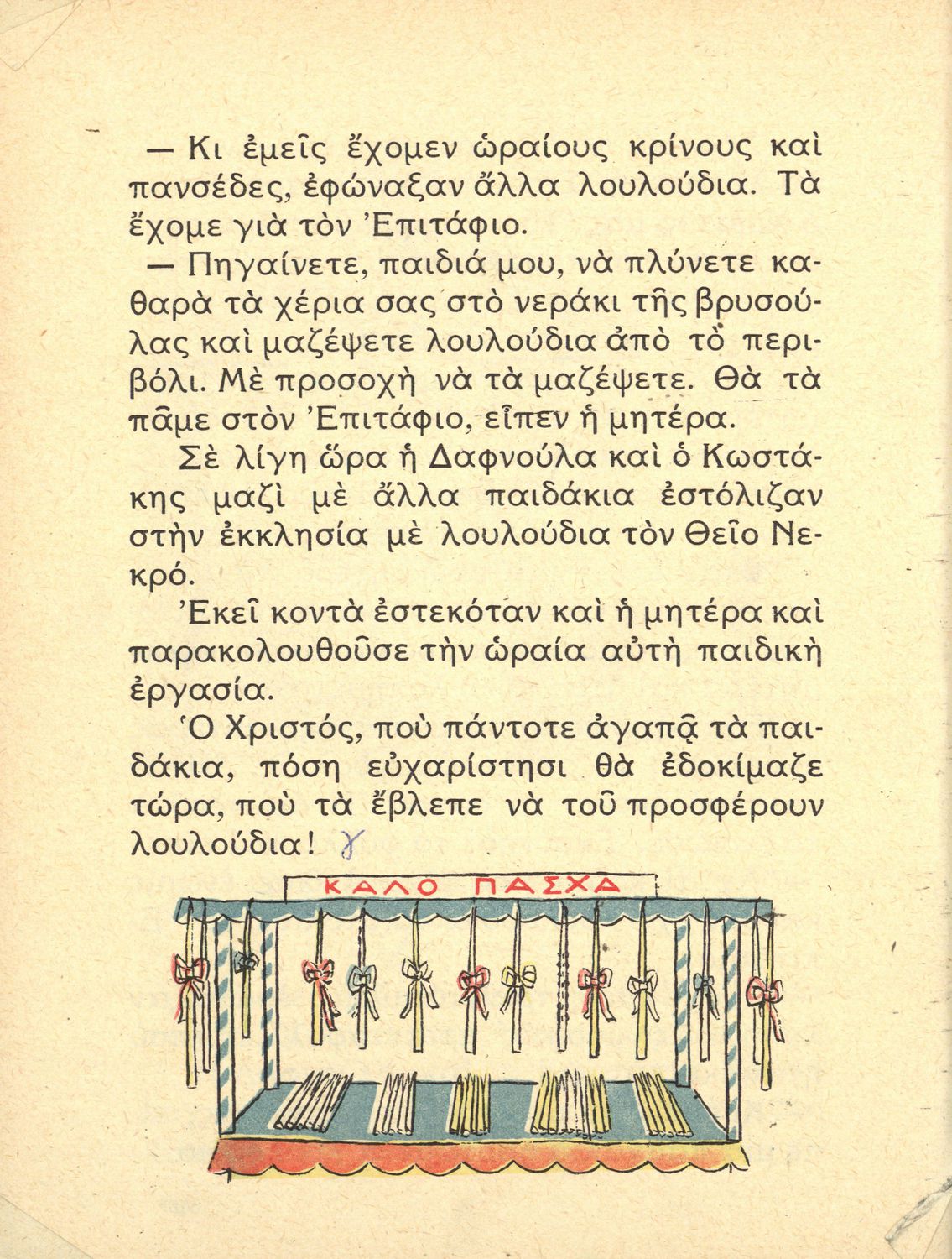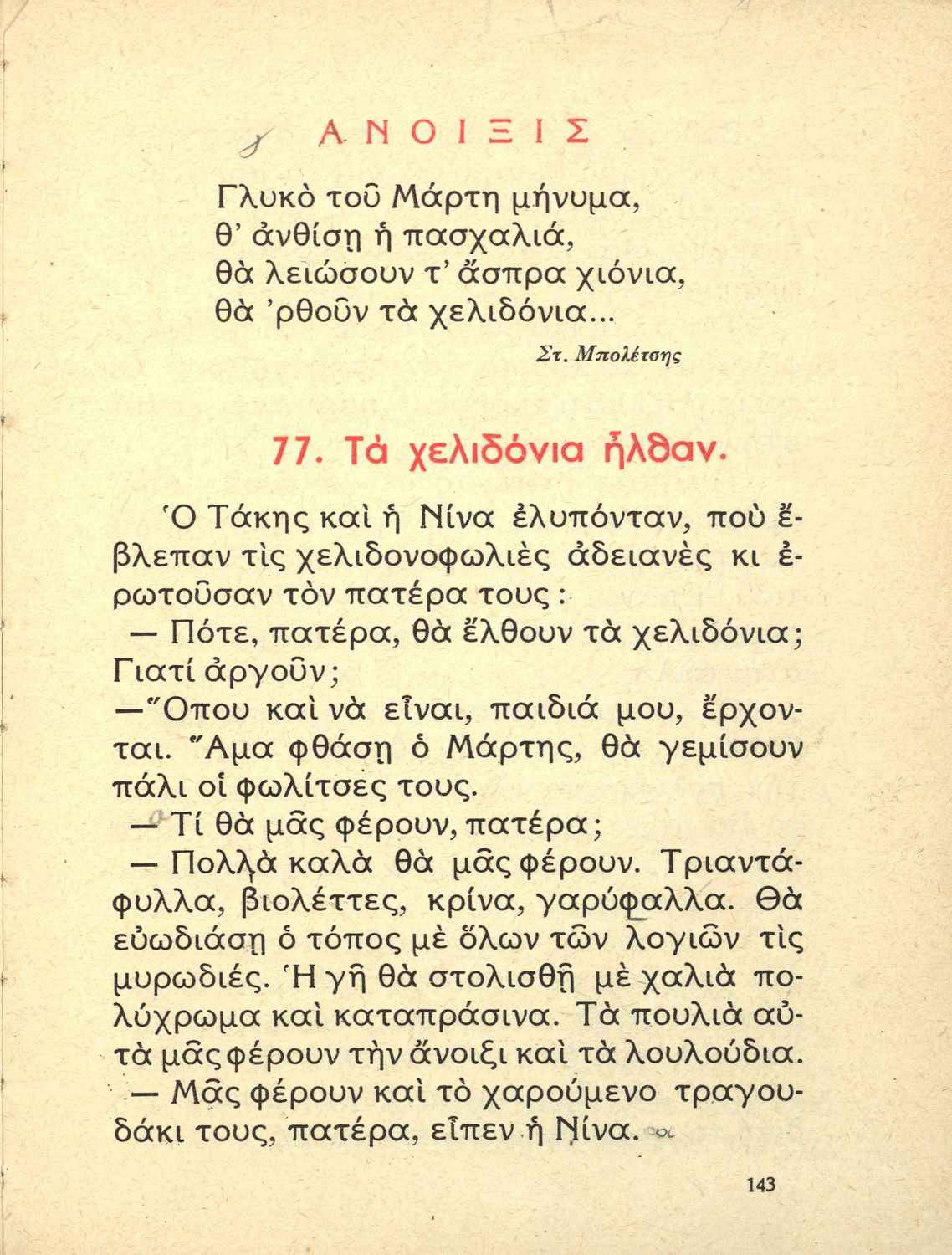Αναγνωστικό Β' Δημοτικού που είναι χωρισμένο σύμφωνα με τις εποχές του χρόνου και περιλαμβάνει κείμενα ηθοποιητικού περιεχομένου εμπνευσμένα από τη θρησκευτική, εθνική, κοινωνική και οικογενειακή ζωή. Φέρει το