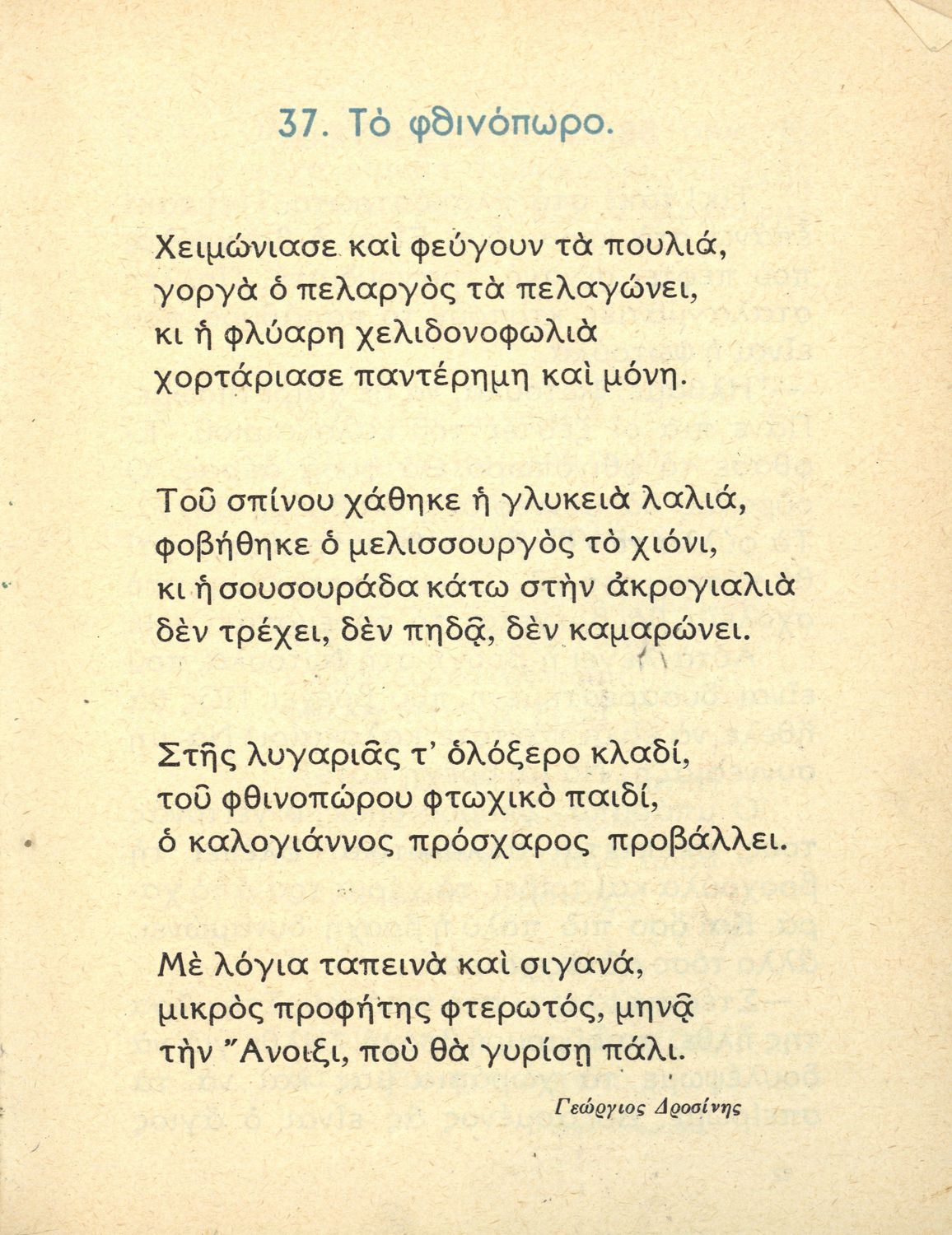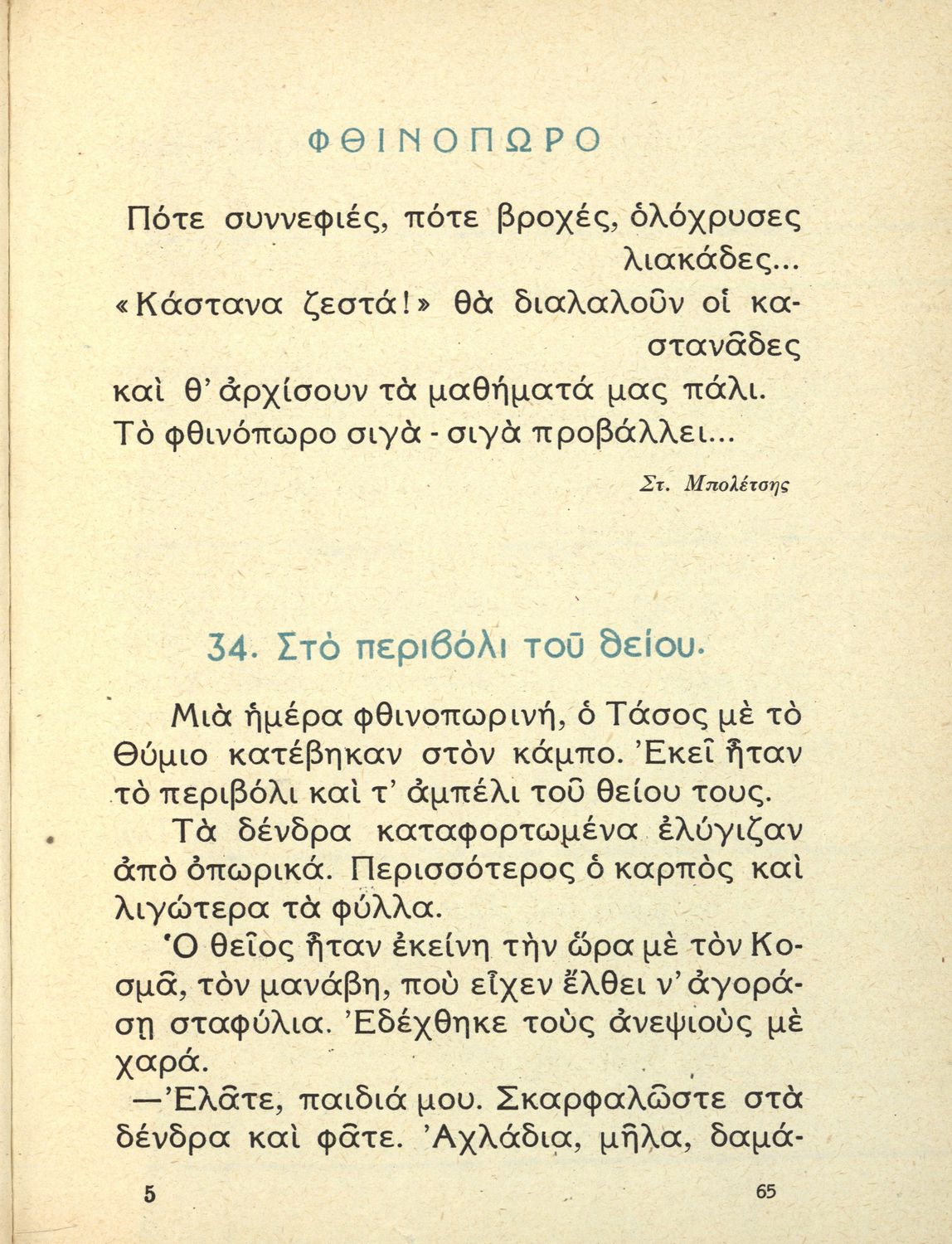 Αναγνωστικό Β' Δημοτικού που είναι χωρισμένο σύμφωνα με τις εποχές του χρόνου και περιλαμβάνει κείμενα ηθοποιητικού περιεχομένου εμπνευσμένα από τη θρησκευτική, εθνική, κοινωνική και οικογενειακή ζωή. Φέρει το