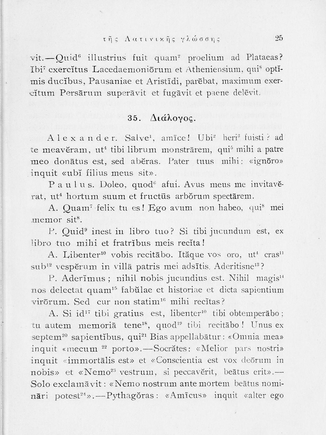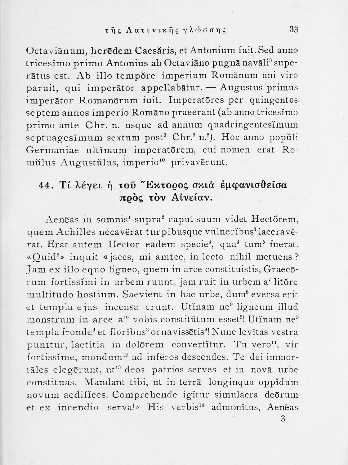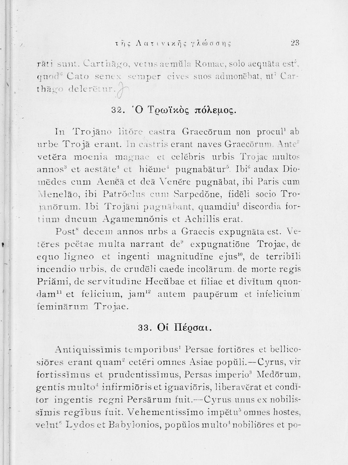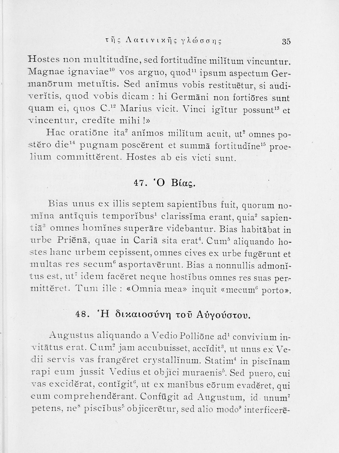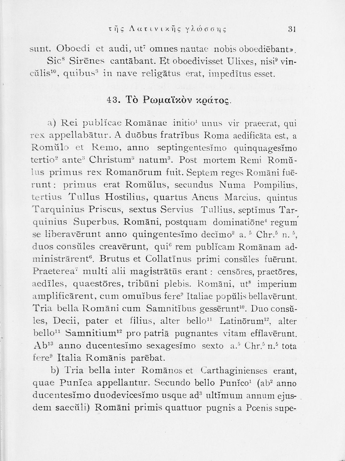 Σχολικό εγχειρίδιο Λατινικών για τη Δ΄ Γυμνασίου που περιέχει 54 κείμενα/περικοπές στα λατινικά, ερμηνευτικά υπομνήματα, λεξιλόγιο και κατάλογο με τα συντακτικά φαινόμενα (αφαιρετική, προθέσεις, σύνδεσμοι) που διδάσκονται με βάση τις περικοπές.