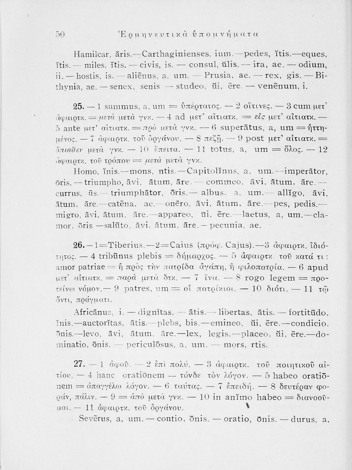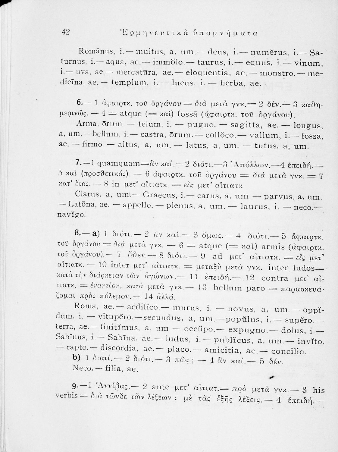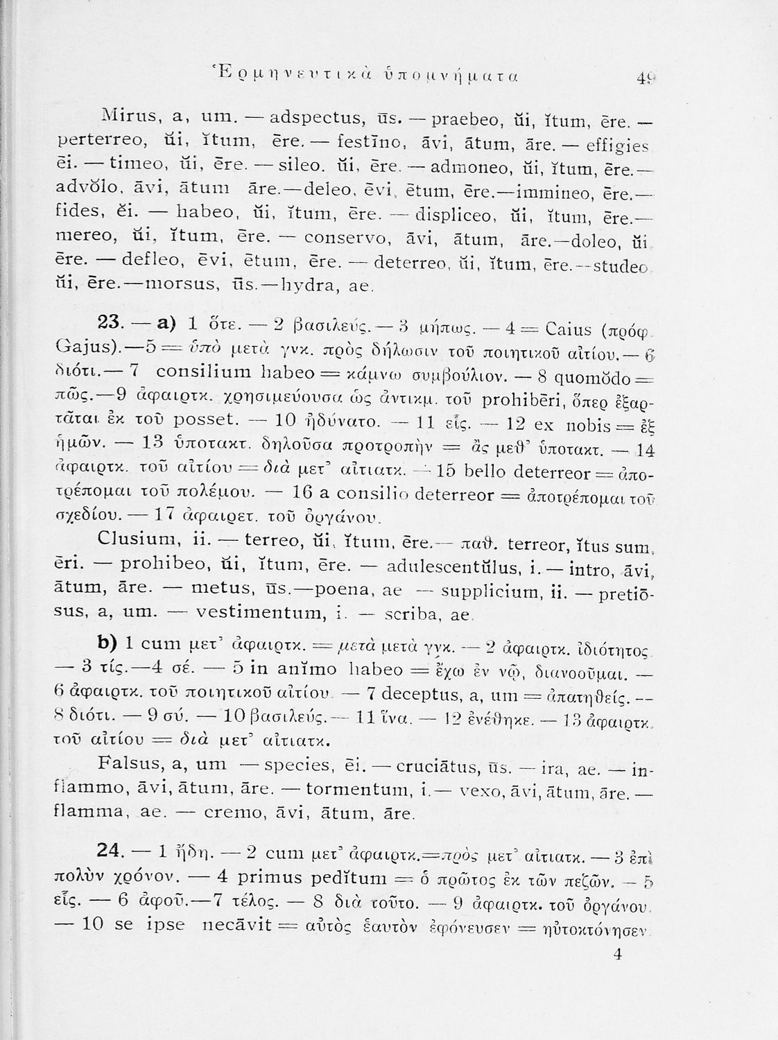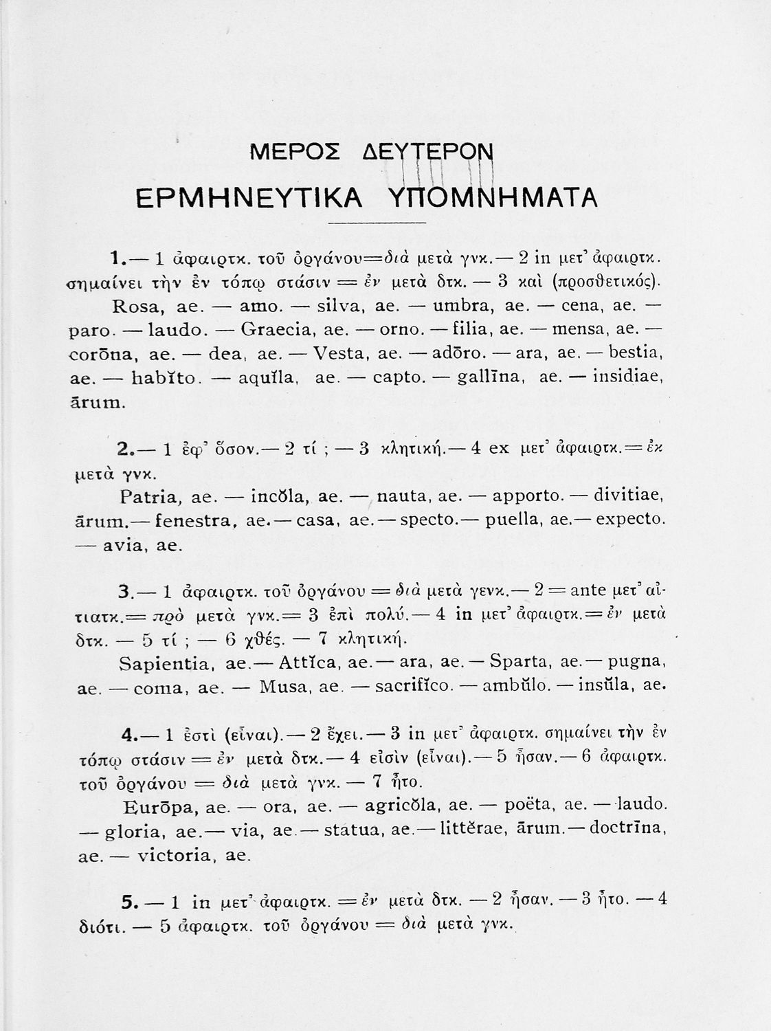Σχολικό εγχειρίδιο Λατινικών για τη Δ΄ Γυμνασίου που περιέχει 54 κείμενα/περικοπές στα λατινικά, ερμηνευτικά υπομνήματα, λεξιλόγιο και κατάλογο με τα συντακτικά φαινόμενα (αφαιρετική, προθέσεις, σύνδεσμοι) που διδάσκονται με βάση τις περικοπές.