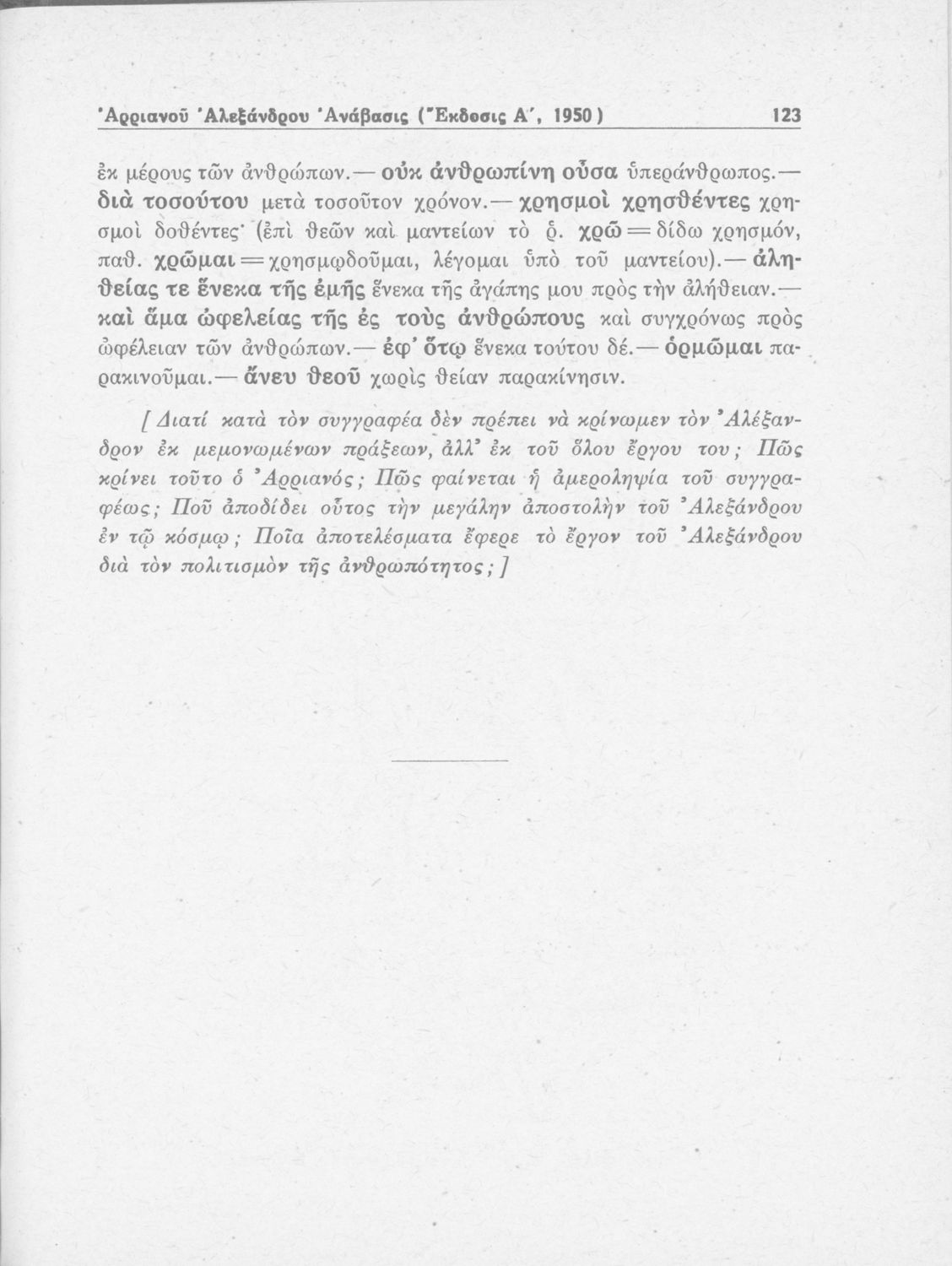 Βαθμίδα εκπαίδευσης: Δευτεροβάθμια Τάξη: Γ' Γυμνασίου Μάθημα: Αρχαία Ελληνικά Γλώσσα: Απλή καθαρεύουσα Παρουσίαση περιεχομένου: Σχολικό εγχειρίδιο Αρχαίων Ελληνικών για τη Γ΄ Γυμνασίου που περιλαμβάνει σύντομο βιογραφικό σημείωμα του Αρριανού, εισαγωγή στο έργο, αποσπάσματα από το πρώτο και δεύτερο βιβλίο της Ανάβασης του Αλέξανδρου και ετυμολογικές σημειώσεις. |
