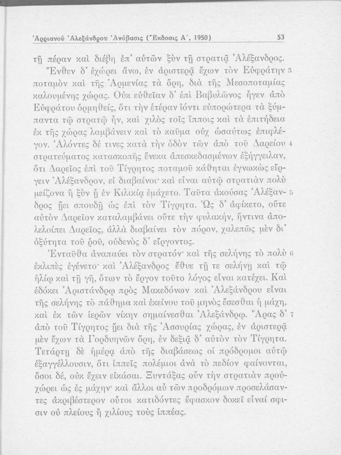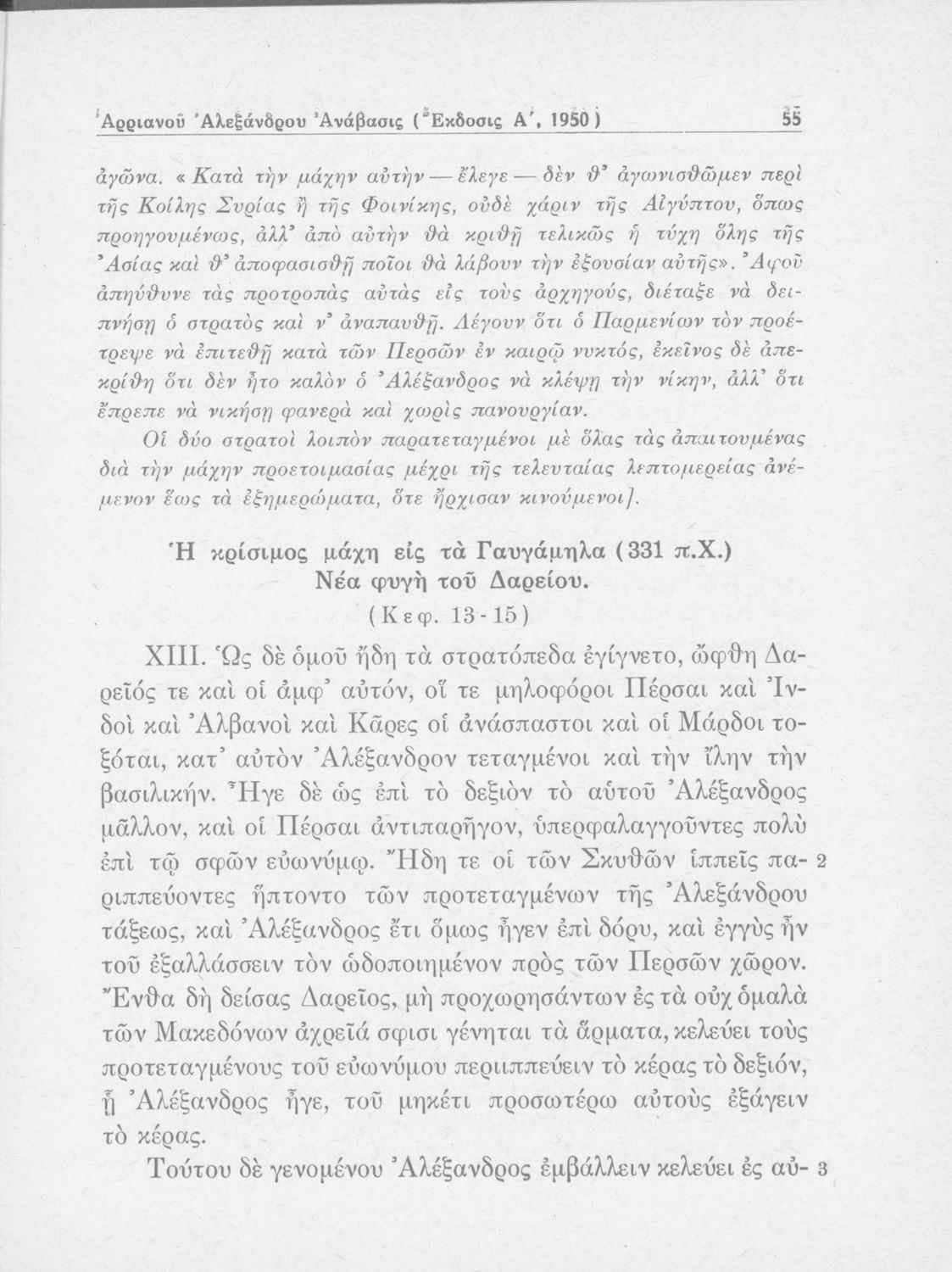 Σχολικό εγχειρίδιο Αρχαίων Ελληνικών για τη Γ΄ Γυμνασίου που περιλαμβάνει σύντομο βιογραφικό σημείωμα του Αρριανού, εισαγωγή στο έργο, αποσπάσματα από το πρώτο και δεύτερο βιβλίο της Ανάβασης του Αλέξανδρου και ετυμολογικές σημειώσεις.