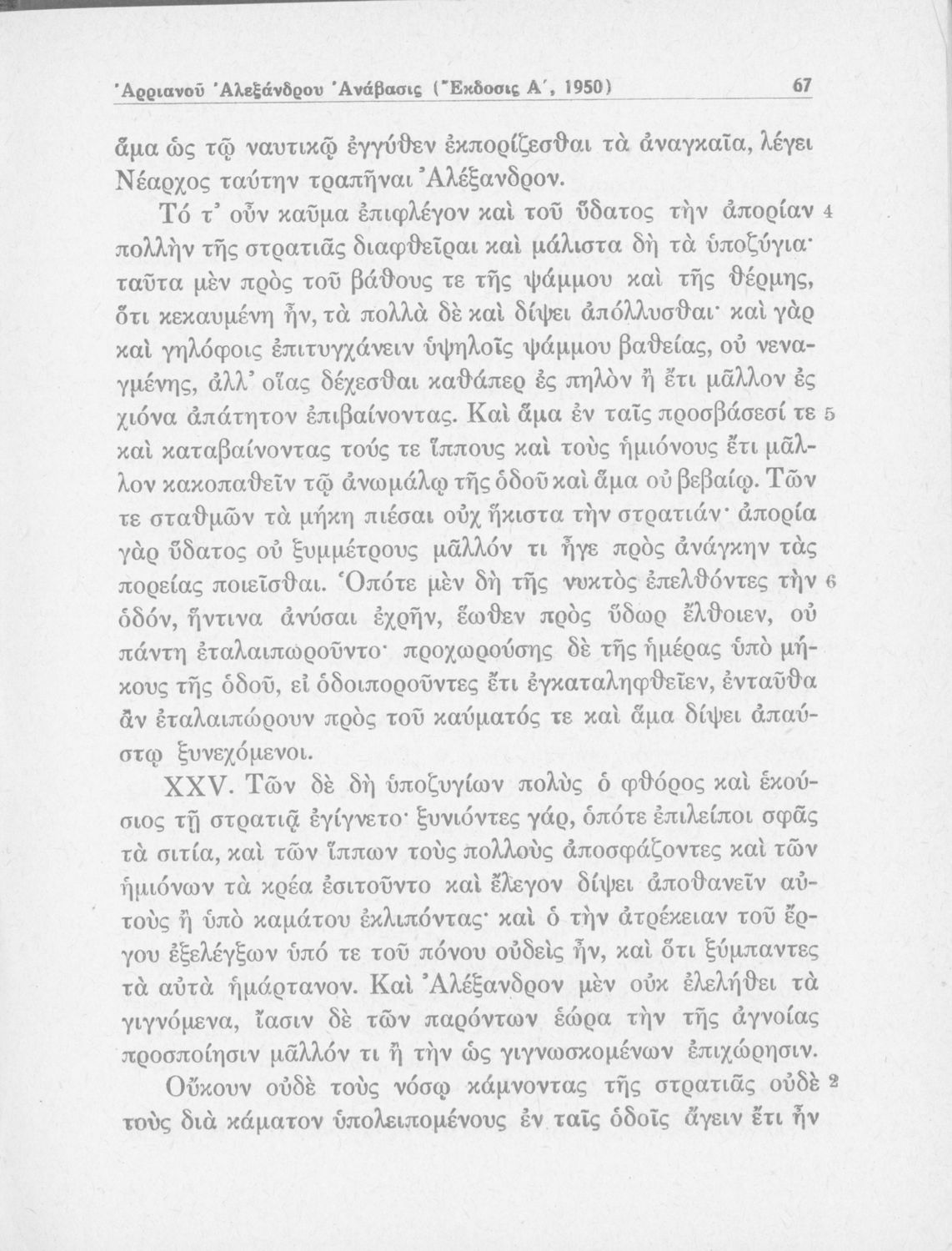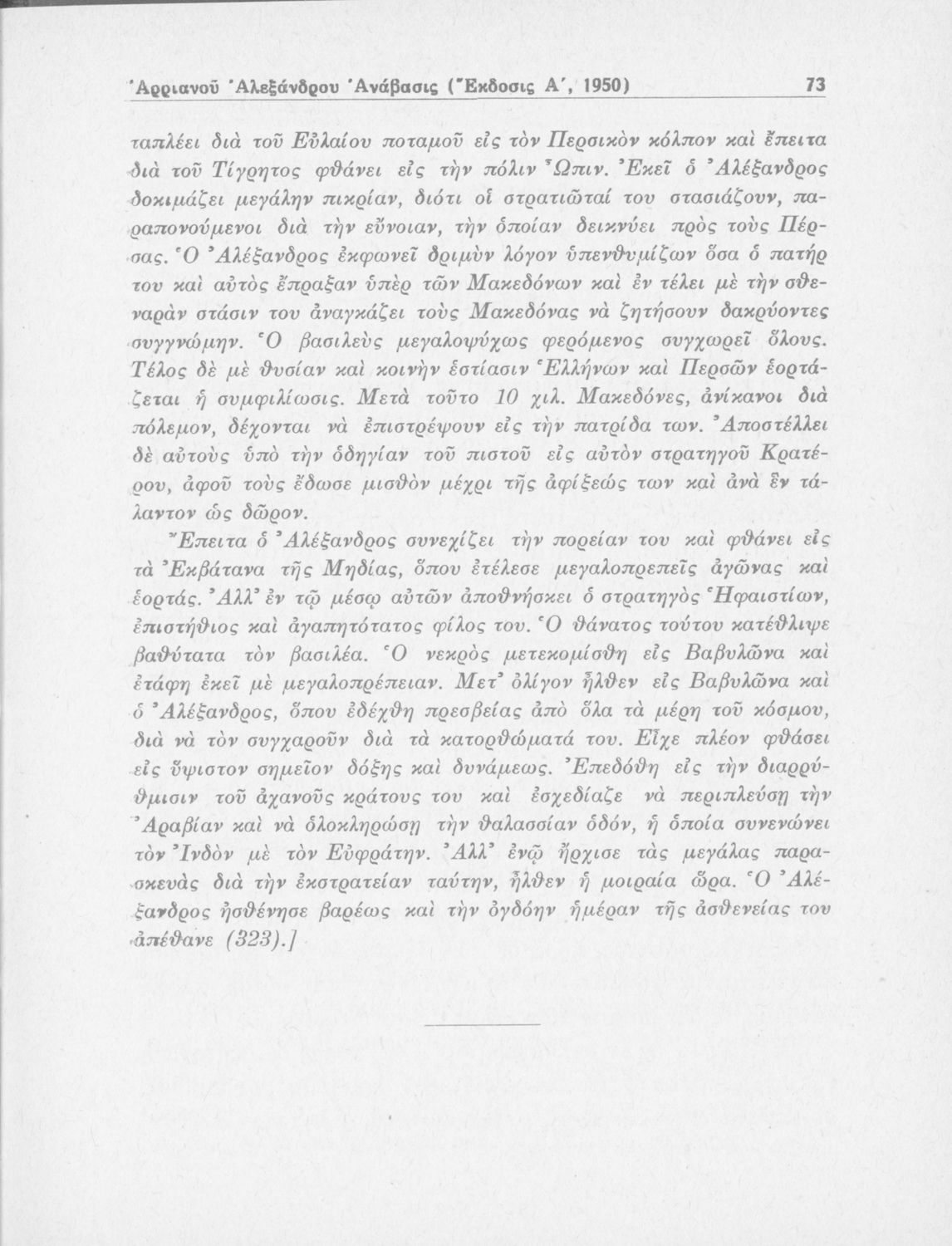 Σχολικό εγχειρίδιο Αρχαίων Ελληνικών για τη Γ΄ Γυμνασίου που περιλαμβάνει σύντομο βιογραφικό σημείωμα του Αρριανού, εισαγωγή στο έργο, αποσπάσματα από το πρώτο και δεύτερο βιβλίο της Ανάβασης του Αλέξανδρου και ετυμολογικές σημειώσεις.