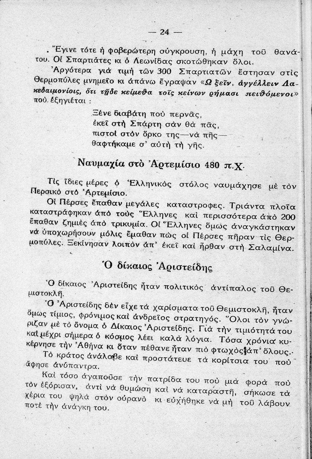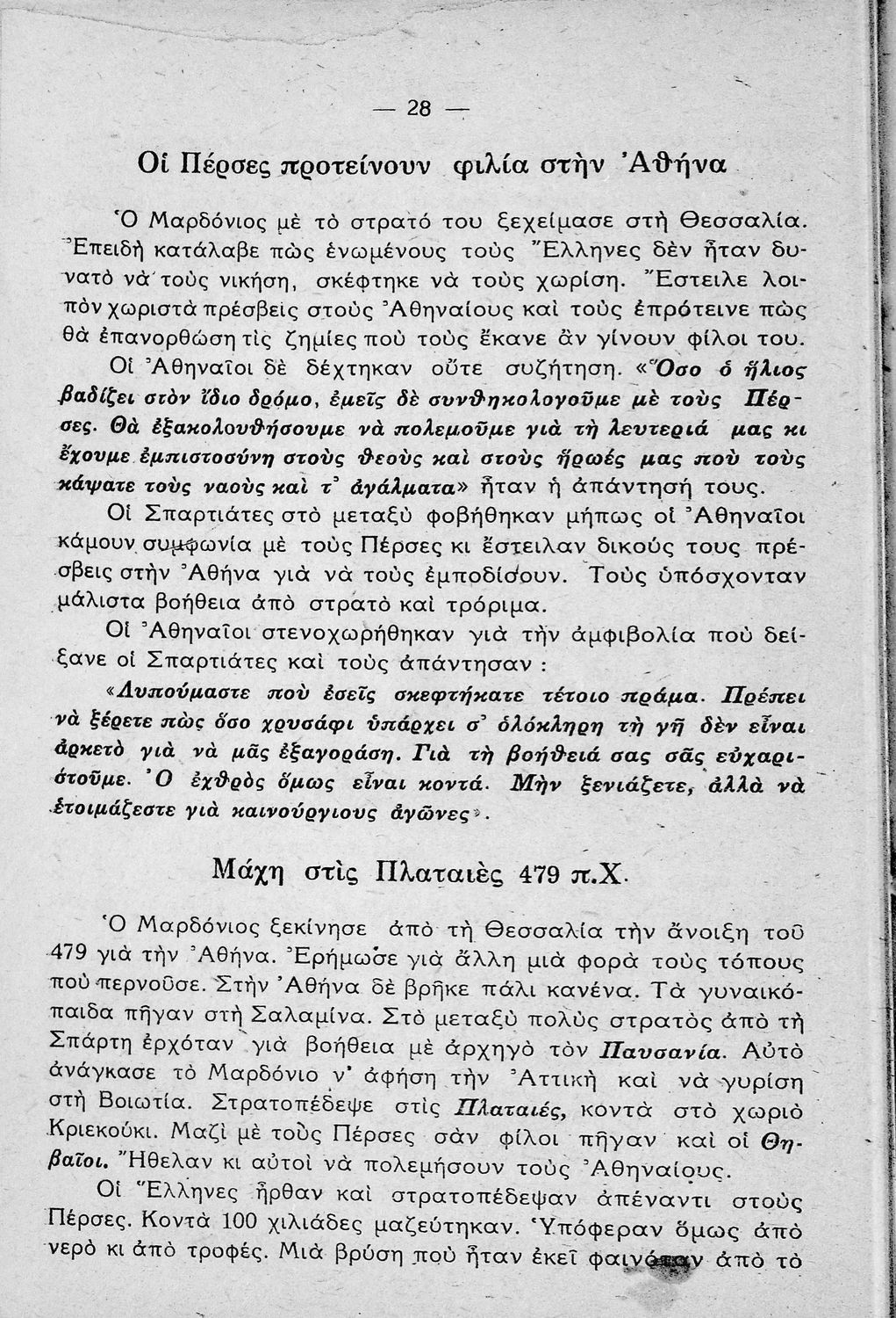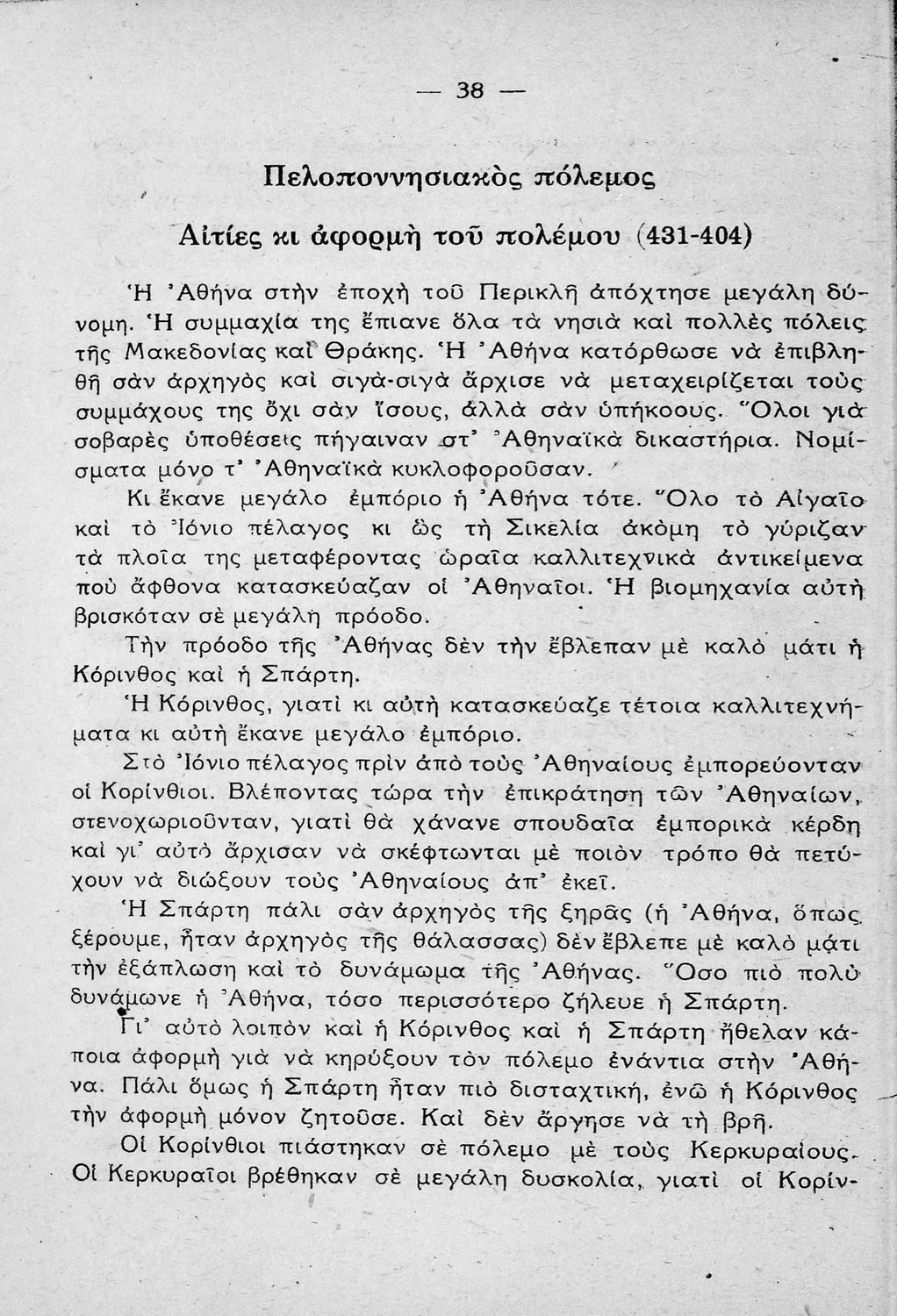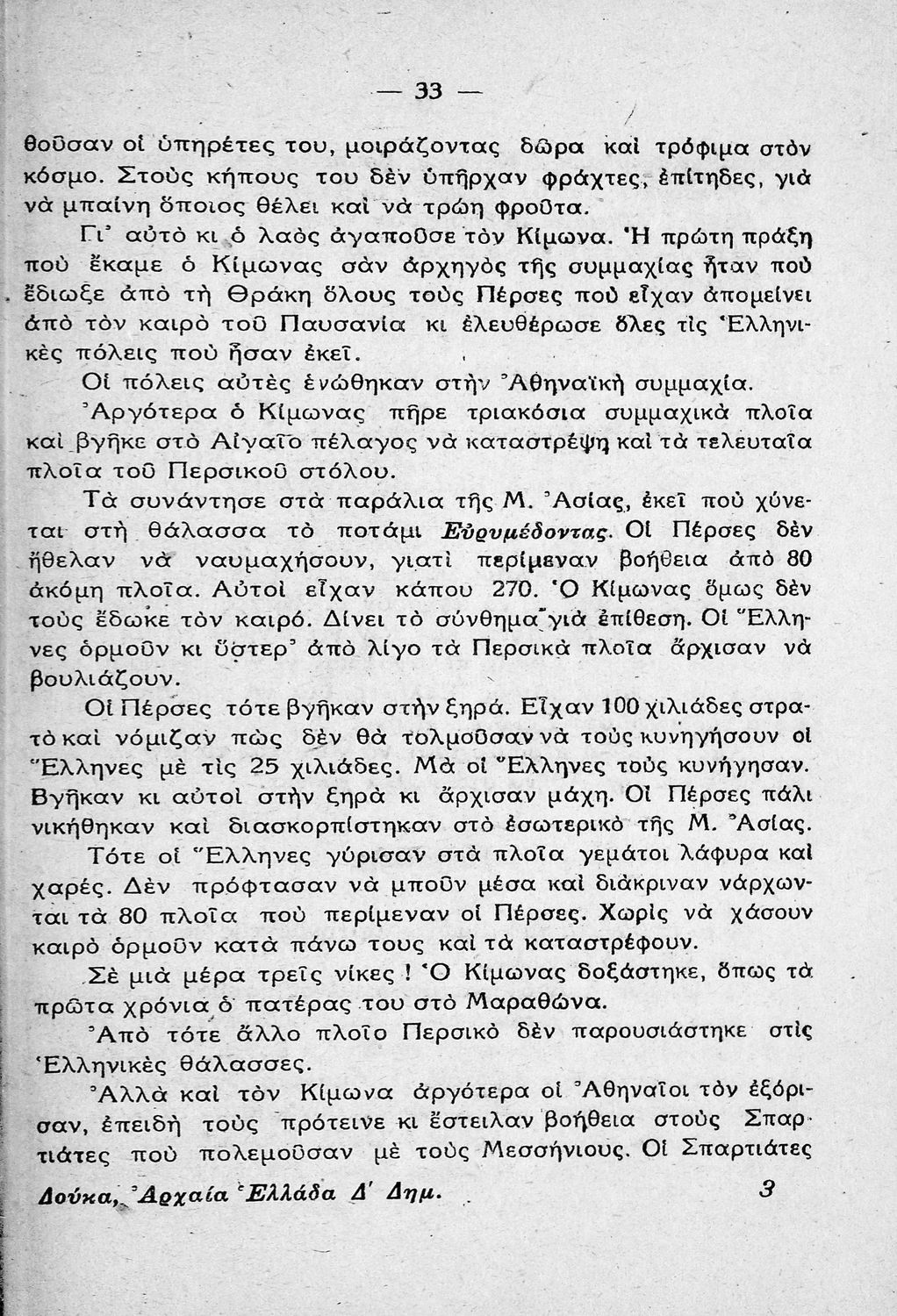 Βαθμίδα εκπαίδευσης: Πρωτοβάθμια Τάξη: Δ' Δημοτικού Μάθημα: Ιστορία Γλώσσα: Απλή καθαρεύουσα Παρουσίαση περιεχομένου: Μαθητικό βοήθημα Δ΄ Δημοτικού που καλύπτει την περίοδο από την κάθοδο των Δωριέων ως την κατάληψη της Ελλάδας από τους Ρωμαίους. Αποσκοπεί στην καλλιέργεια της εθνικής συνείδησης και της ιστορικής συνέχειας σύμφωνα με το κυρίαρχο εθνικό αφήγημα. |