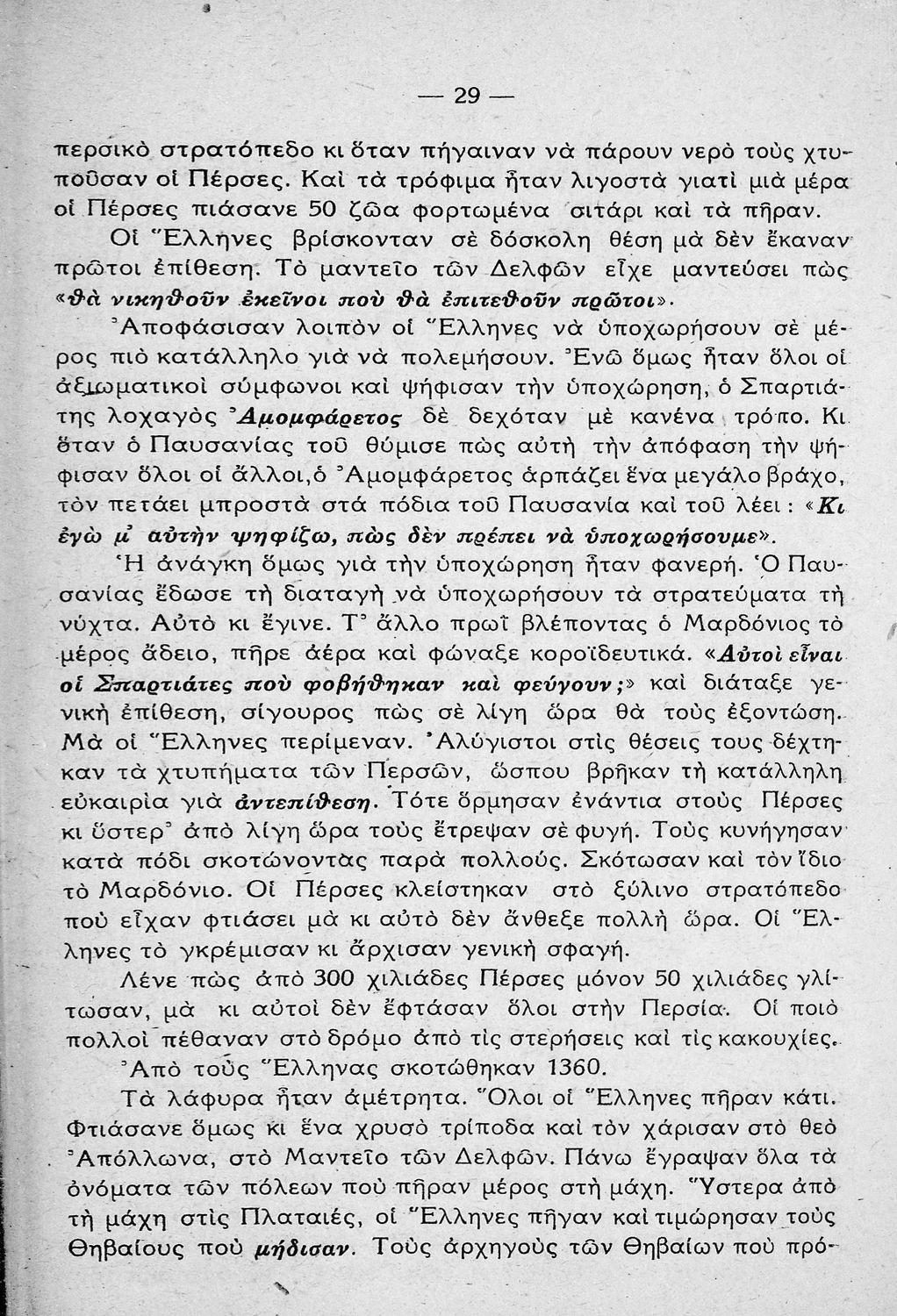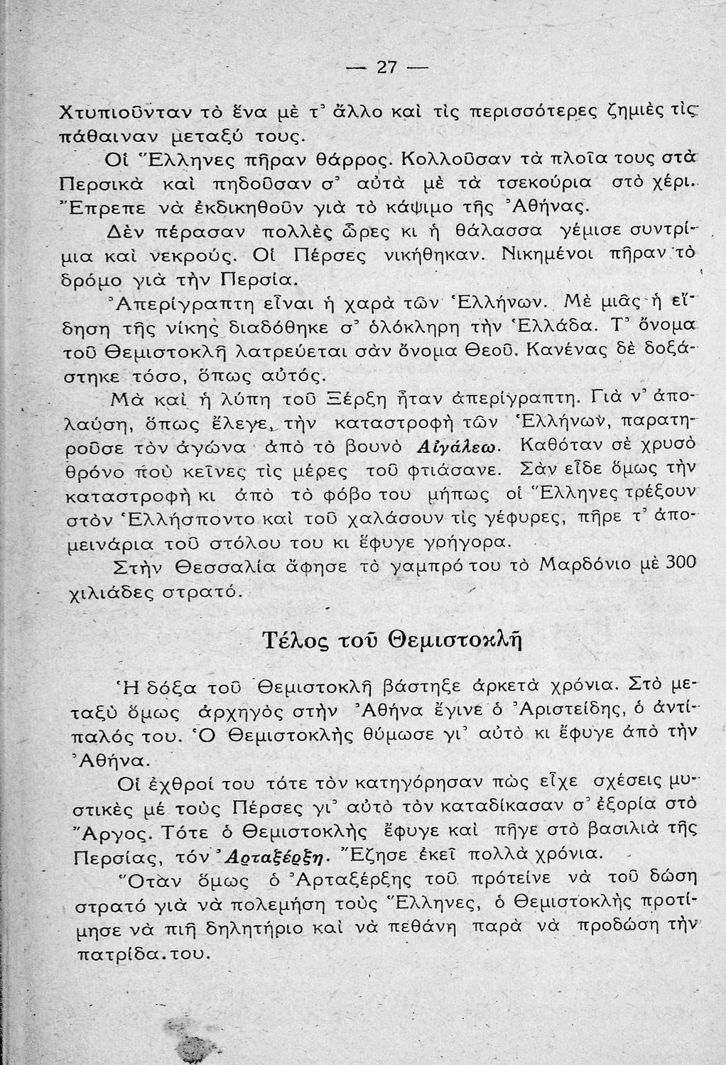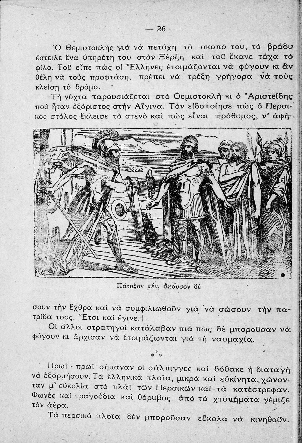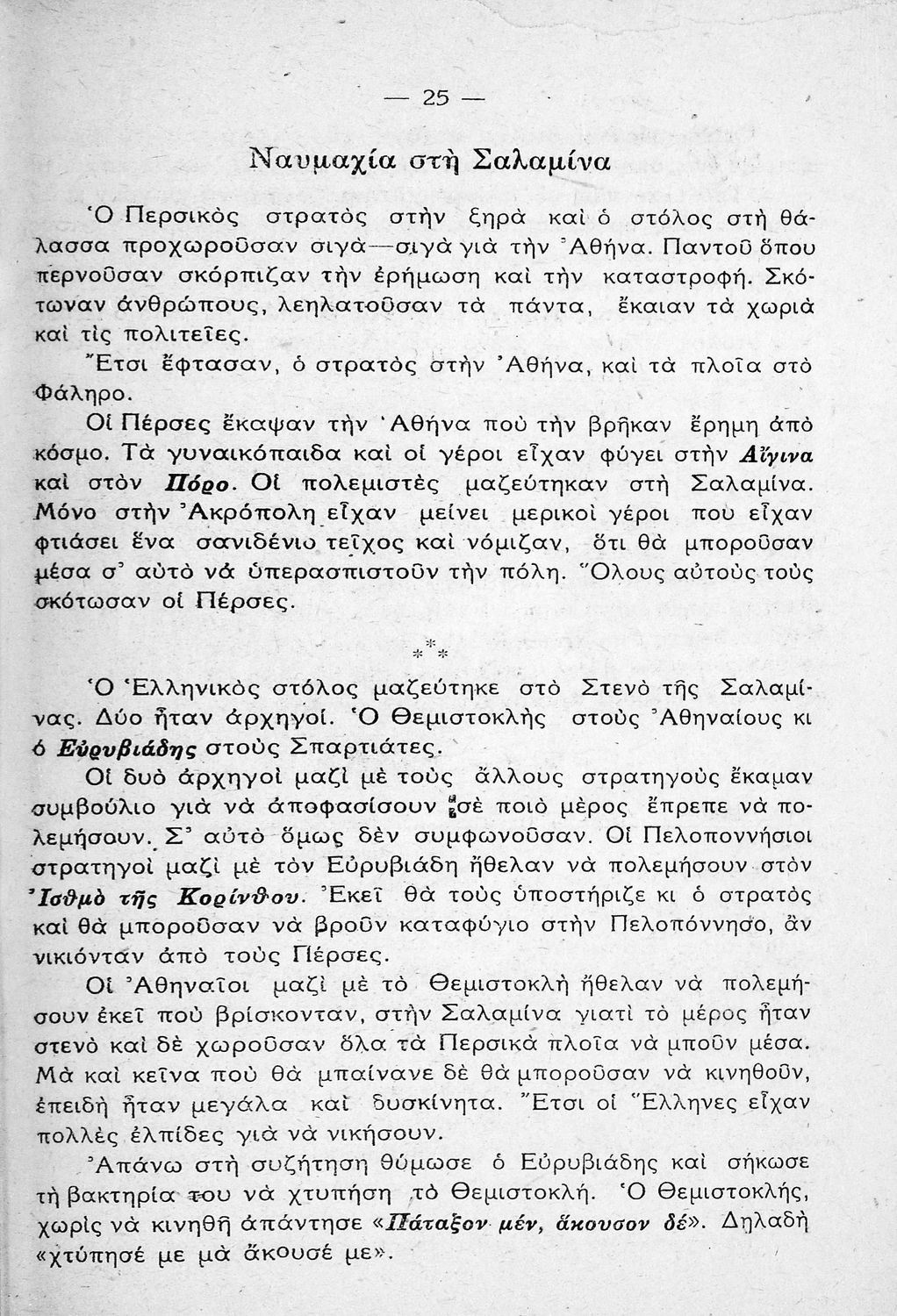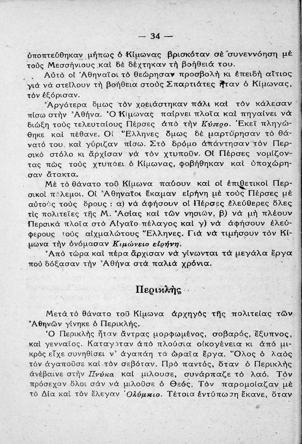 Βαθμίδα εκπαίδευσης: Πρωτοβάθμια Τάξη: Δ' Δημοτικού Μάθημα: Ιστορία Γλώσσα: Απλή καθαρεύουσα Παρουσίαση περιεχομένου: Μαθητικό βοήθημα Δ΄ Δημοτικού που καλύπτει την περίοδο από την κάθοδο των Δωριέων ως την κατάληψη της Ελλάδας από τους Ρωμαίους. Αποσκοπεί στην καλλιέργεια της εθνικής συνείδησης και της ιστορικής συνέχειας σύμφωνα με το κυρίαρχο εθνικό αφήγημα. |