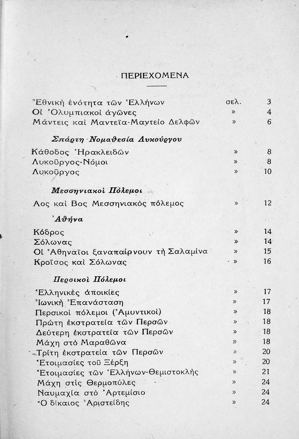Βαθμίδα εκπαίδευσης: Πρωτοβάθμια Τάξη: Δ' Δημοτικού Μάθημα: Ιστορία Γλώσσα: Απλή καθαρεύουσα Παρουσίαση περιεχομένου: Μαθητικό βοήθημα Δ΄ Δημοτικού που καλύπτει την περίοδο από την κάθοδο των Δωριέων ως την κατάληψη της Ελλάδας από τους Ρωμαίους. Αποσκοπεί στην καλλιέργεια της εθνικής συνείδησης και της ιστορικής συνέχειας σύμφωνα με το κυρίαρχο εθνικό αφήγημα. |