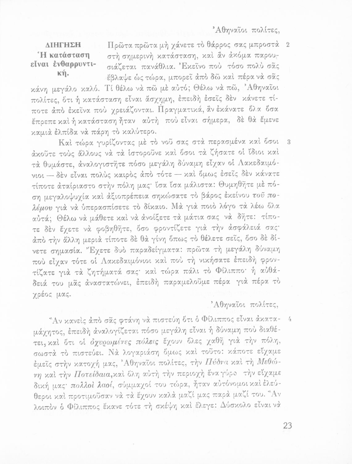 Σχολικό εγχειρίδιο Αρχαίων Ελληνικών Δ΄ Γυμνασίου που περιλαμβάνει τους Ολυνθιακούς Α΄ και Β΄ και τους Φιλιππικούς Α΄ και Β' του Δημοσθένη, εισαγωγή και ερμηνευτικά σχόλια.