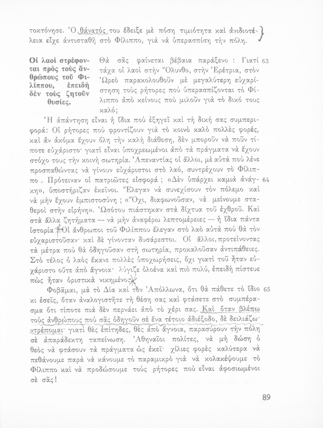 Μαθητικό βοήθημα Αρχαίων Ελληνικών Ε΄ Γυμνασίου που περιέχει τους Λόγους του Δημοσθένη Α΄ και Β΄ Ολυνθιακός μετάφραση, και ερμηνευτικά, γραμματικά και πραγματολογικά σχόλια.