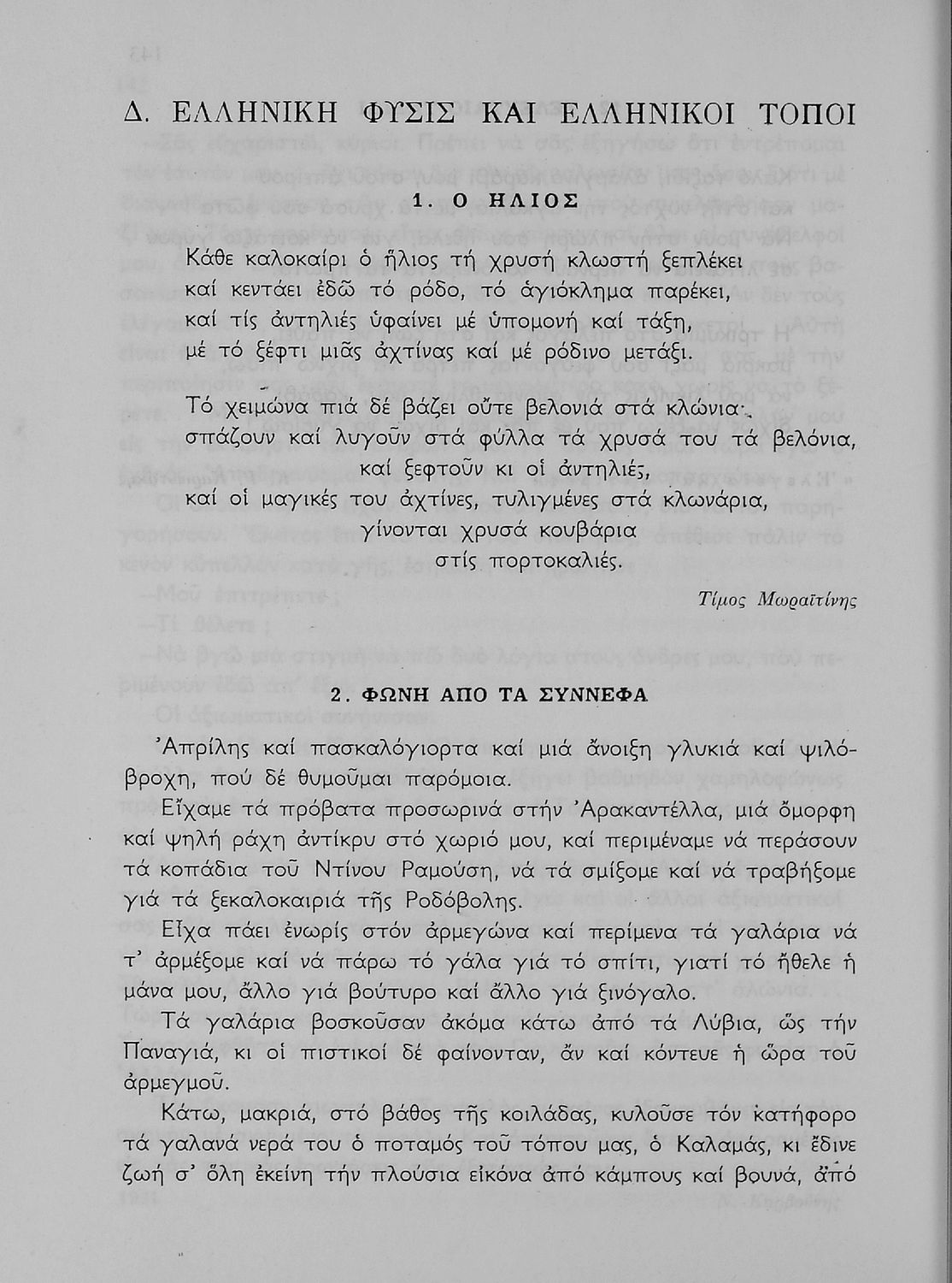 Σχολικό εγχειρίδιο Νέων Ελληνικών Α΄ Λυκείου που περιέχει ποιήματα και πεζά Ελλήνων συγγραφέων εμπνευσμένα από την θρησκευτική, εθνική και κοινωνική ζωή, την ελληνική φύση και τους ανθρώπινους χαρακτήρες. Περιέχει παράρτημα με βιογραφίες των συγγραφέων και λεξιλόγιο.