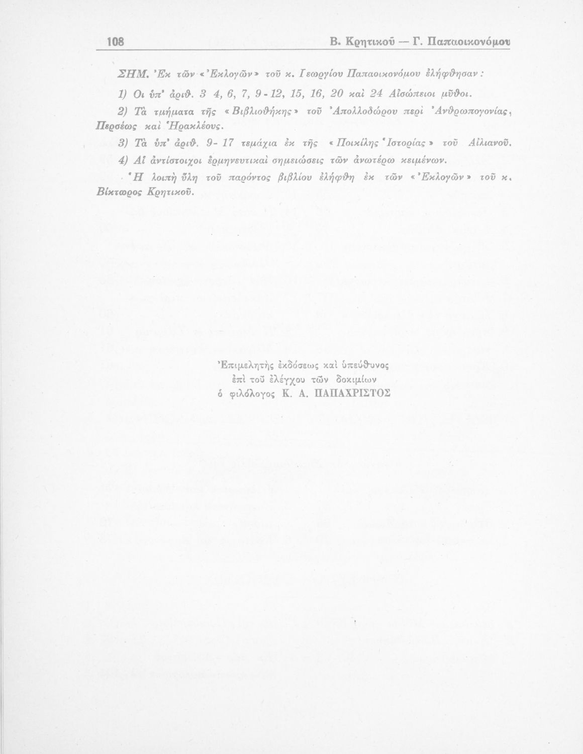 Συγγραφέας: Βικ. Κρητικός, Γεωργ Παπαοικονόμου, Κ. Α Παπαχρίστος (σχόλια)