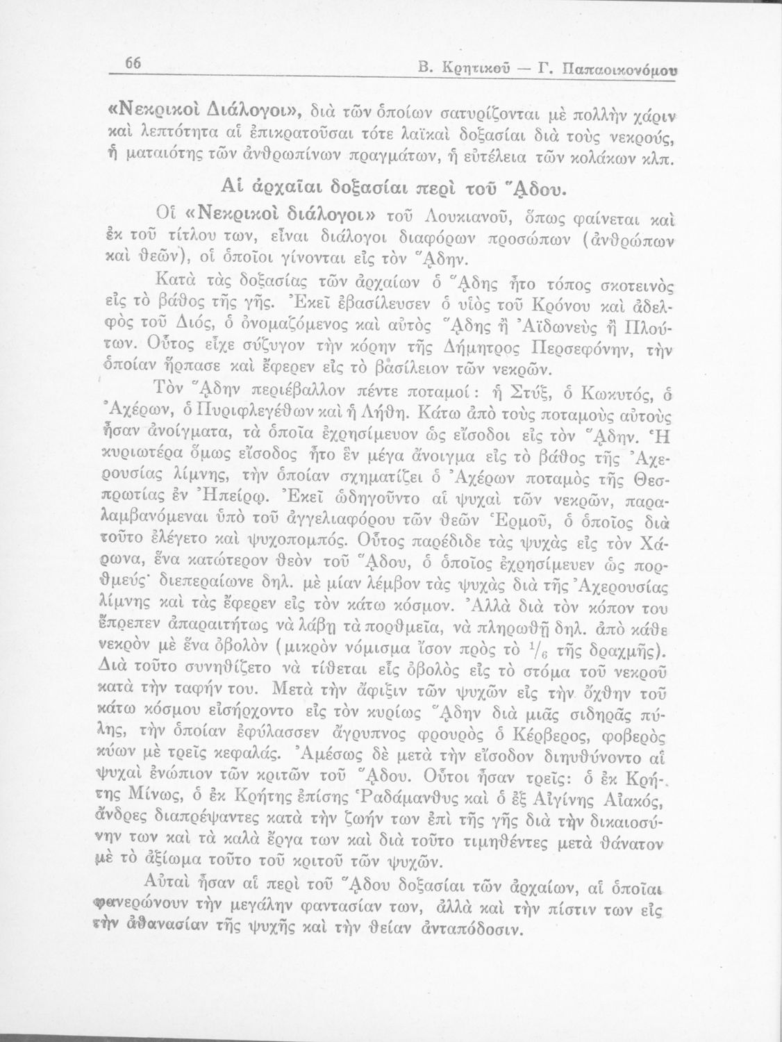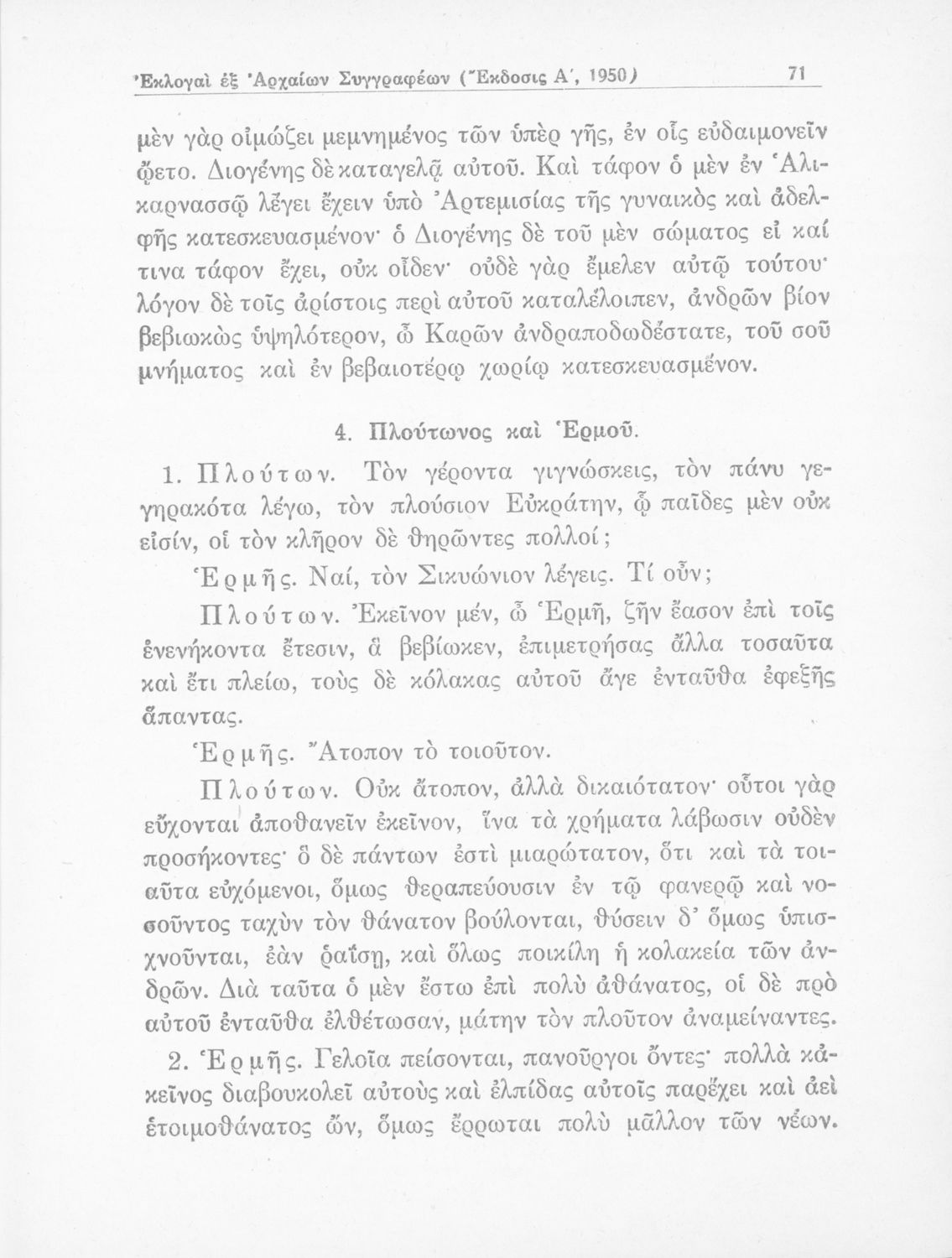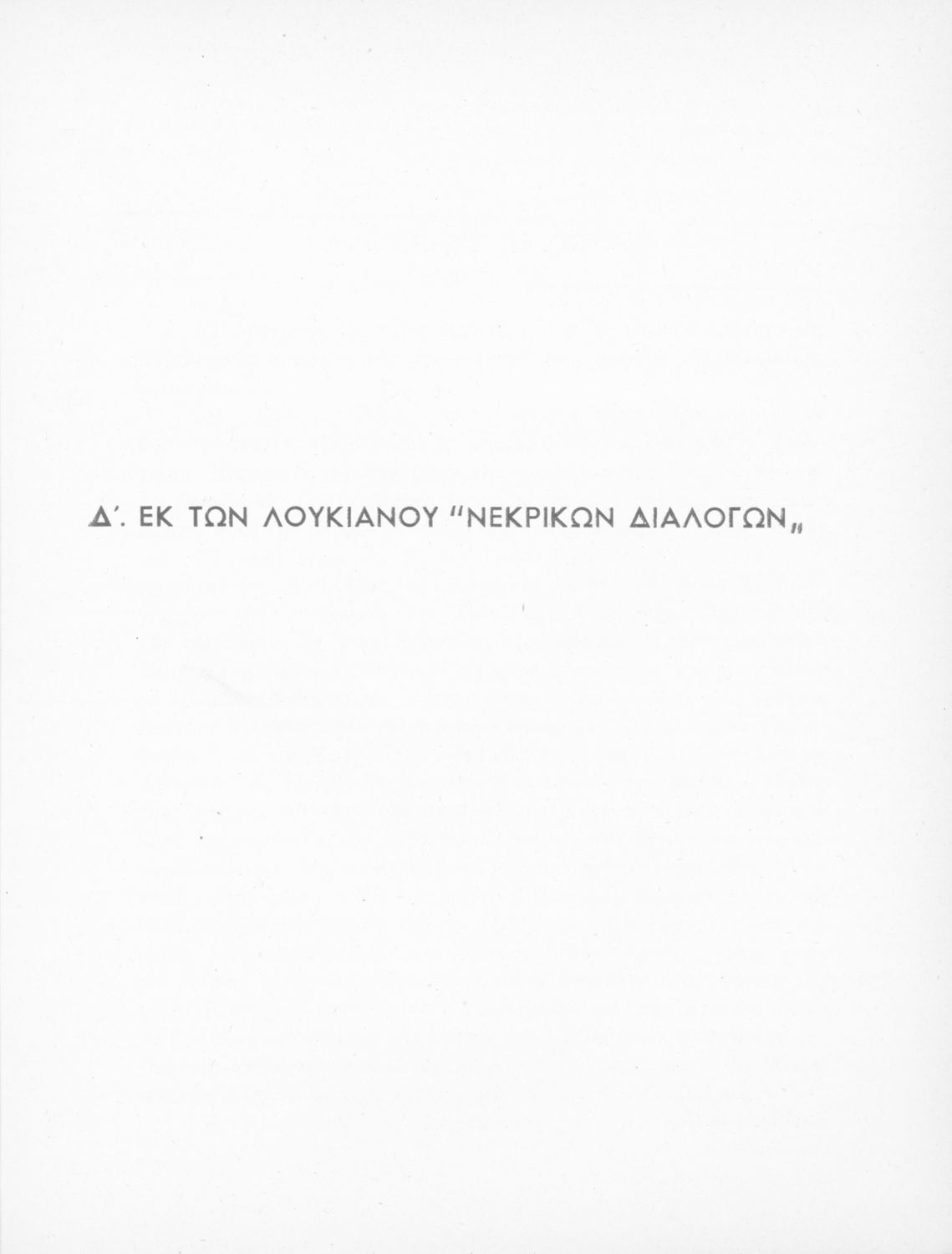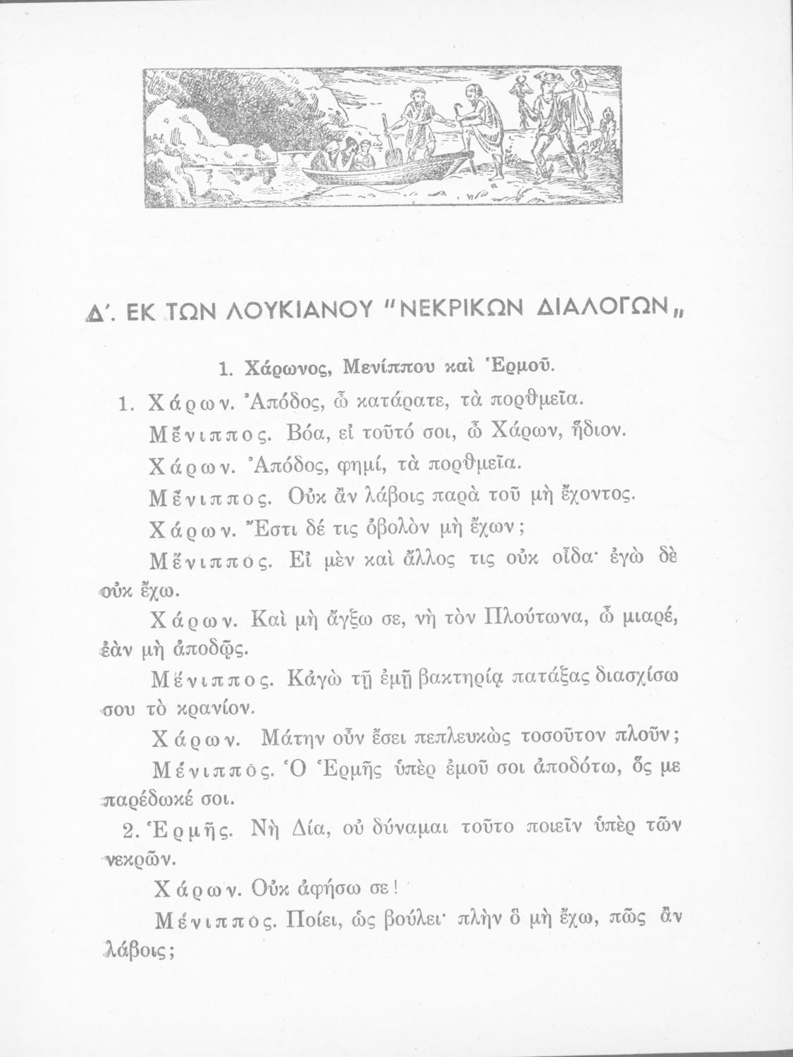 Σχολικό εγχειρίδιο Αρχαίων Ελληνικών για την Α΄ τάξη των Ημιγυμνασίων και Εξαταξίων Γυμνασίων που περιέχει αποσπάσματα από τους Νεκρικούς Διαλόγους του Λουκιανού και ετυμολογικές και πραγματολογικές σημειώσεις.
