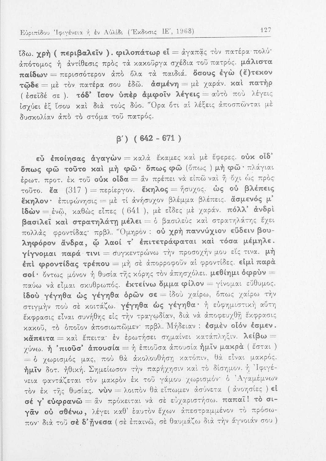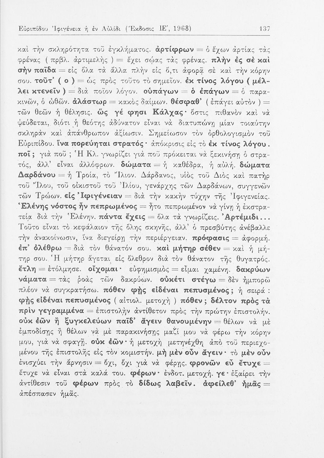 Σχολικό εγχειρίδιο Αρχαίων Ελληνικών Ε΄ Γυμνασίου που περιέχει τις τραγωδίες του Ευριπίδη Ιφιγένεια η εν Αυλίδι και Ιφιγένεια η εν Ταύροις, εισαγωγή στα έργα και ερμηνευτικά και ετυμολογικά σχόλια. Περιέχει και παράρτημα με εικόνες. Φέρει το σύμβολο της δικτατορίας.
