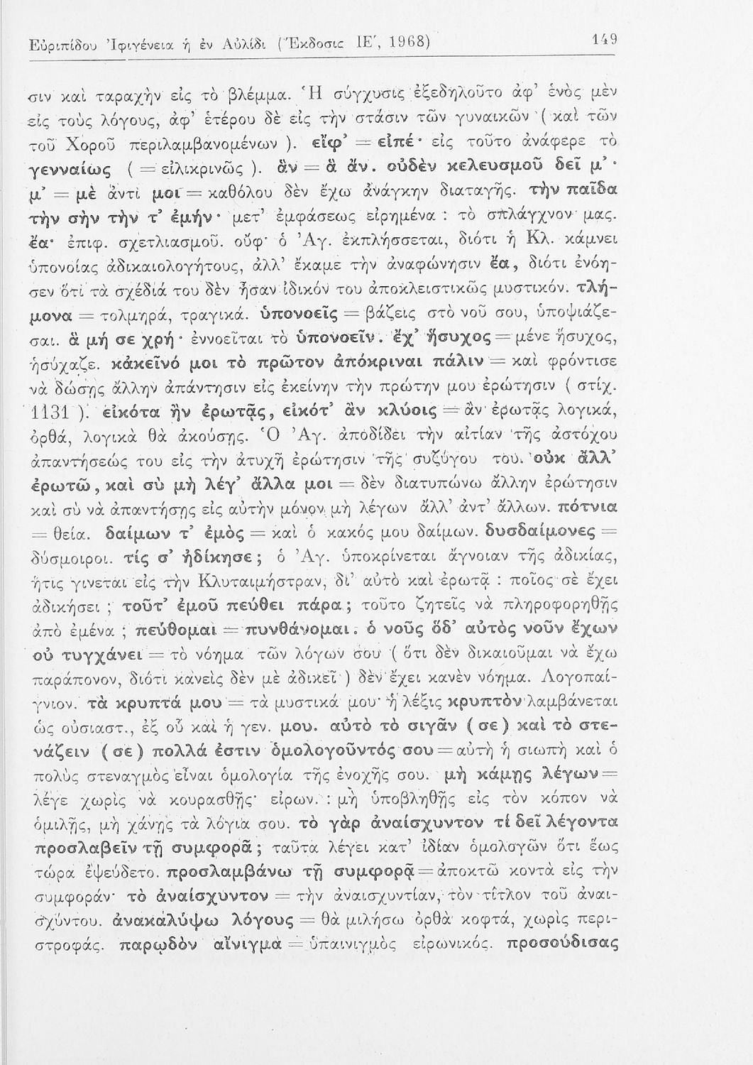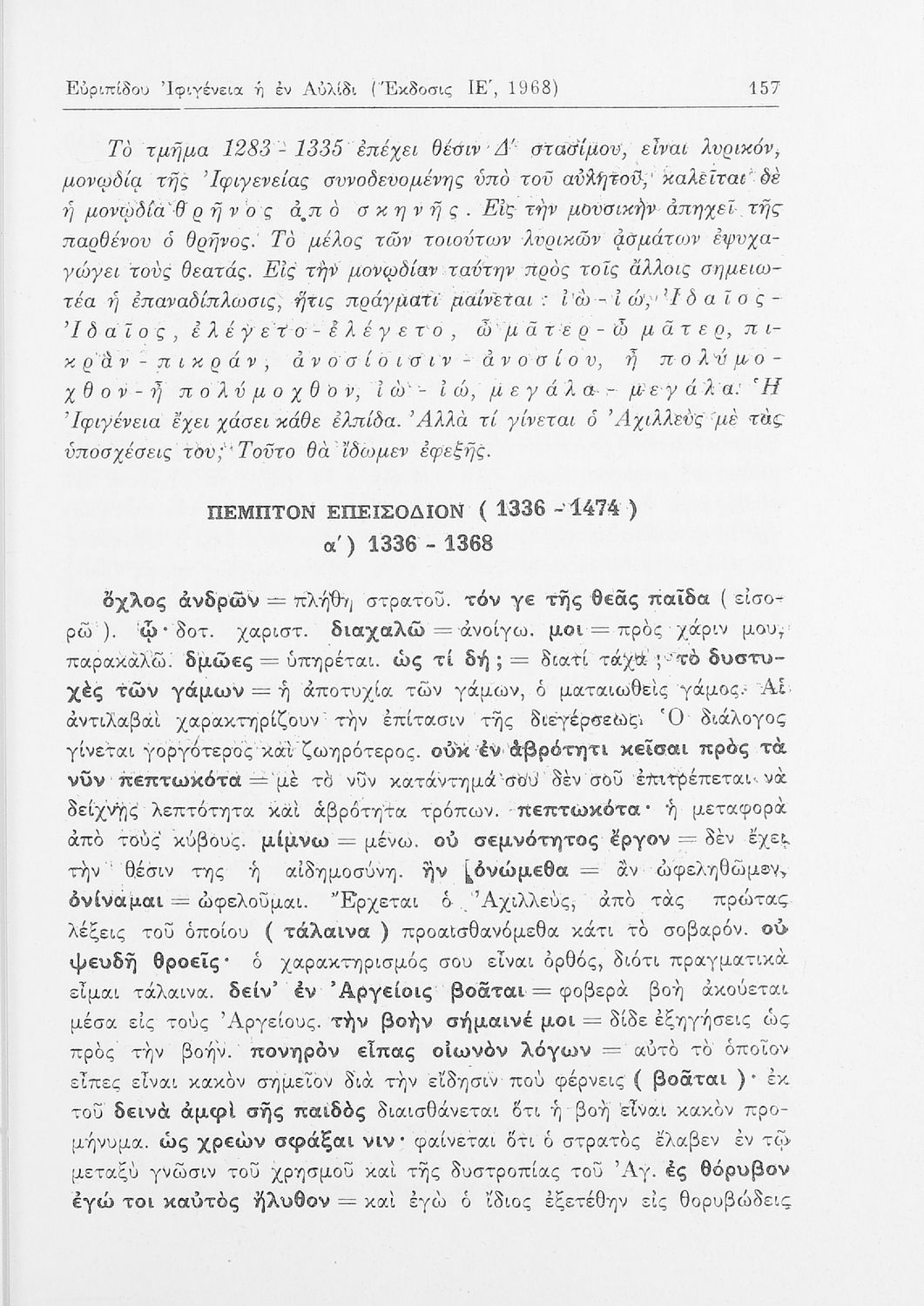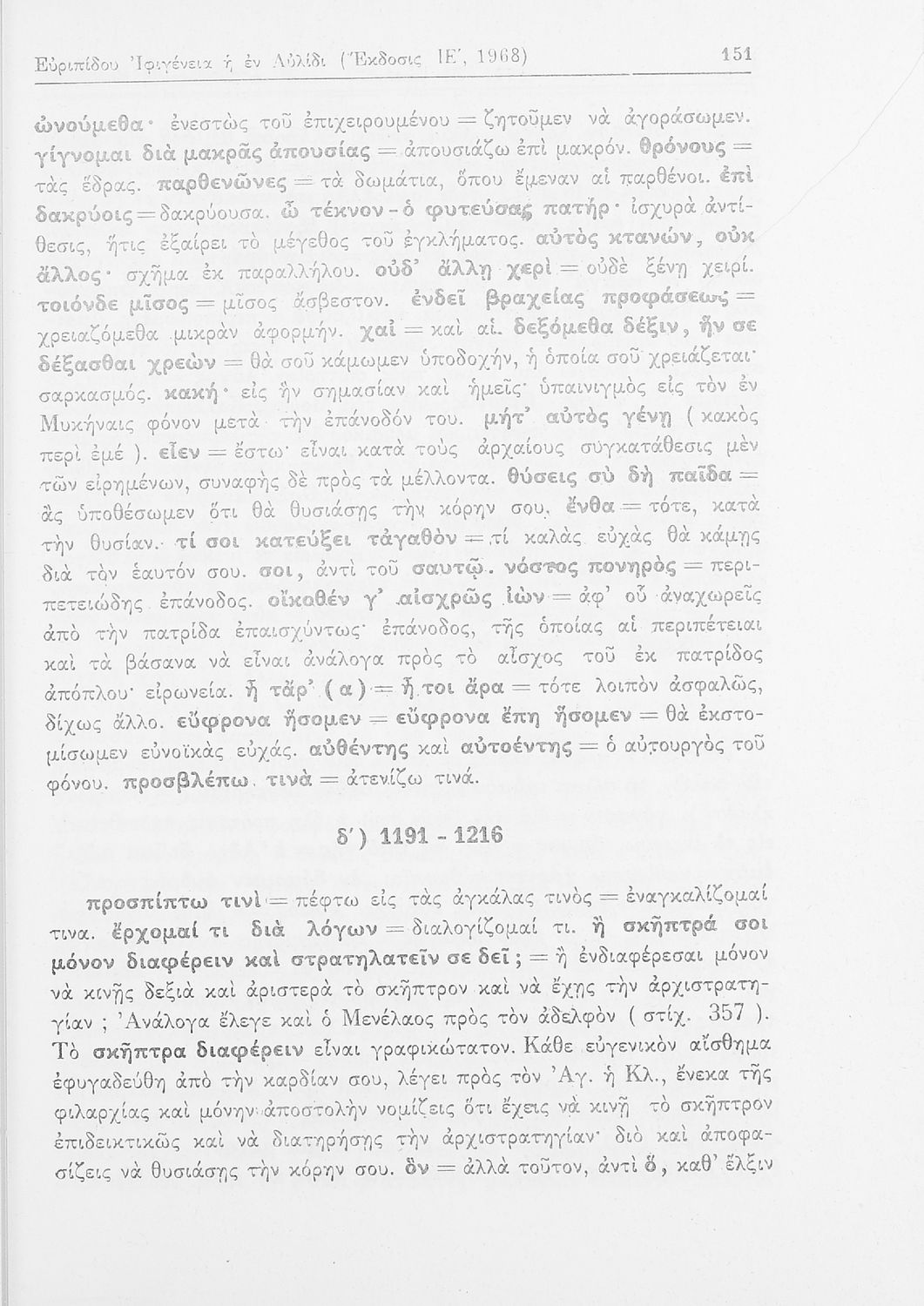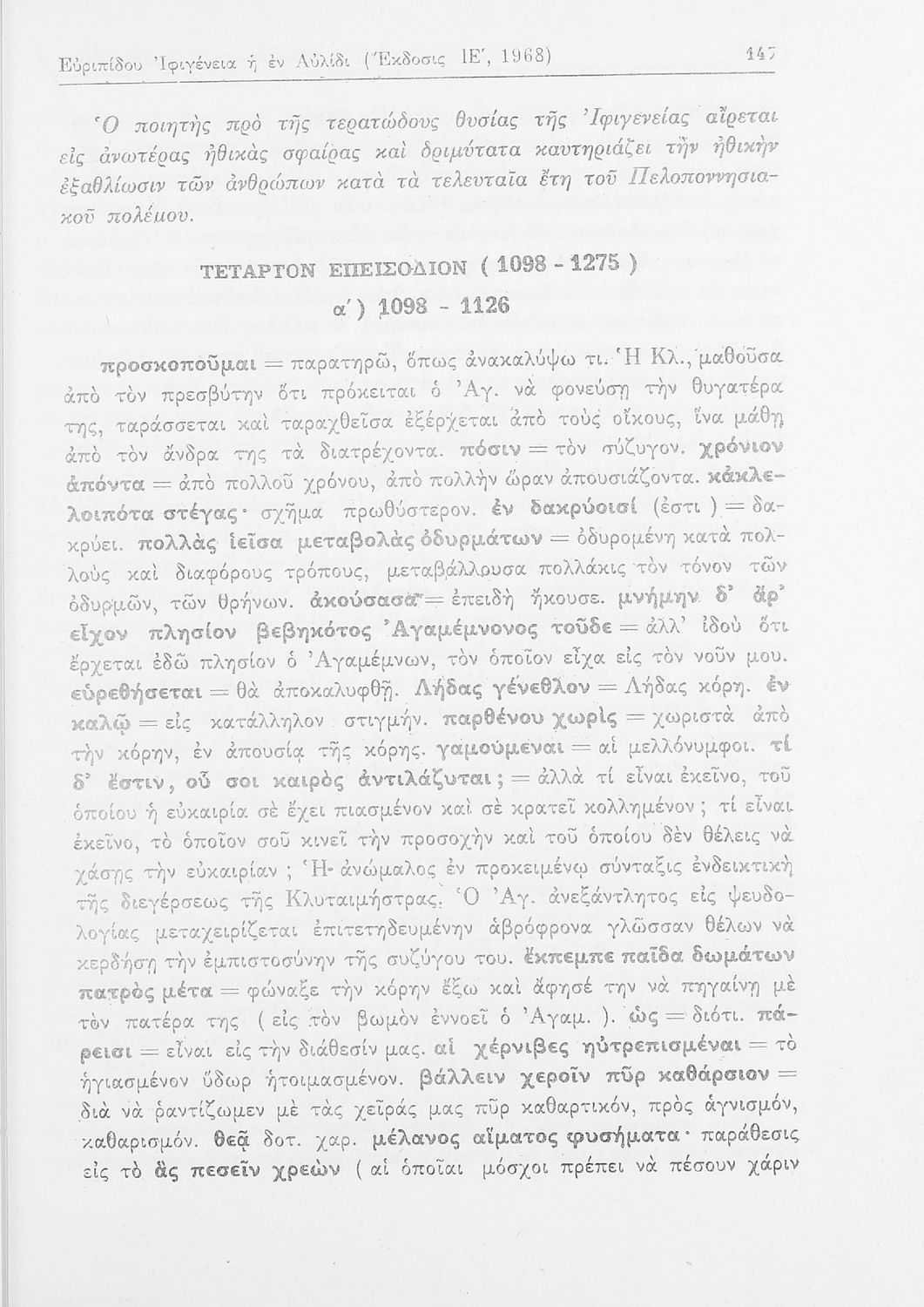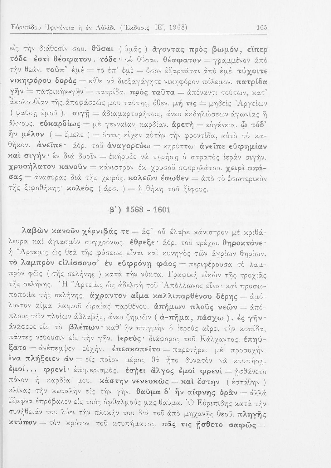Σχολικό εγχειρίδιο Αρχαίων Ελληνικών Ε΄ Γυμνασίου που περιέχει τις τραγωδίες του Ευριπίδη Ιφιγένεια η εν Αυλίδι και Ιφιγένεια η εν Ταύροις, εισαγωγή στα έργα και ερμηνευτικά και ετυμολογικά σχόλια. Περιέχει και παράρτημα με εικόνες. Φέρει το σύμβολο της δικτατορίας.