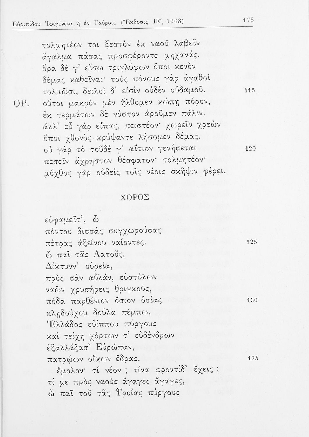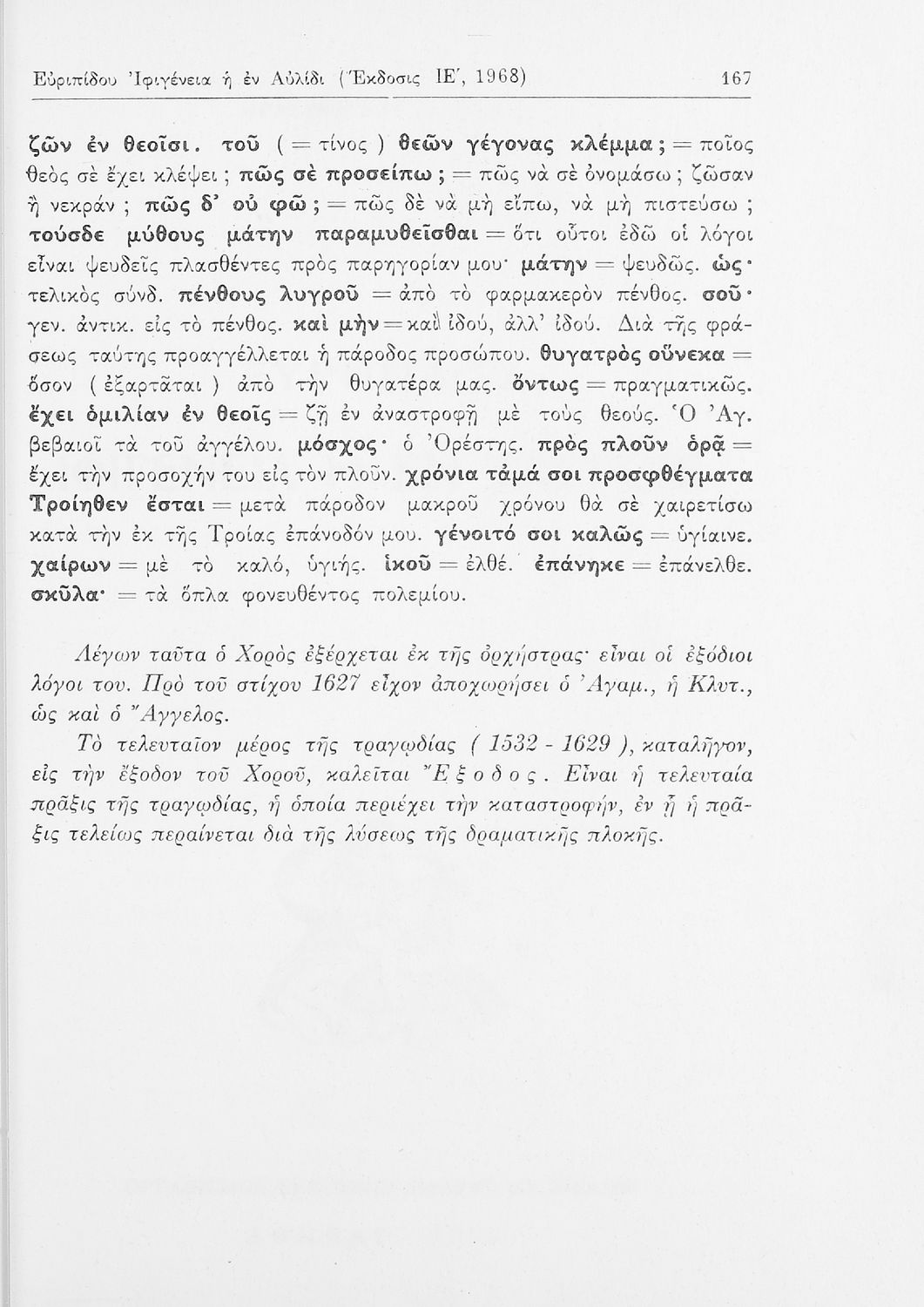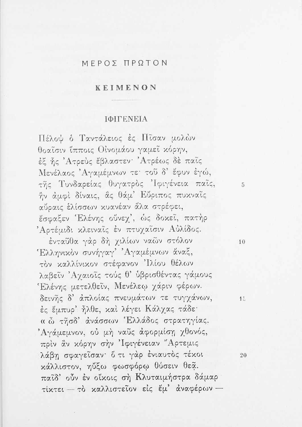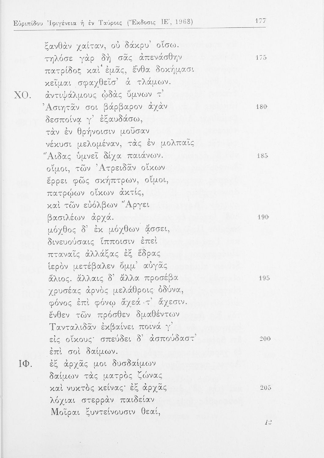 Σχολικό εγχειρίδιο Αρχαίων Ελληνικών Ε΄ Γυμνασίου που περιέχει τις τραγωδίες του Ευριπίδη Ιφιγένεια η εν Αυλίδι και Ιφιγένεια η εν Ταύροις, εισαγωγή στα έργα και ερμηνευτικά και ετυμολογικά σχόλια. Περιέχει και παράρτημα με εικόνες. Φέρει το σύμβολο της δικτατορίας.