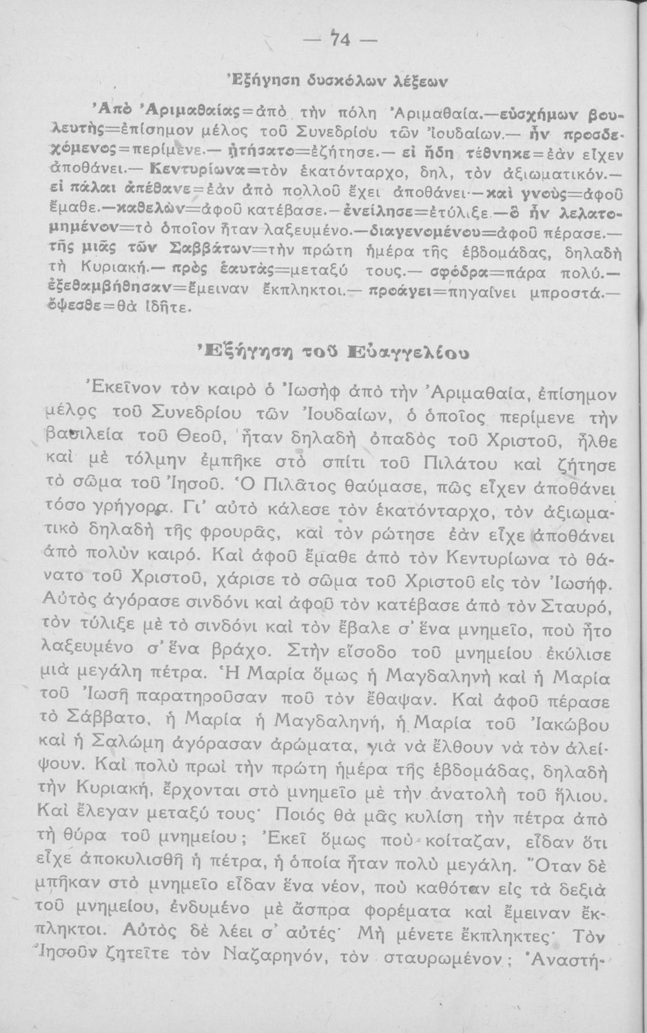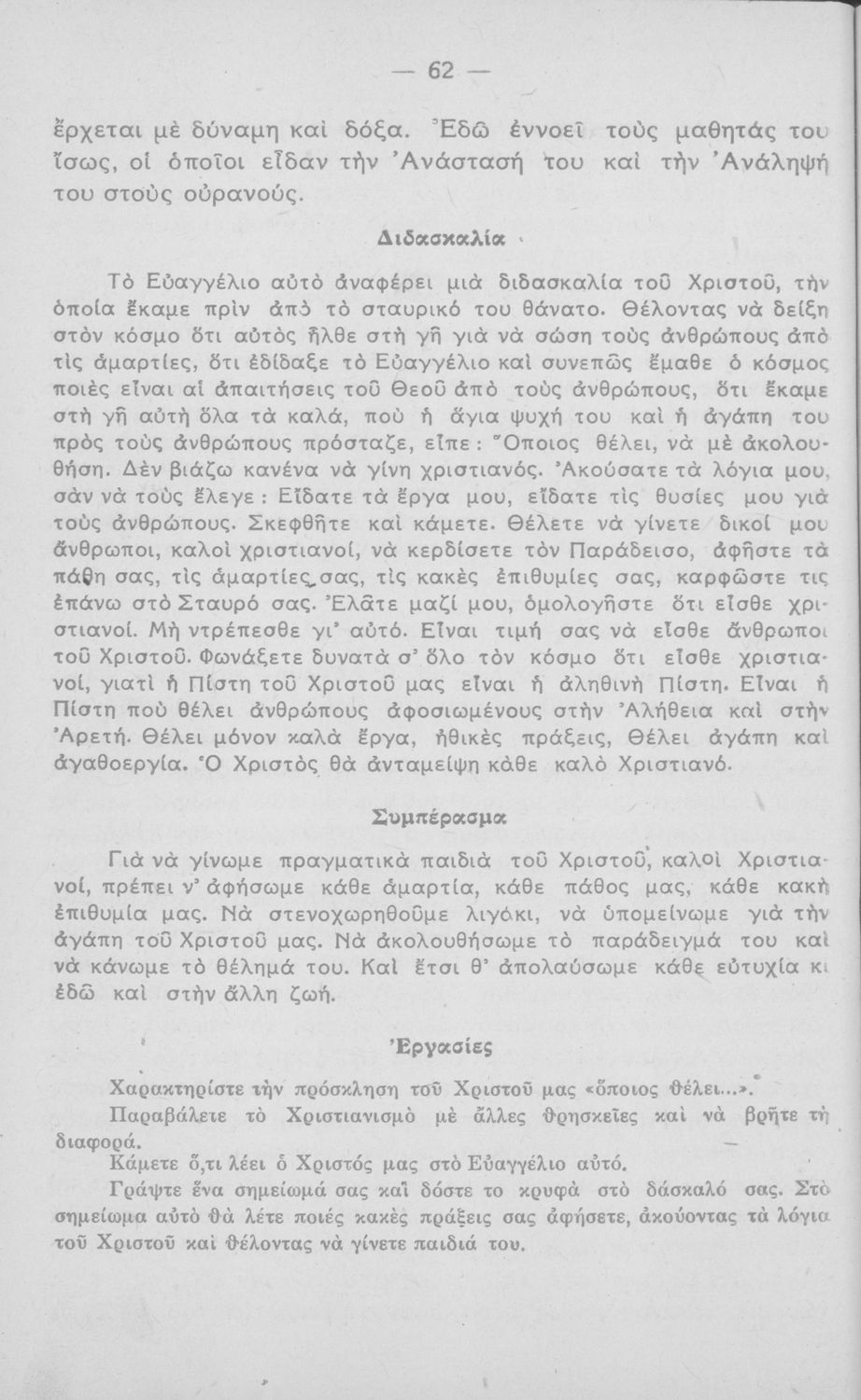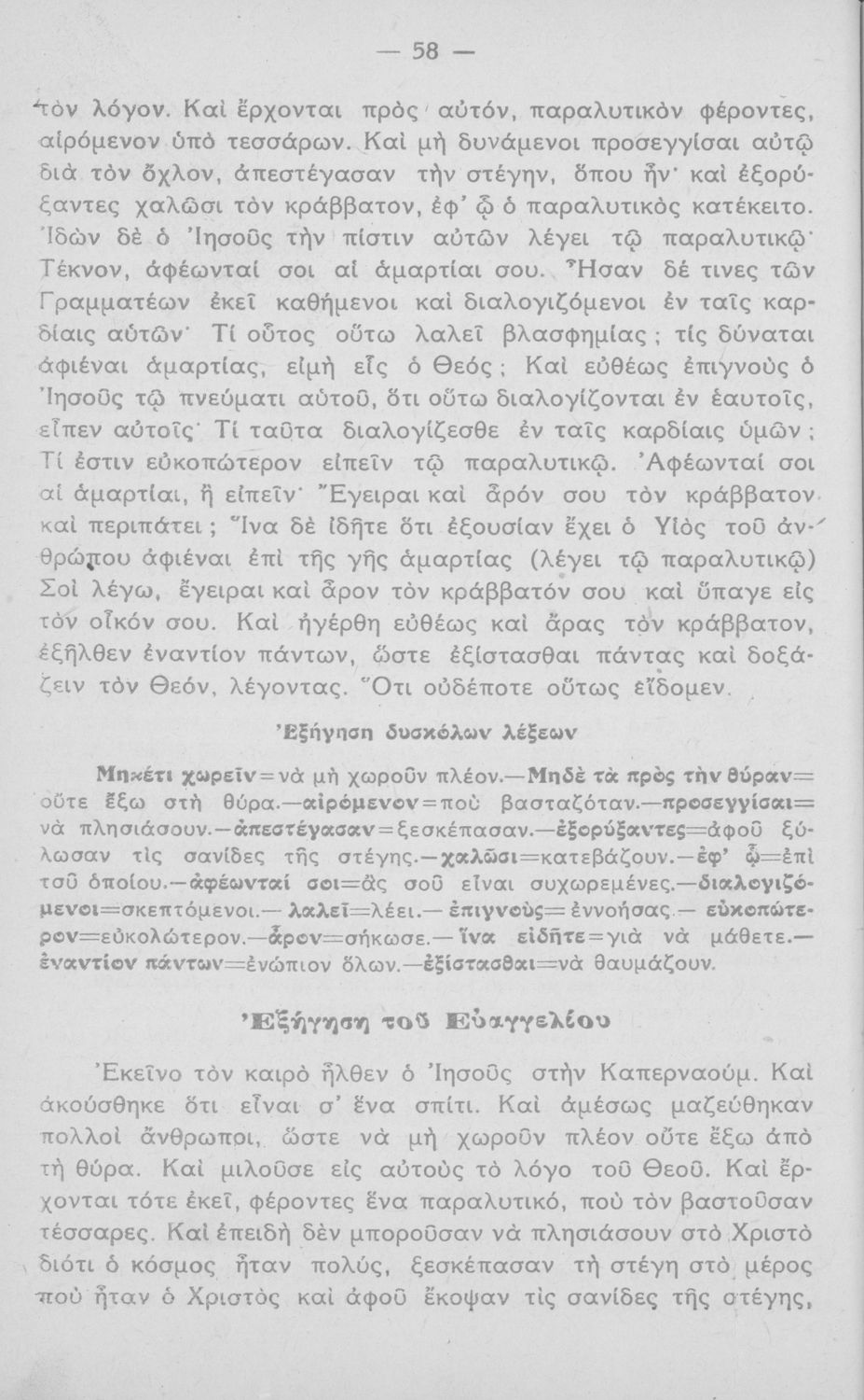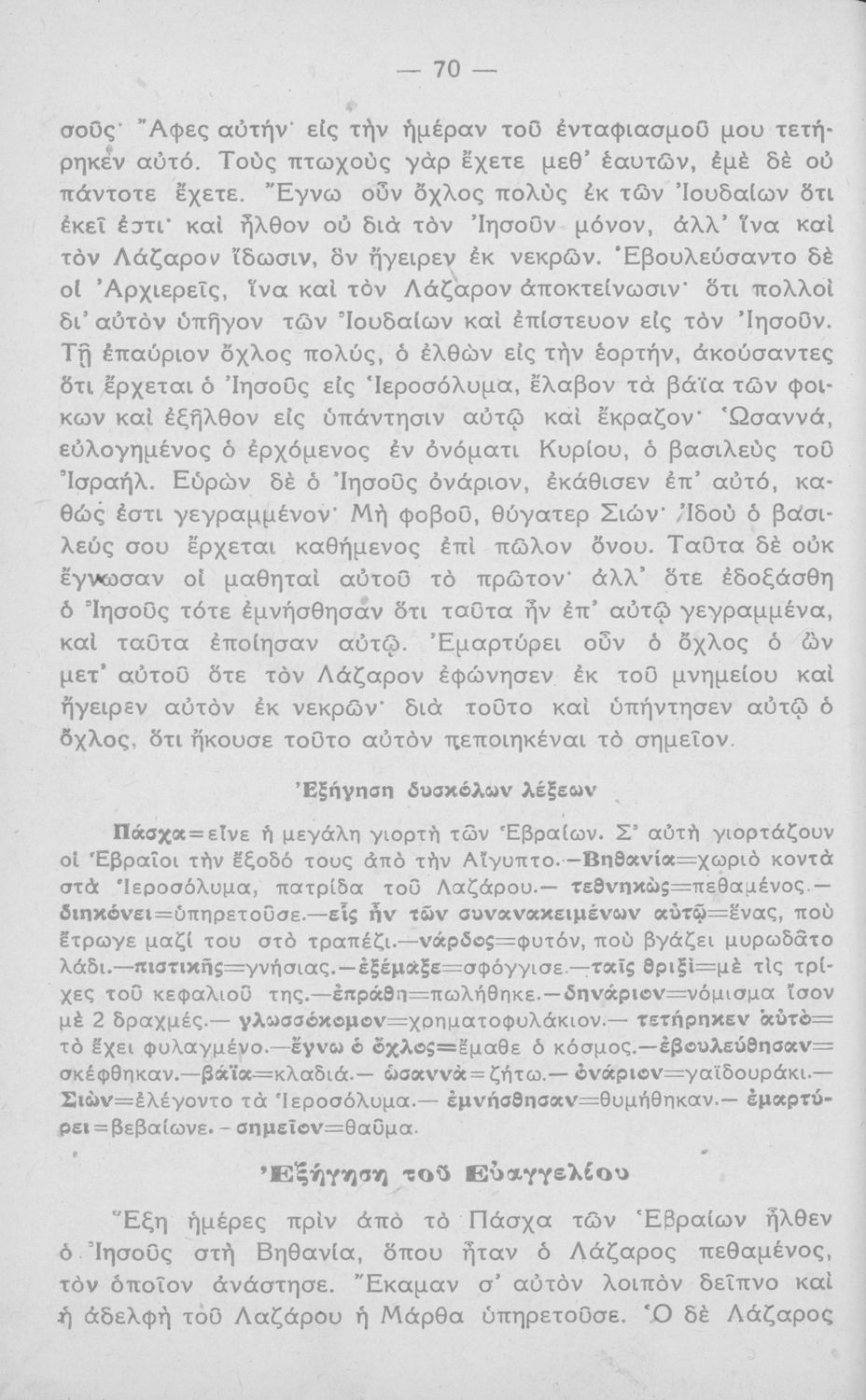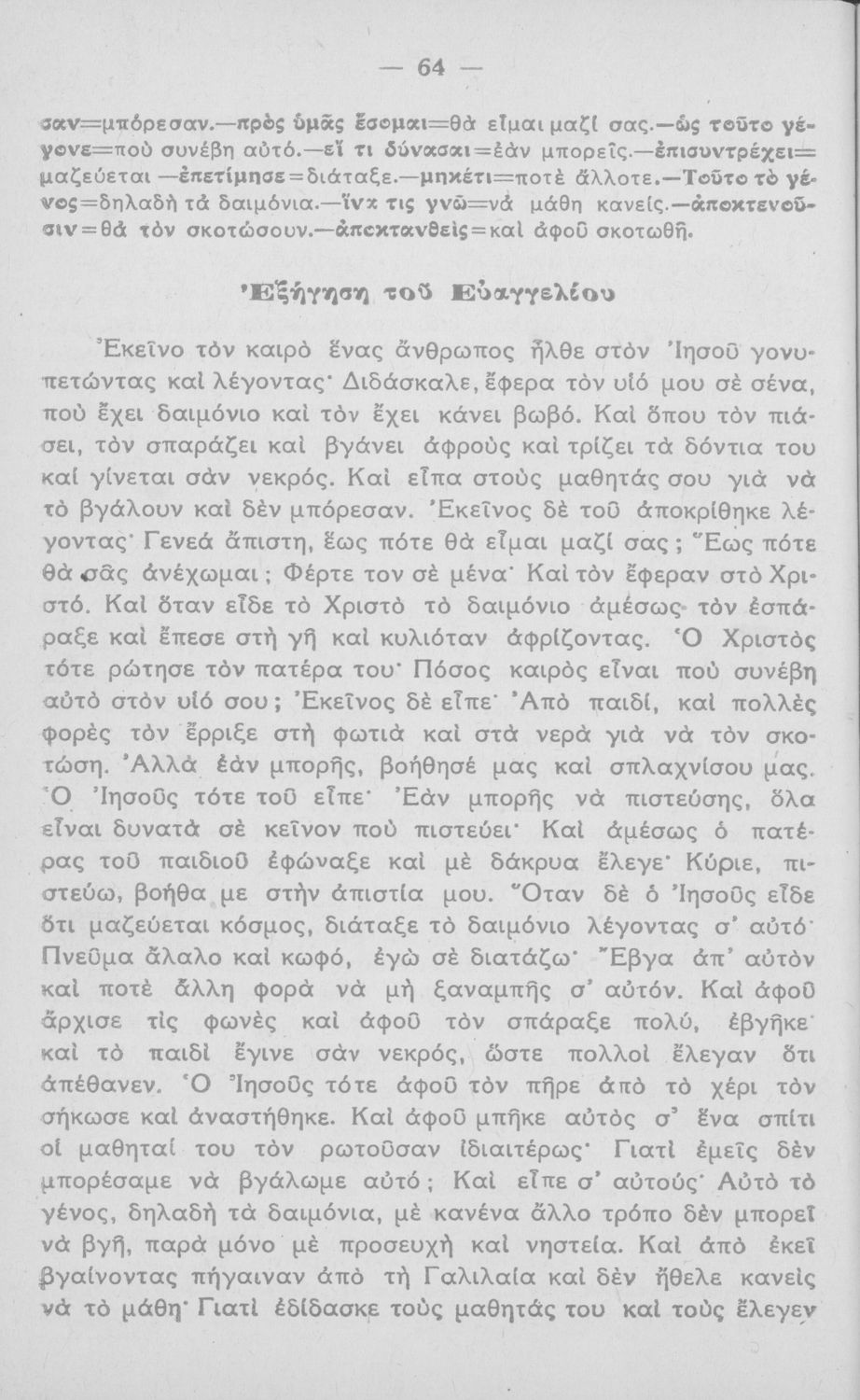 Το σύγγραμμα ήταν μαθητικό βοήθημα για το μάθημα των Θρησκευτικών. Περιέχει κείμενο, σχόλια των Ευαγγελίων