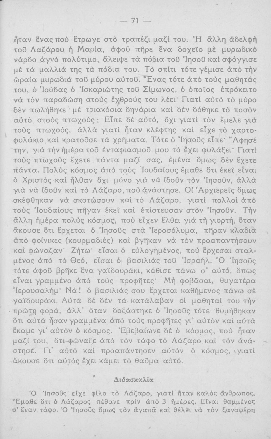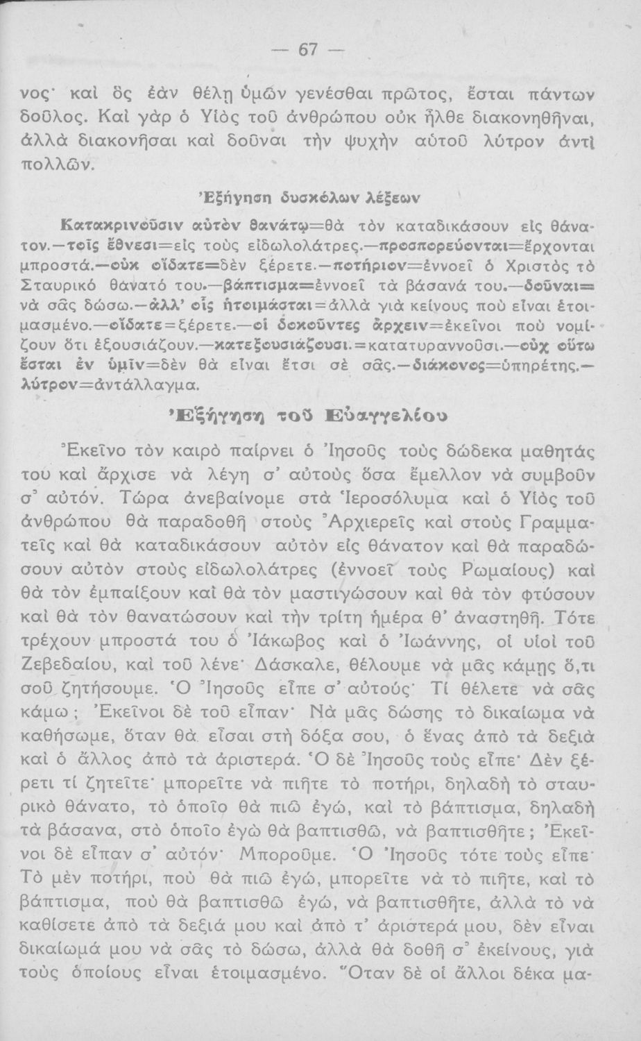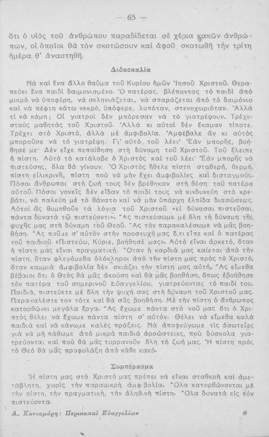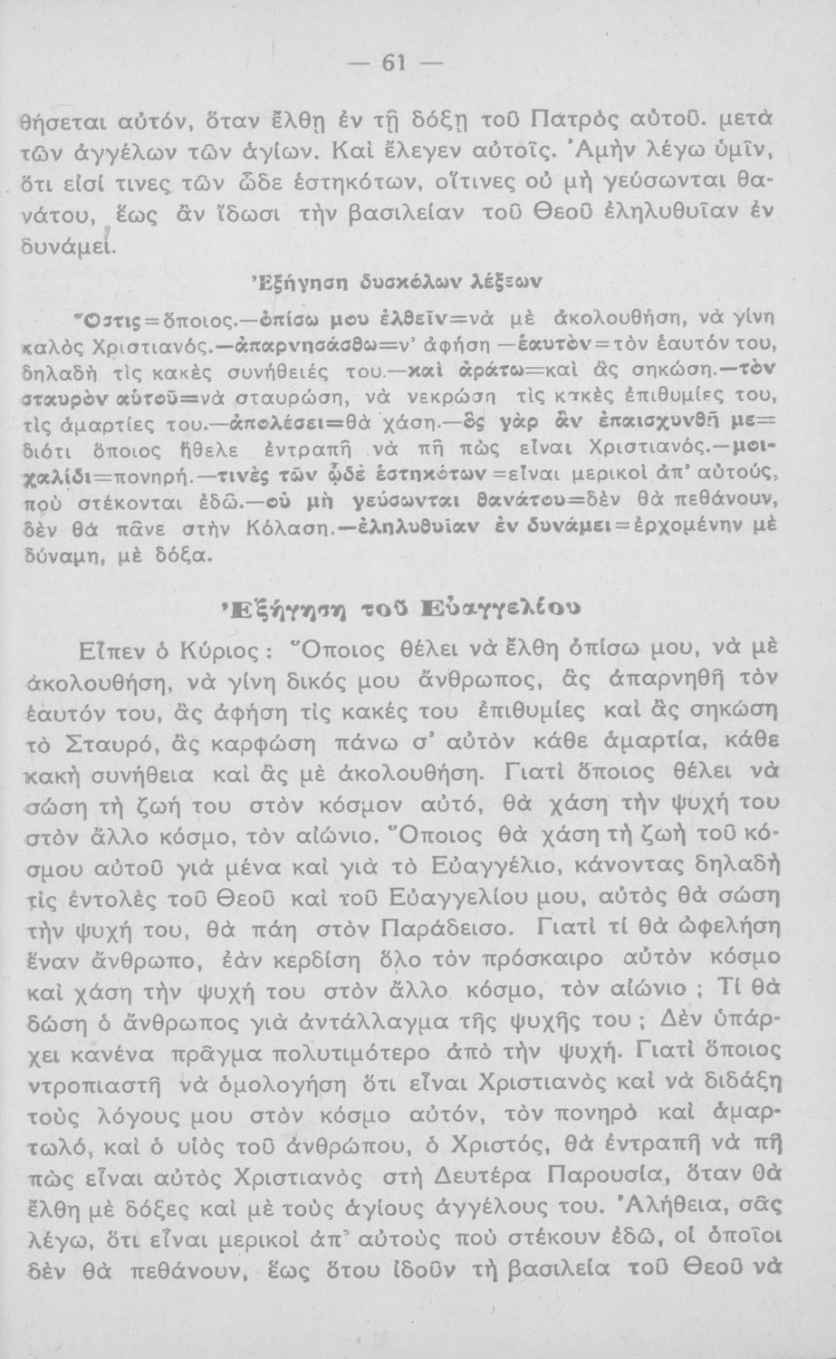 Το σύγγραμμα ήταν μαθητικό βοήθημα για το μάθημα των Θρησκευτικών. Περιέχει κείμενο, σχόλια των Ευαγγελίων