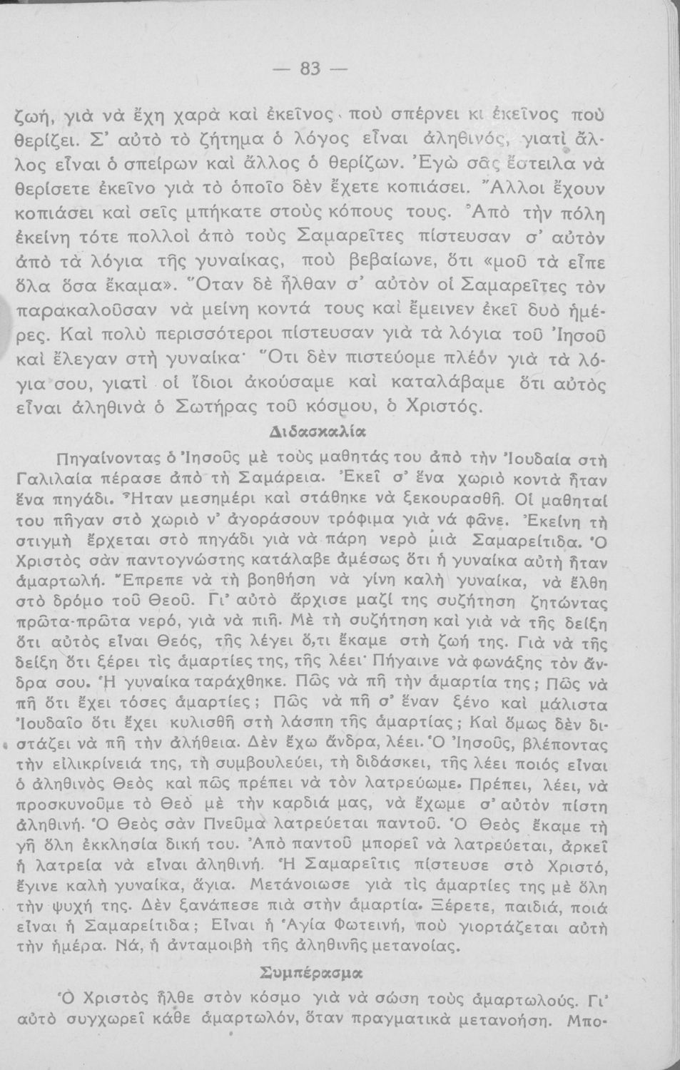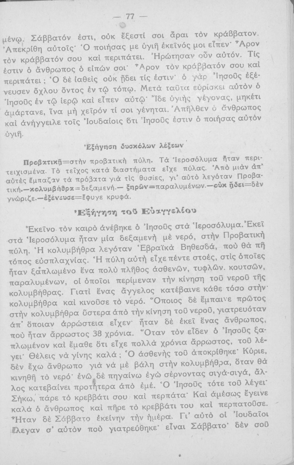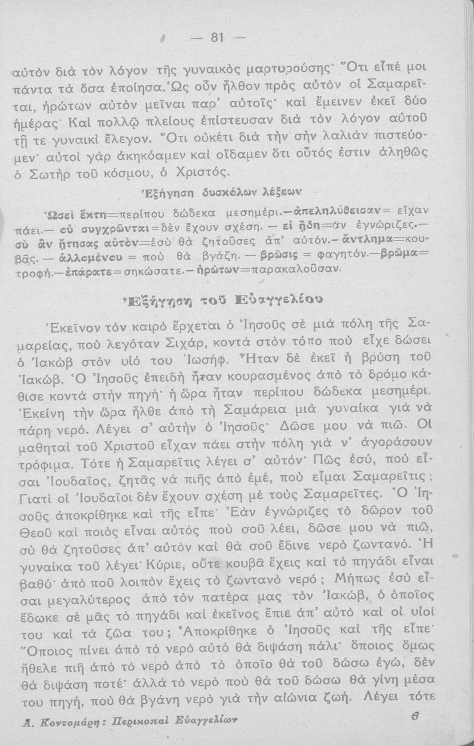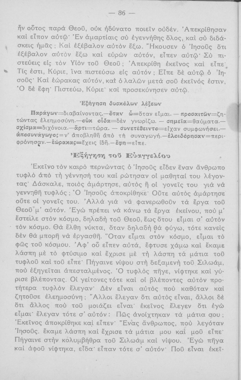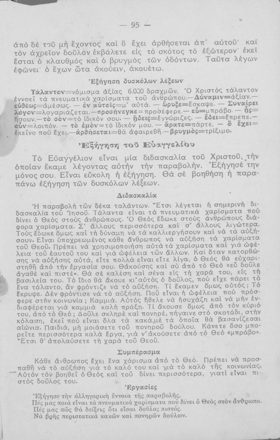 Το σύγγραμμα ήταν μαθητικό βοήθημα για το μάθημα των Θρησκευτικών. Περιέχει κείμενο, σχόλια των Ευαγγελίων