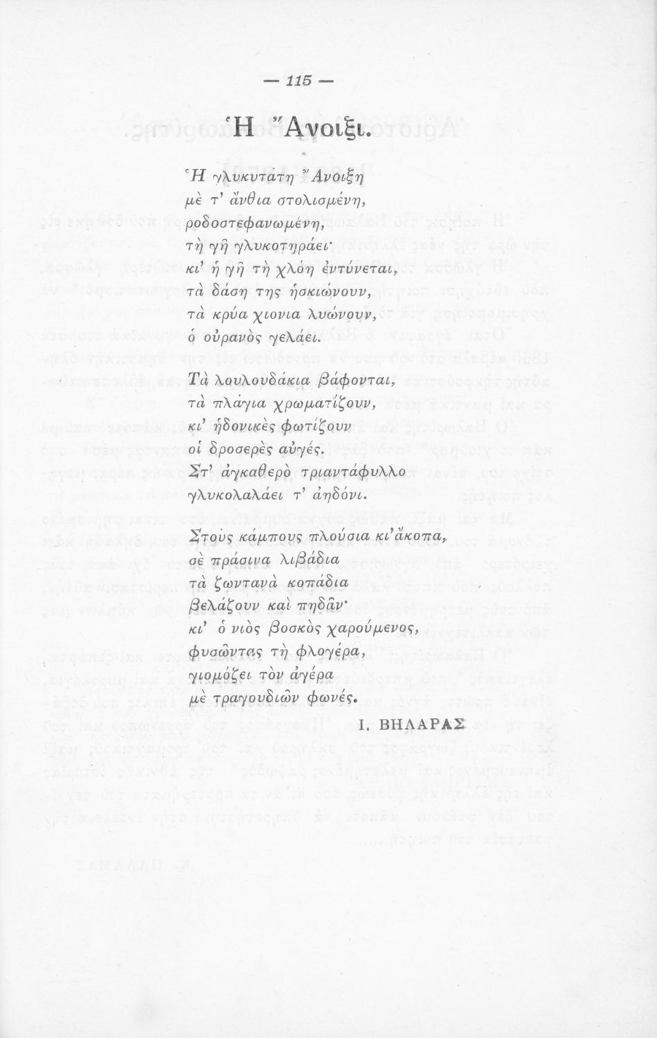 Σχολικό εγχειρίδιο Νέων Ελληνικών του 1889. Περιέχει πεζά και ποιήματα Ελλήνων λογοτεχνών εμπνευσμένα από την καθημερινή και ιστορική ζωή του τόπου. Έχει την έγκριση του Υπουργείου Δημόσιας Εκπαίδευσης.
