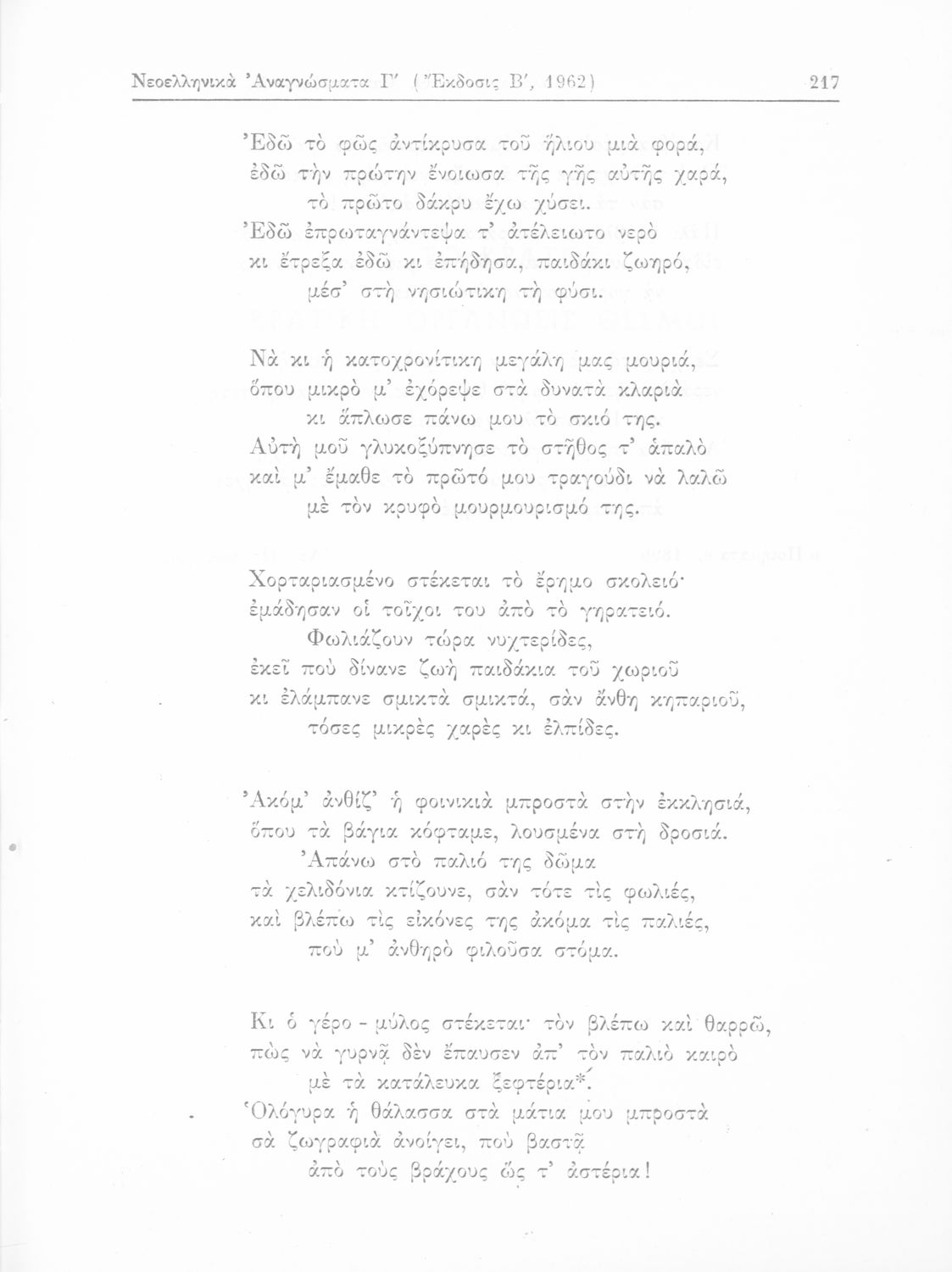 Σχολικό εγχειρίδιο Νέων Ελληνικών Δ΄ Γυμνασίου Θηλέων που περιλαμβάνει πεζά, ποιήματα και δημοτικά τραγούδια εμπνευσμένα από την σύγχρονη ελληνική ιστορία και την οικογενειακή και θρησκευτική ζωή. Περιέχει και