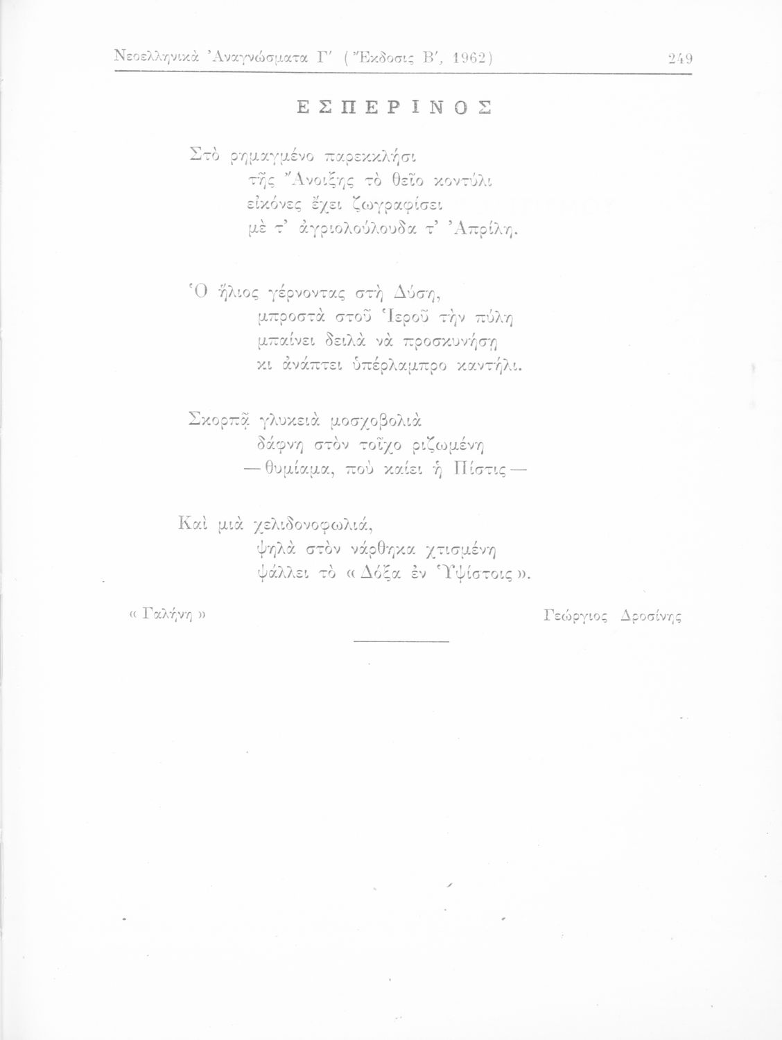 Σχολικό εγχειρίδιο Νέων Ελληνικών Δ΄ Γυμνασίου Θηλέων που περιλαμβάνει πεζά, ποιήματα και δημοτικά τραγούδια εμπνευσμένα από την σύγχρονη ελληνική ιστορία και την οικογενειακή και θρησκευτική ζωή. Περιέχει και