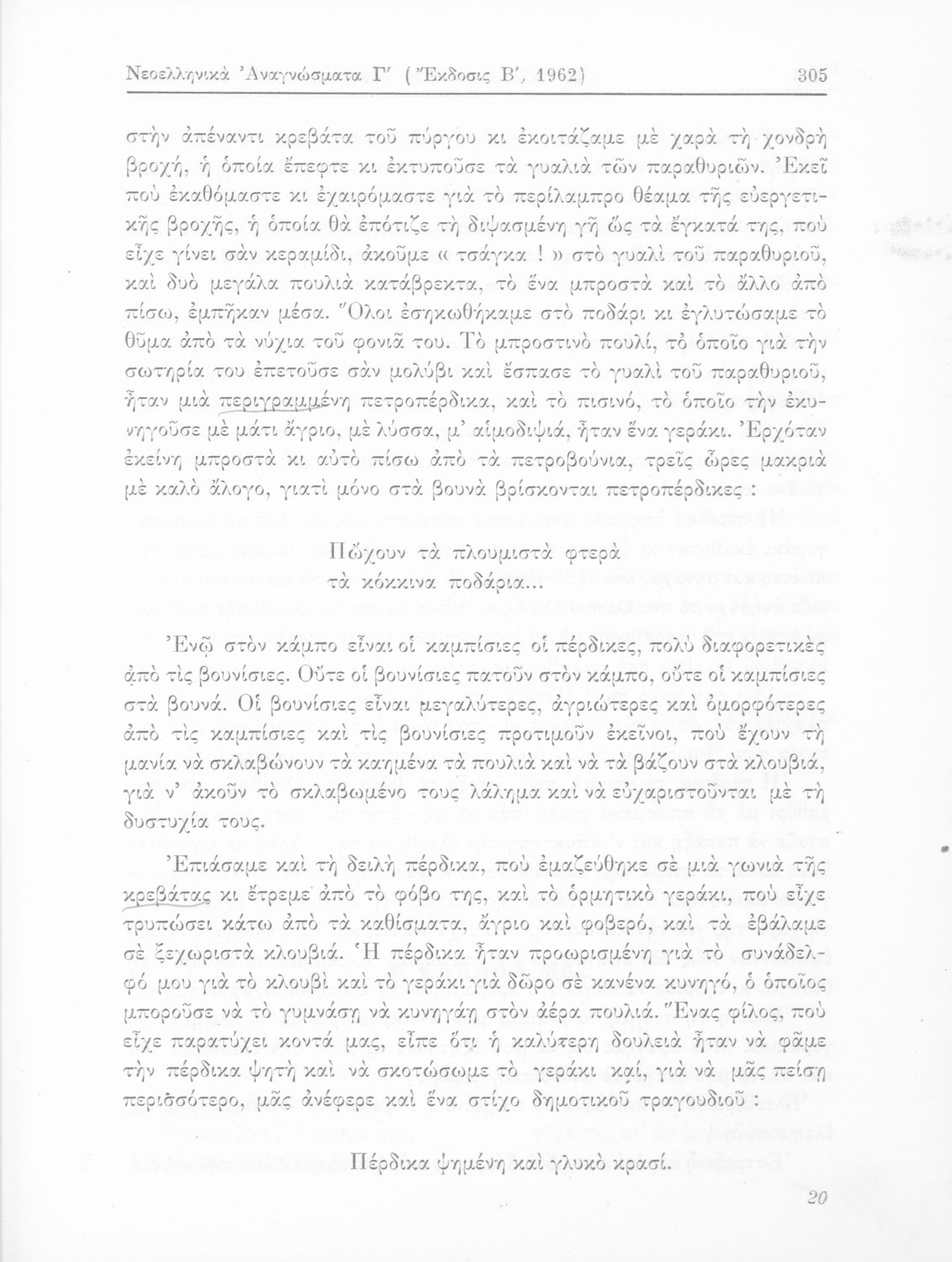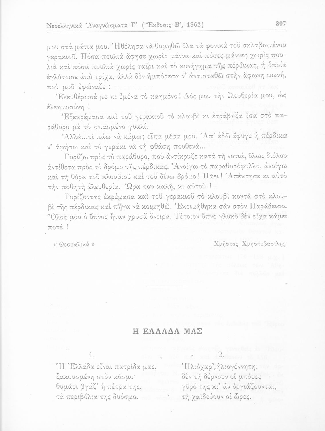 Σχολικό εγχειρίδιο Νέων Ελληνικών Δ΄ Γυμνασίου Θηλέων που περιλαμβάνει πεζά, ποιήματα και δημοτικά τραγούδια εμπνευσμένα από την σύγχρονη ελληνική ιστορία και την οικογενειακή και θρησκευτική ζωή. Περιέχει και