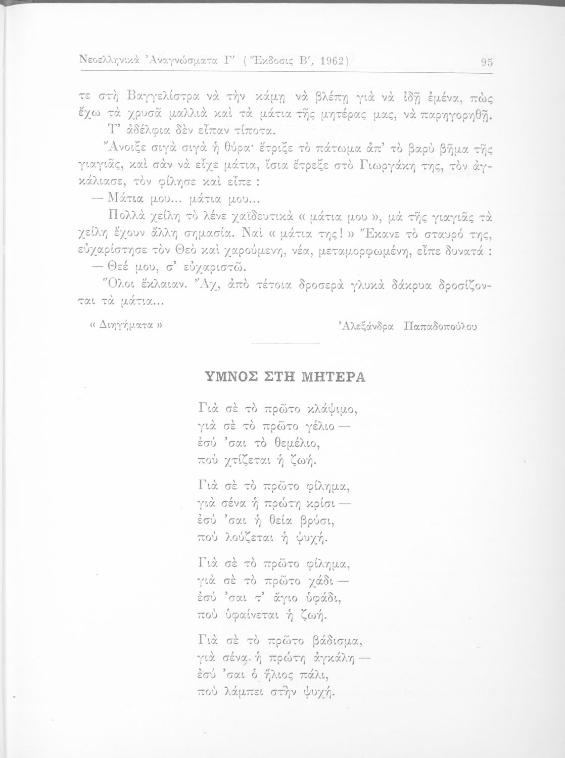 Σχολικό εγχειρίδιο Νέων Ελληνικών Δ΄ Γυμνασίου Θηλέων που περιλαμβάνει πεζά, ποιήματα και δημοτικά τραγούδια εμπνευσμένα από την σύγχρονη ελληνική ιστορία και την οικογενειακή και θρησκευτική ζωή. Περιέχει και