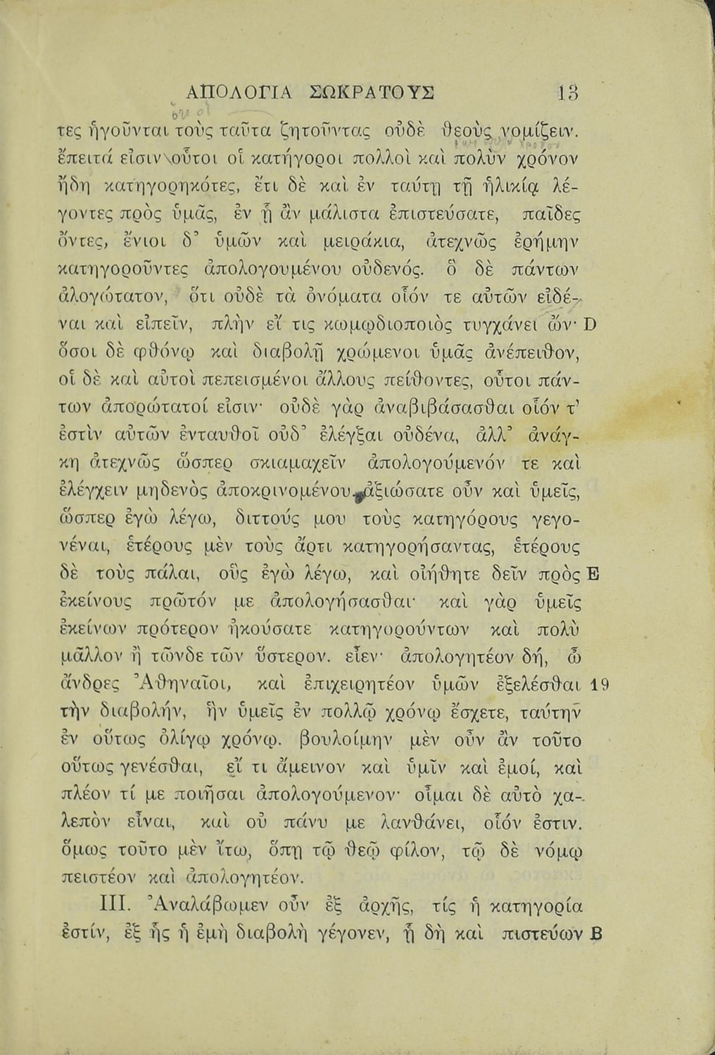 Σχολικό εγχειρίδιο της Γ΄ Γυμνασίου για το μάθημα των Αρχαίων. Περιέχει το πρωτότυπο κείμενο από το έργο του Πλάτωνα, Απολογία του Σωκράτη, με ερμηνευτικές και πραγματολογικές παρατηρήσεις του συγγραφέα.