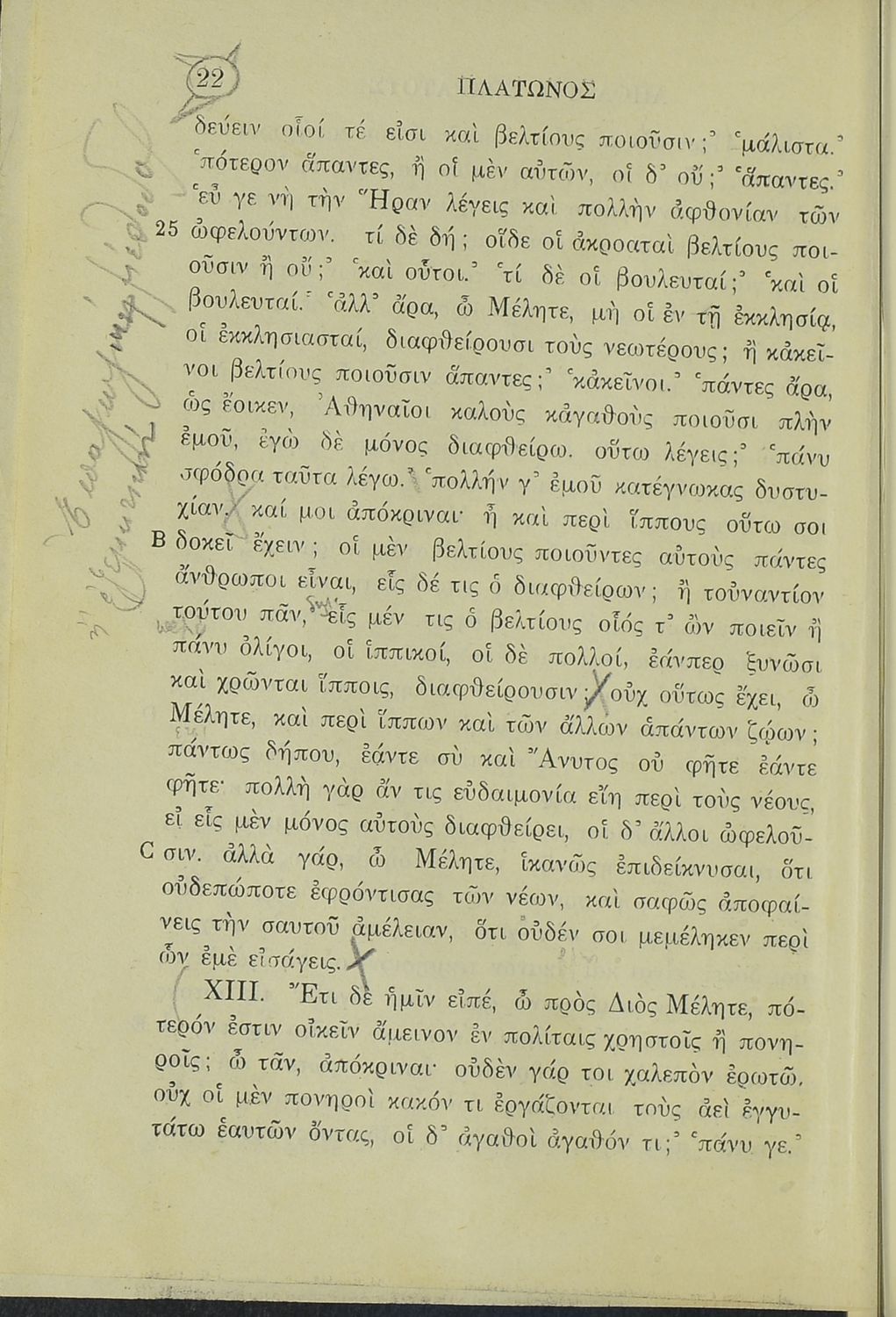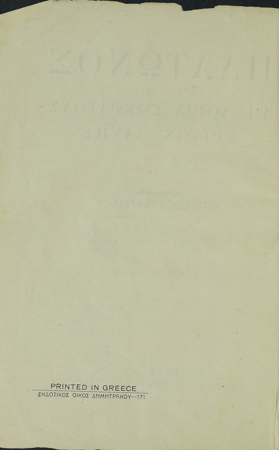 Σχολικό εγχειρίδιο Αρχαίων Ελληνικών από το κείμενο του Πλάτωνα. Περιέχονται ερμηνευτικά σχόλια του συγγραφέα στη καθαρεύουσα. Απεικονίζεται το σύμβολο της Επταετίας.
