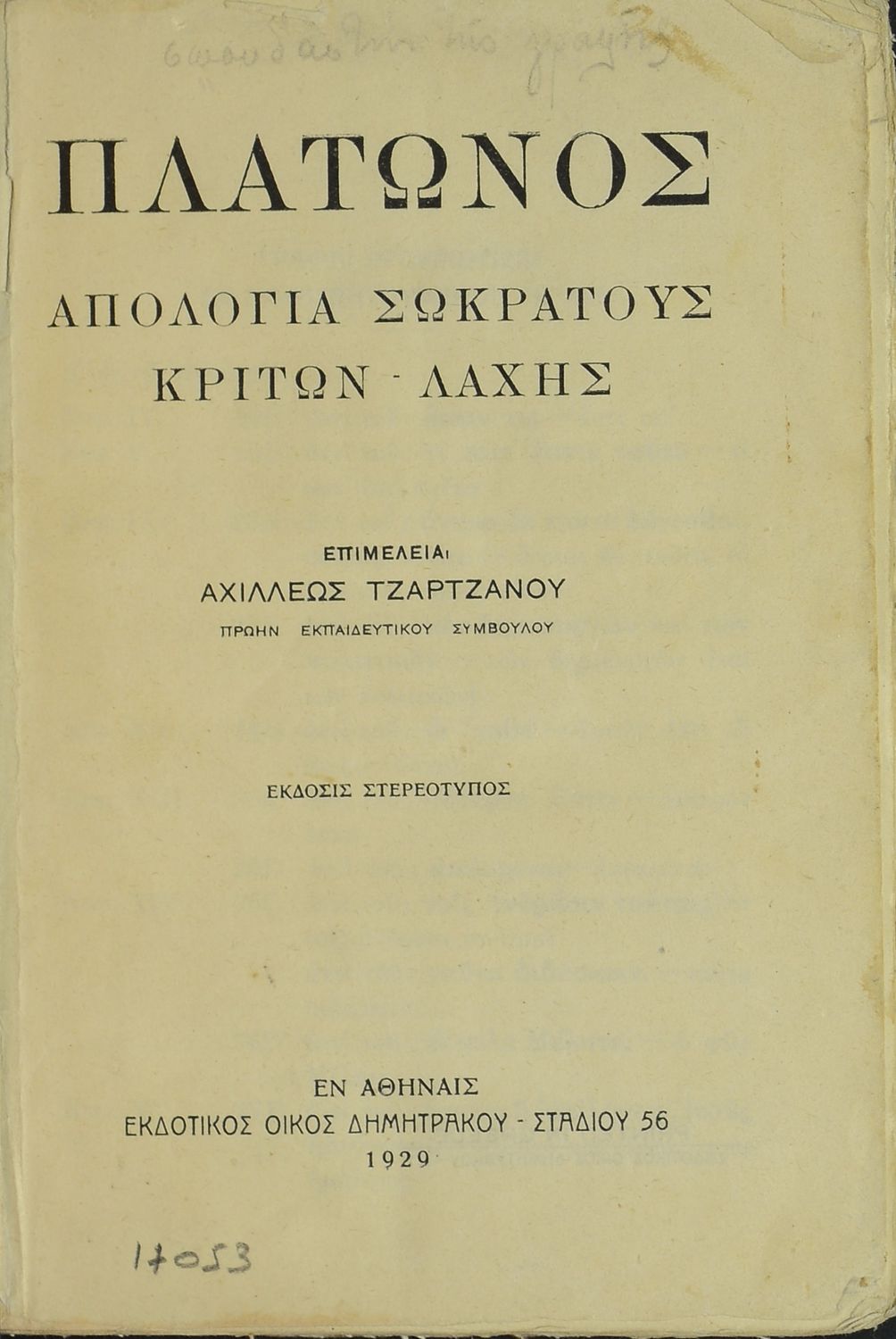 Συγγραφέας: Πλάτων, Αχιλλέας Τζάρτζανος (σχόλια)