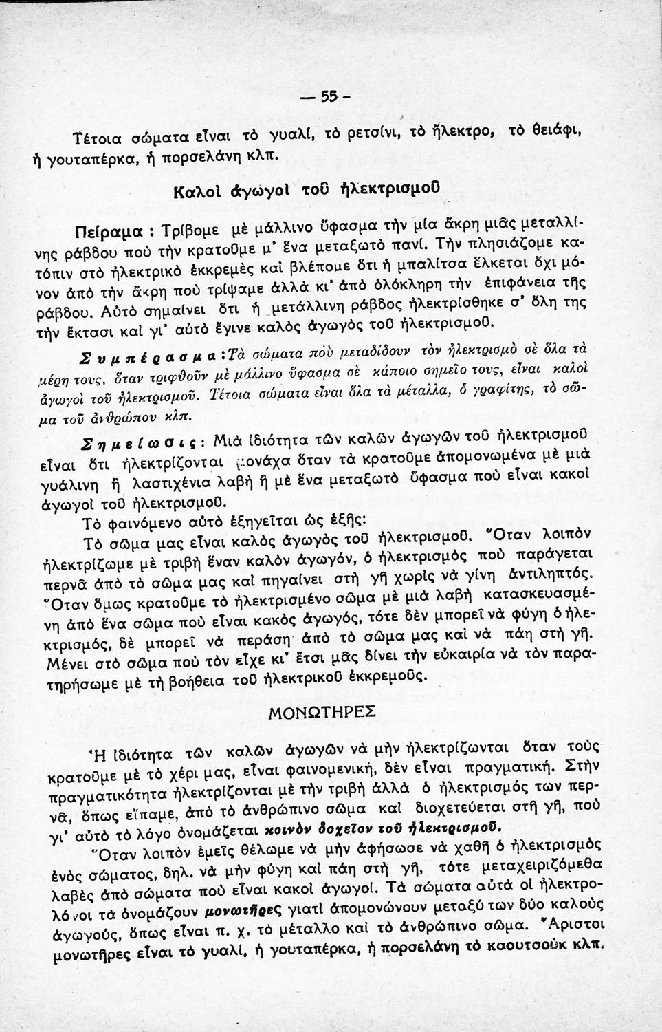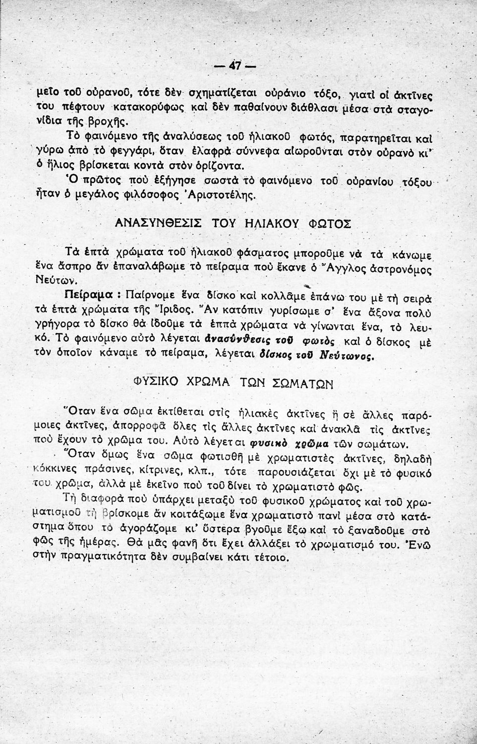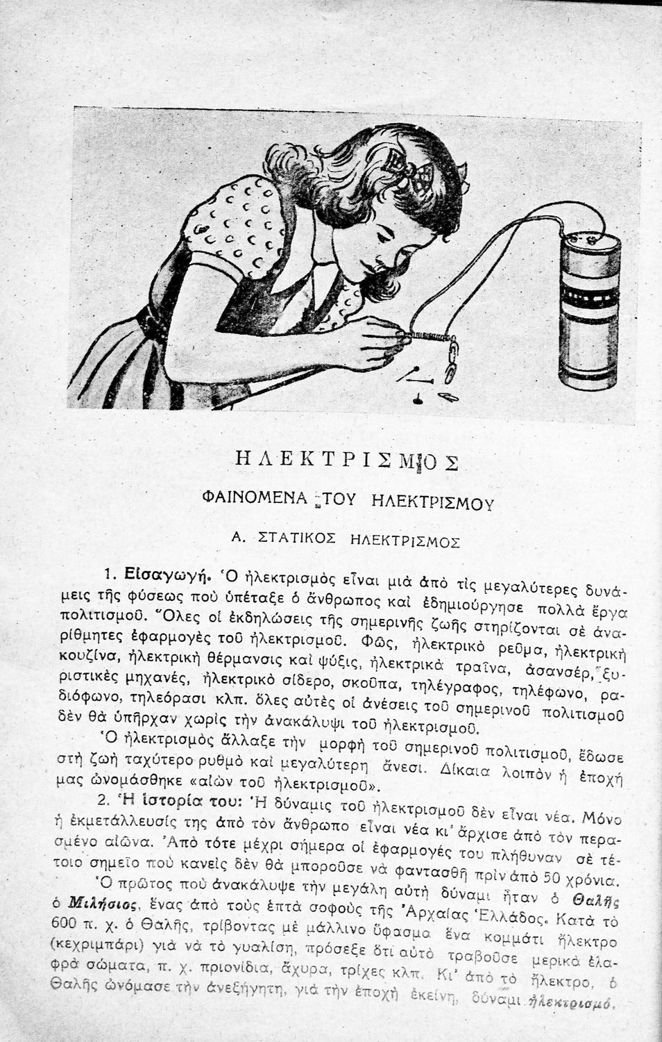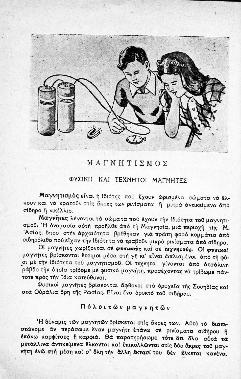 Σχολικό εγχειρίδιο Φυσικής Πειραματικής ΣΤ΄ Δημοτικού που εστιάζει στα φυσικά φαινόμενα (ακουστική, οπτική, μαγνητισμός και ηλεκτρισμός) και στα χημικά φαινόμενα (είδη του άνθρακα, παραγωγή πίσσας, ναφθαλίνης,