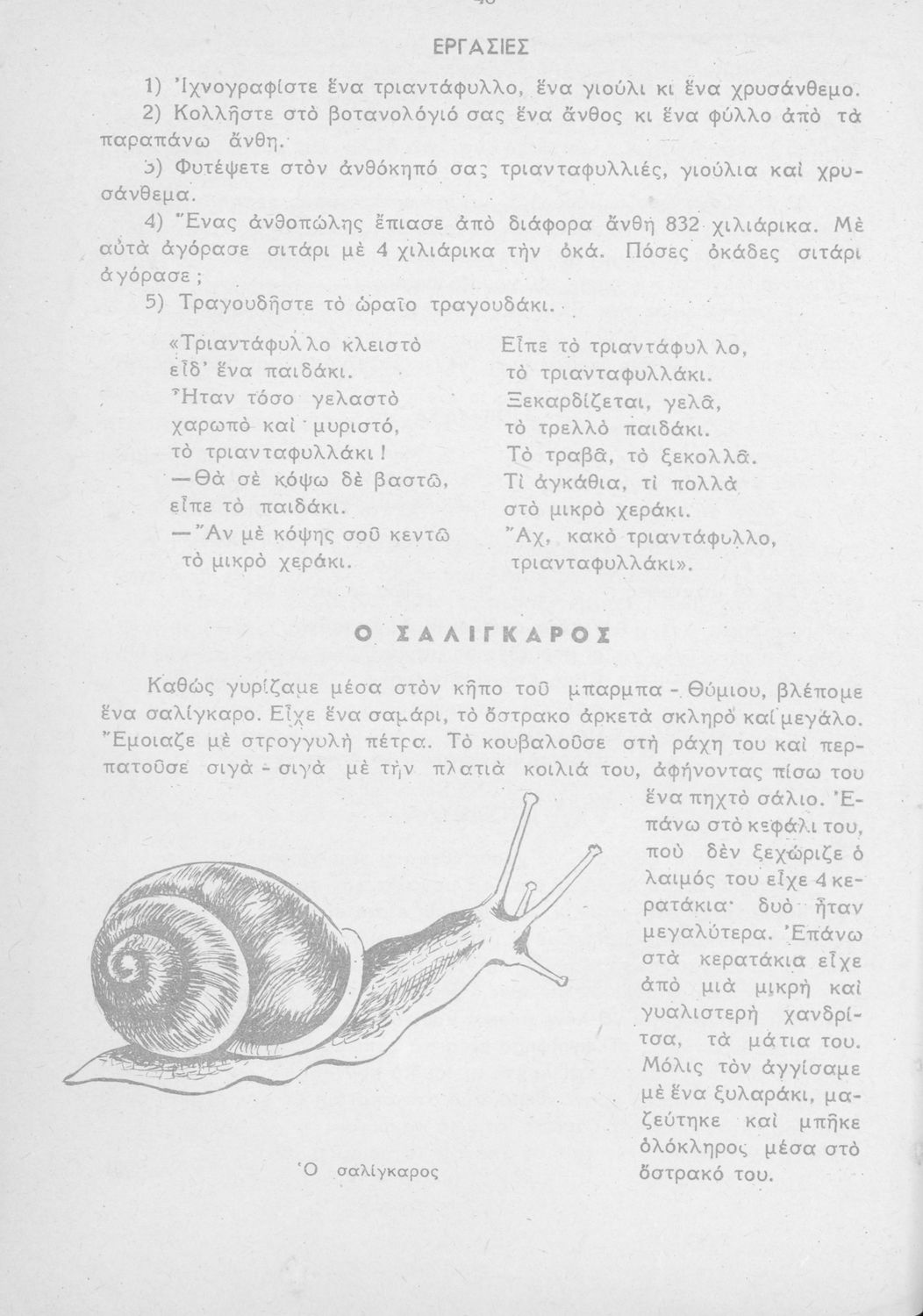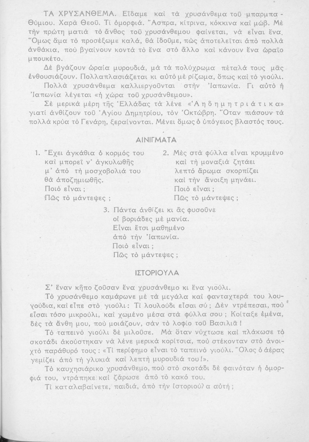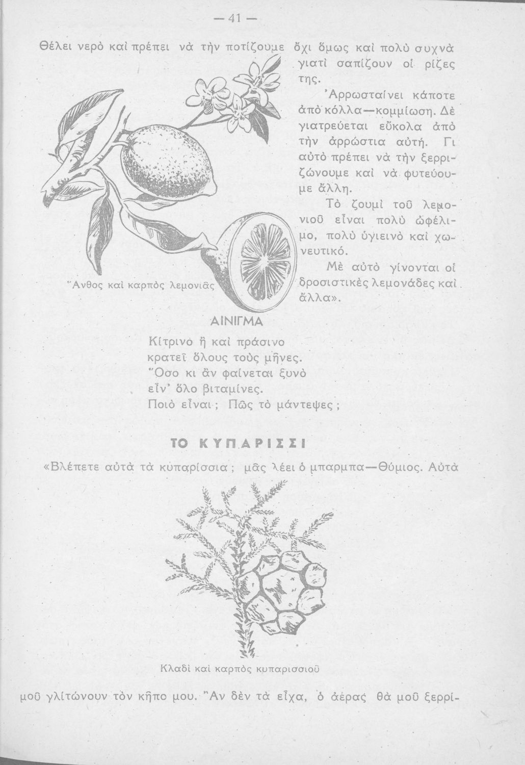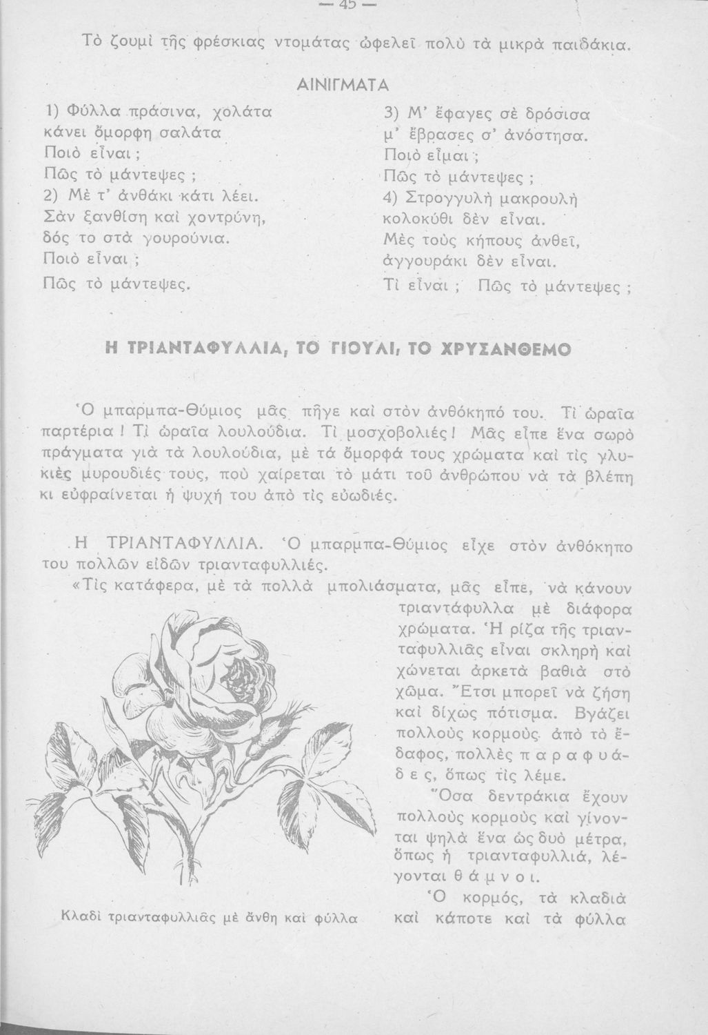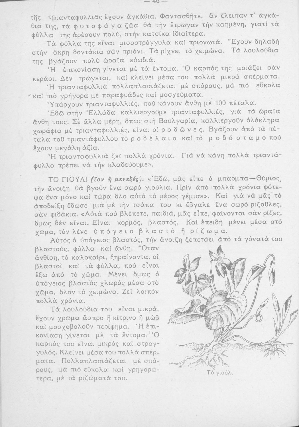 Πρόκειται για βιβλίο Φυτολογίας και Ζωολογίας για την Γ΄ Δημοτικού. Περιέχει στοιχεία για τα μέρη του φυτού, για φυτά και ζώα που υπάρχουν στον κήπο, τον ανθόκηπο και τον λαχανόκηπο.