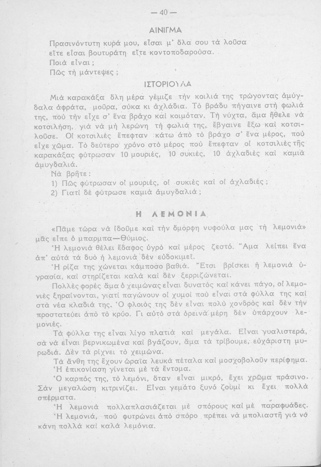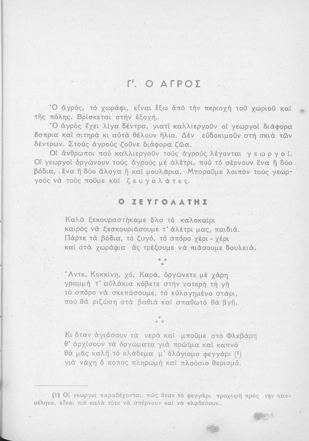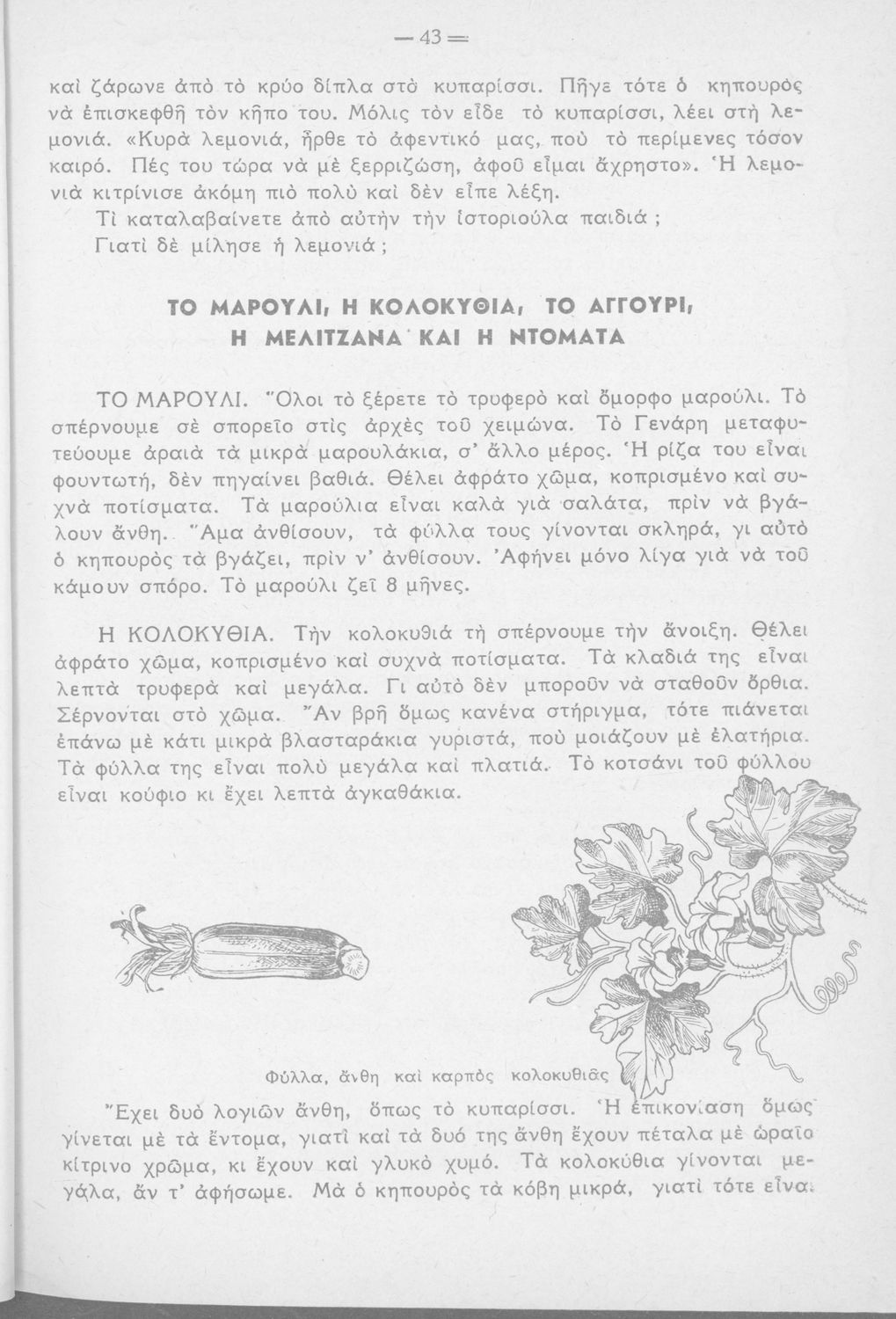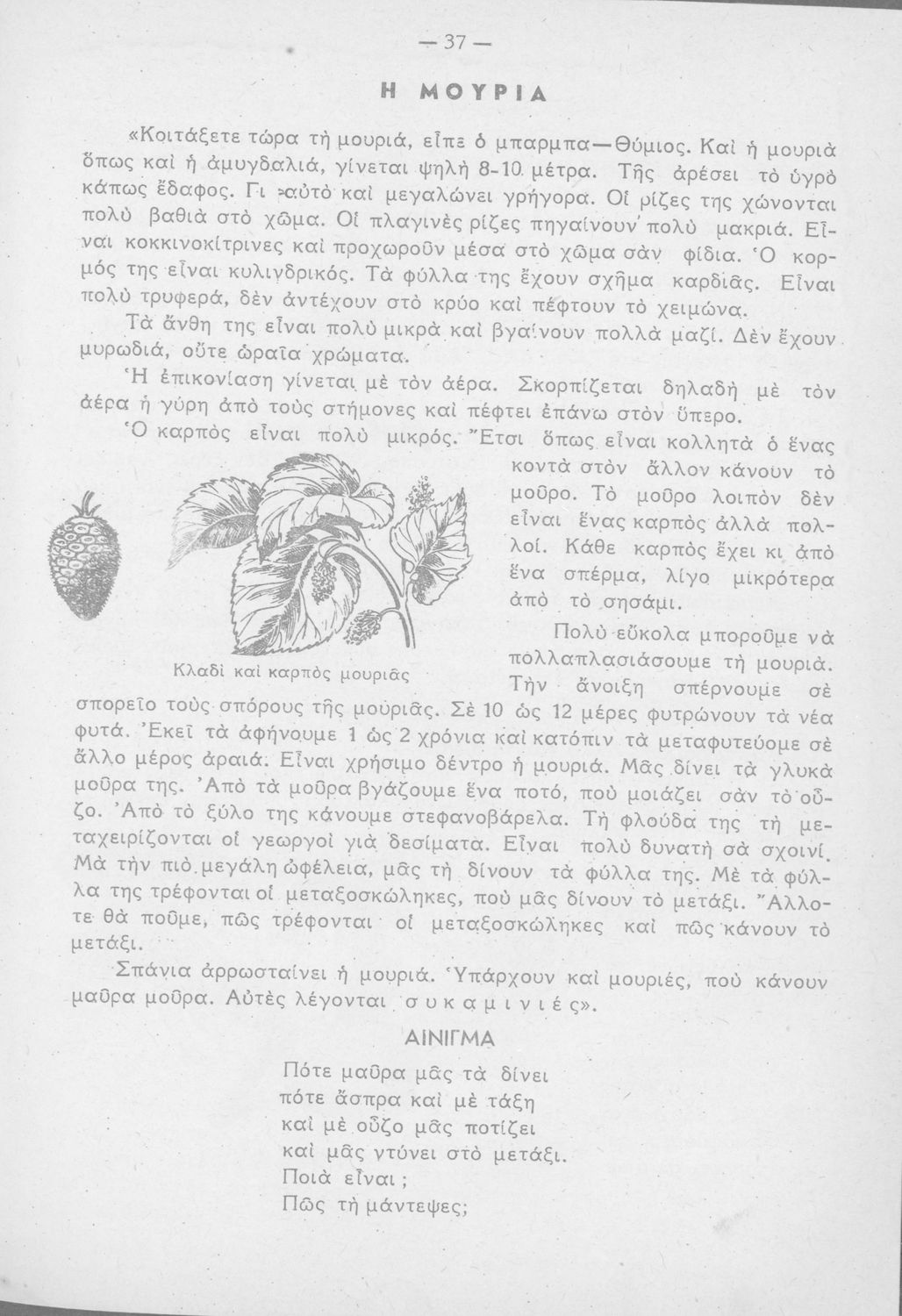 Πρόκειται για βιβλίο Φυτολογίας και Ζωολογίας για την Γ΄ Δημοτικού. Περιέχει στοιχεία για τα μέρη του φυτού, για φυτά και ζώα που υπάρχουν στον κήπο, τον ανθόκηπο και τον λαχανόκηπο.