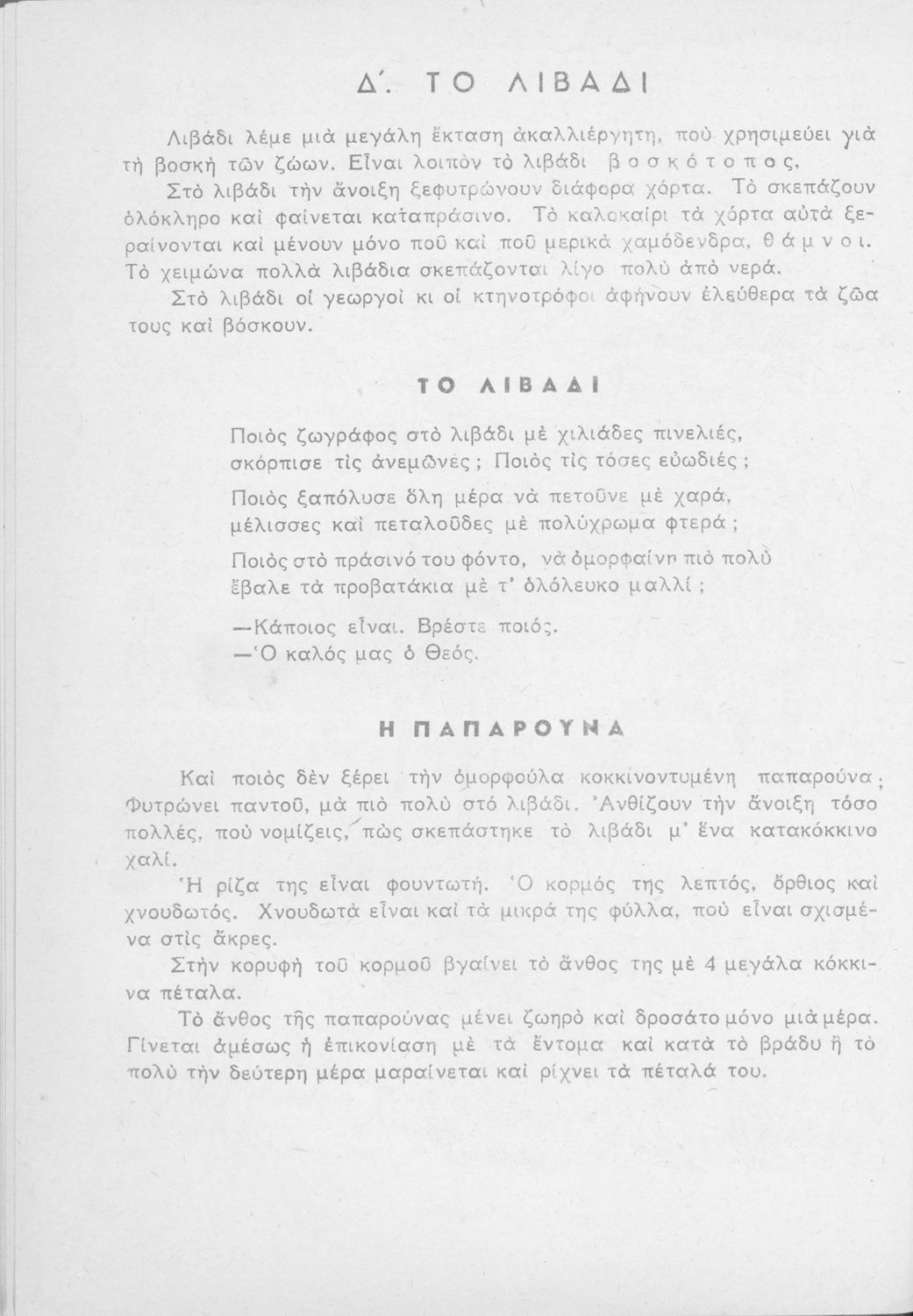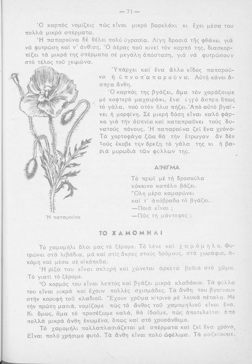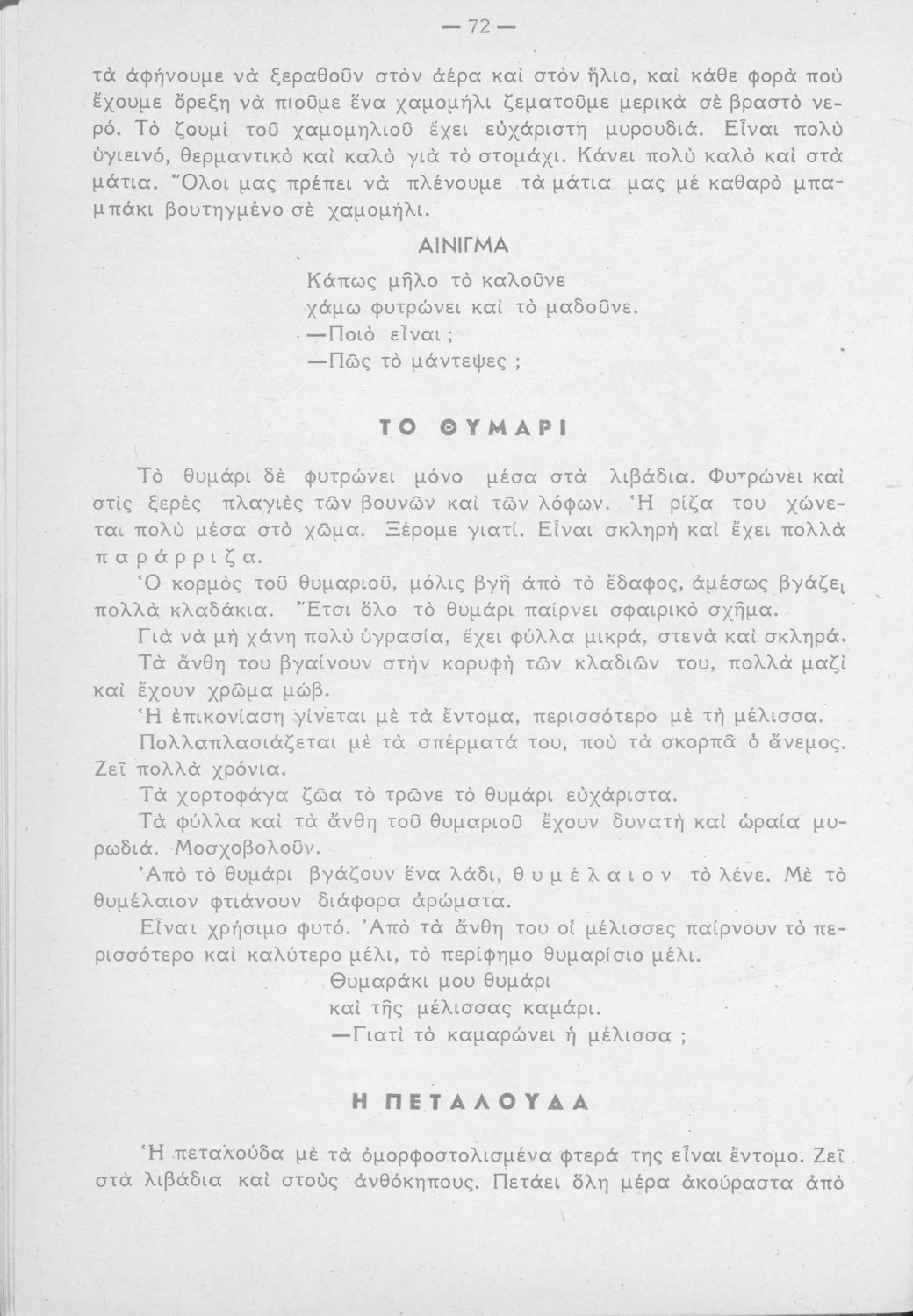 Πρόκειται για βιβλίο Φυτολογίας και Ζωολογίας για την Γ΄ Δημοτικού. Περιέχει στοιχεία για τα μέρη του φυτού, για φυτά και ζώα που υπάρχουν στον κήπο, τον ανθόκηπο και τον λαχανόκηπο.