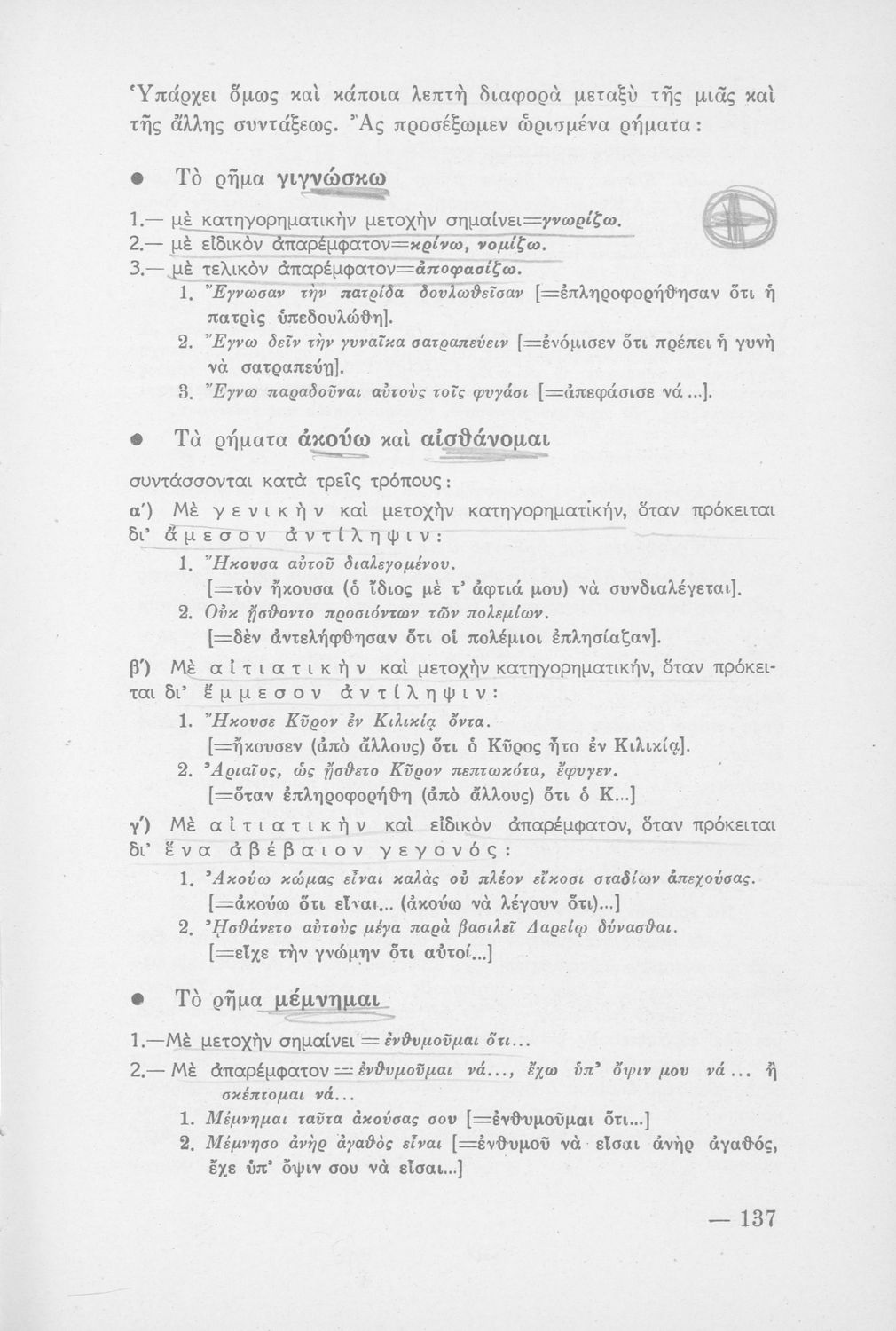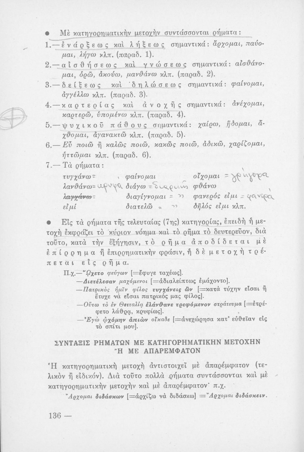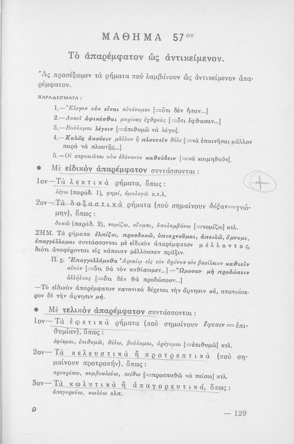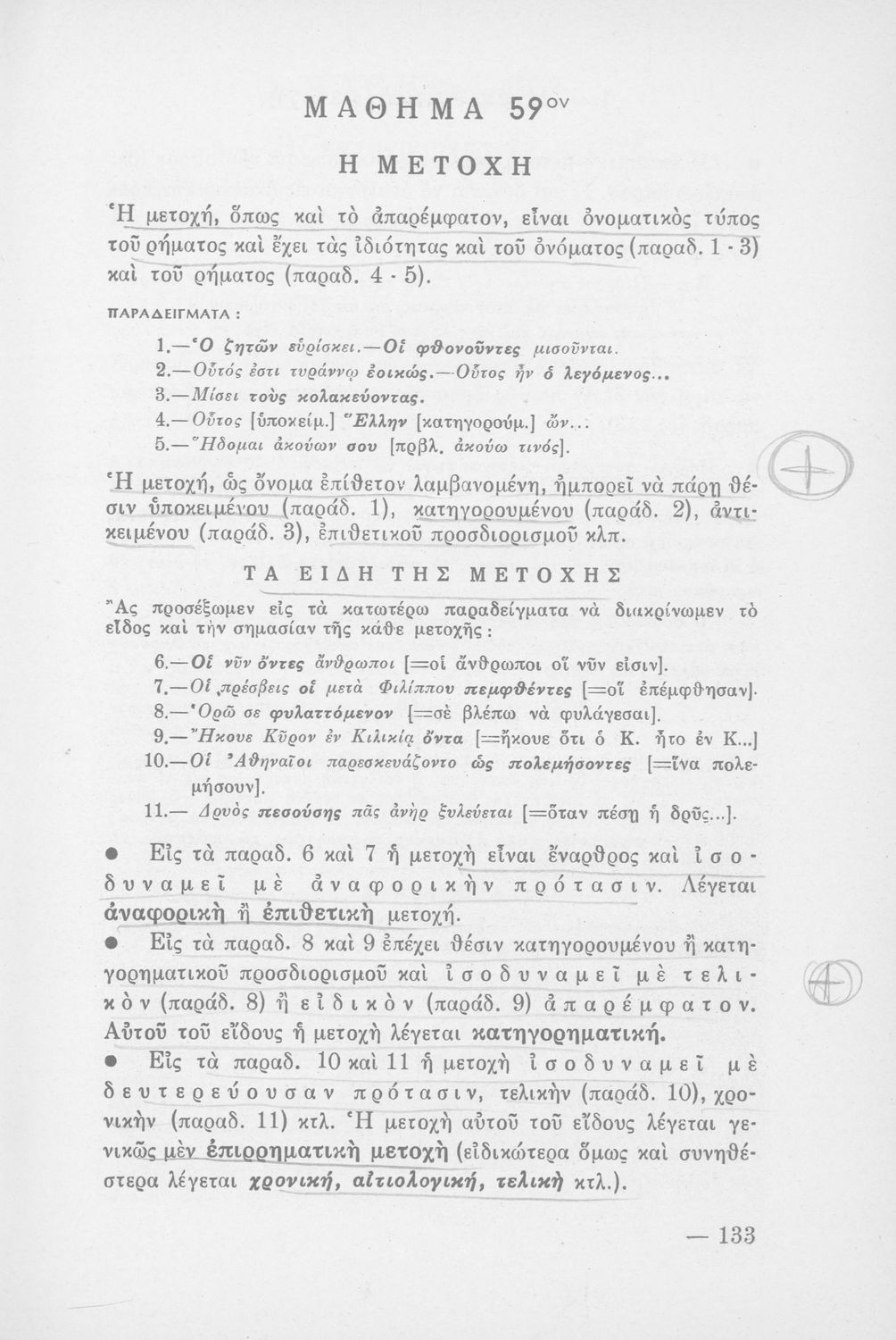Μαθητικό βοήθημα Αρχαίων Ελληνικών Γυμνασίου που εξετάζει τα μέρη του λόγου και την σύνταξή τους.