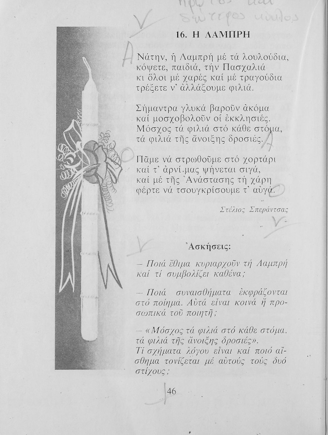 Αναγνωστικό Ε΄ Δημοτικού που περιέχει πεζά και ποιήματα εμπνευσμένα από τη θρησκευτική, εθνική, κοινωνική ζωή καθώς και από τις ασχολίες των Ελλήνων, την αρχαία και σύγχρονη ελληνική ιστορία και τον πολιτισμό.