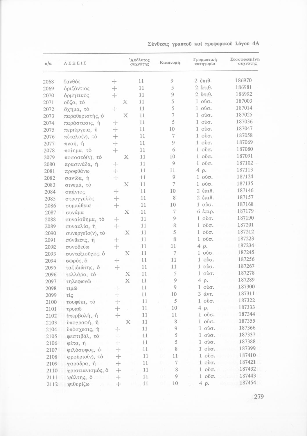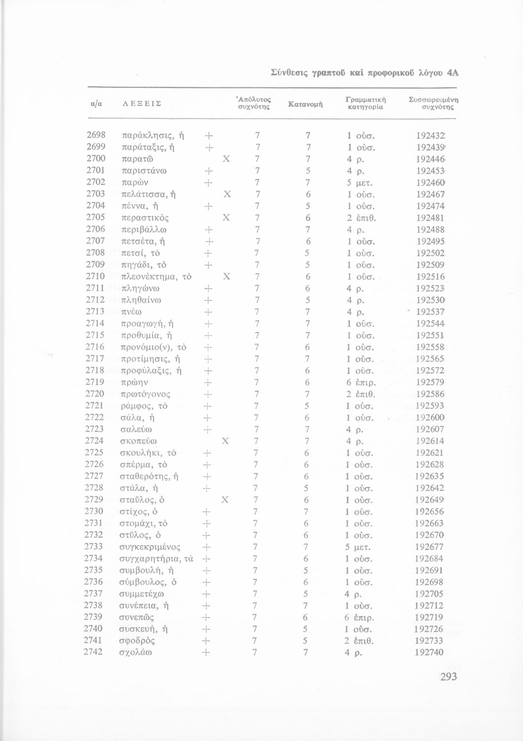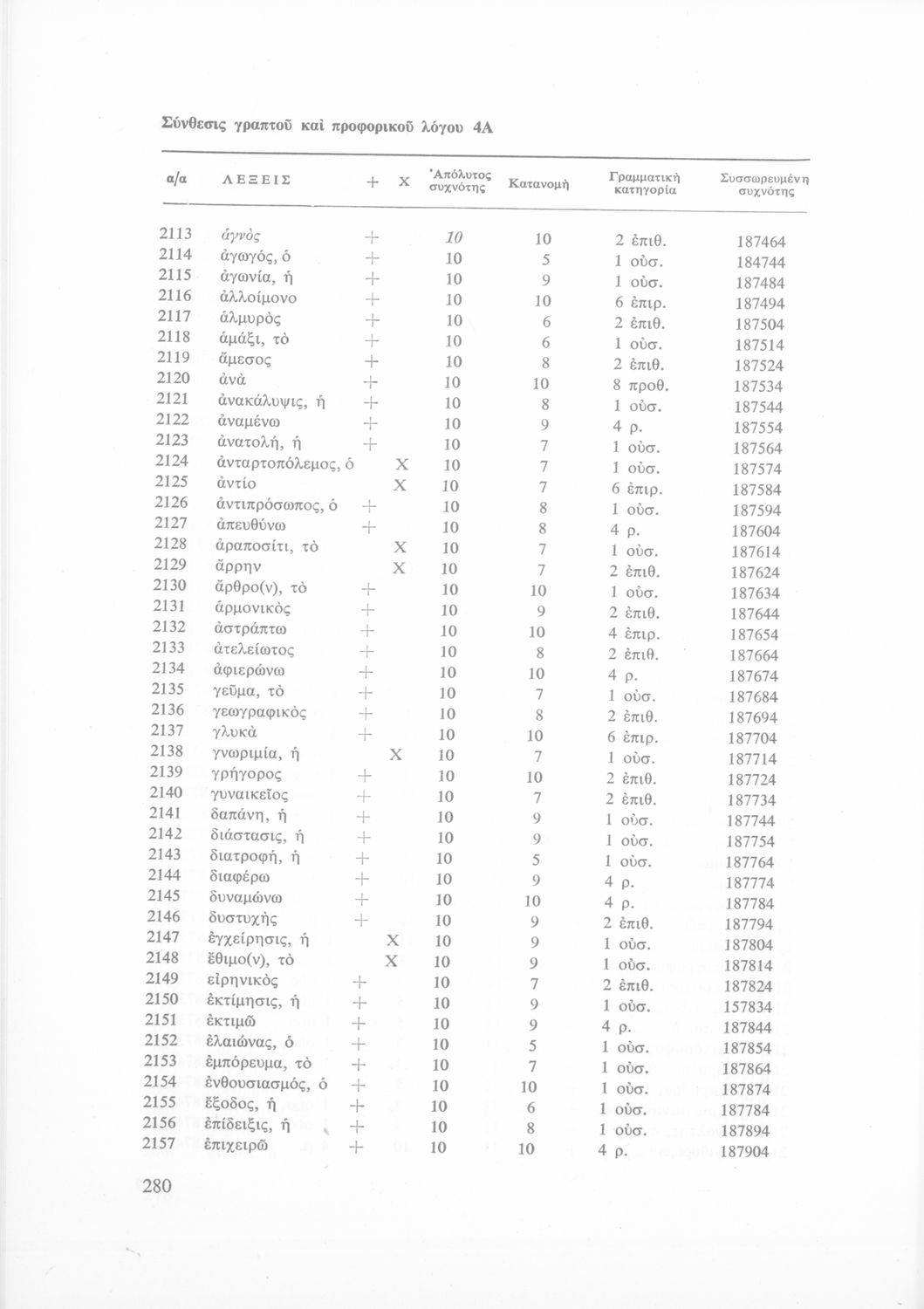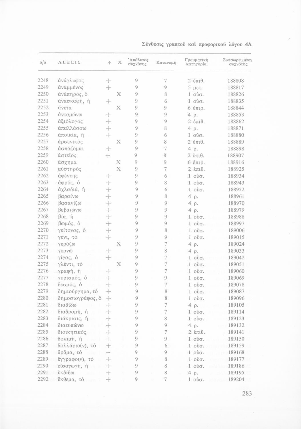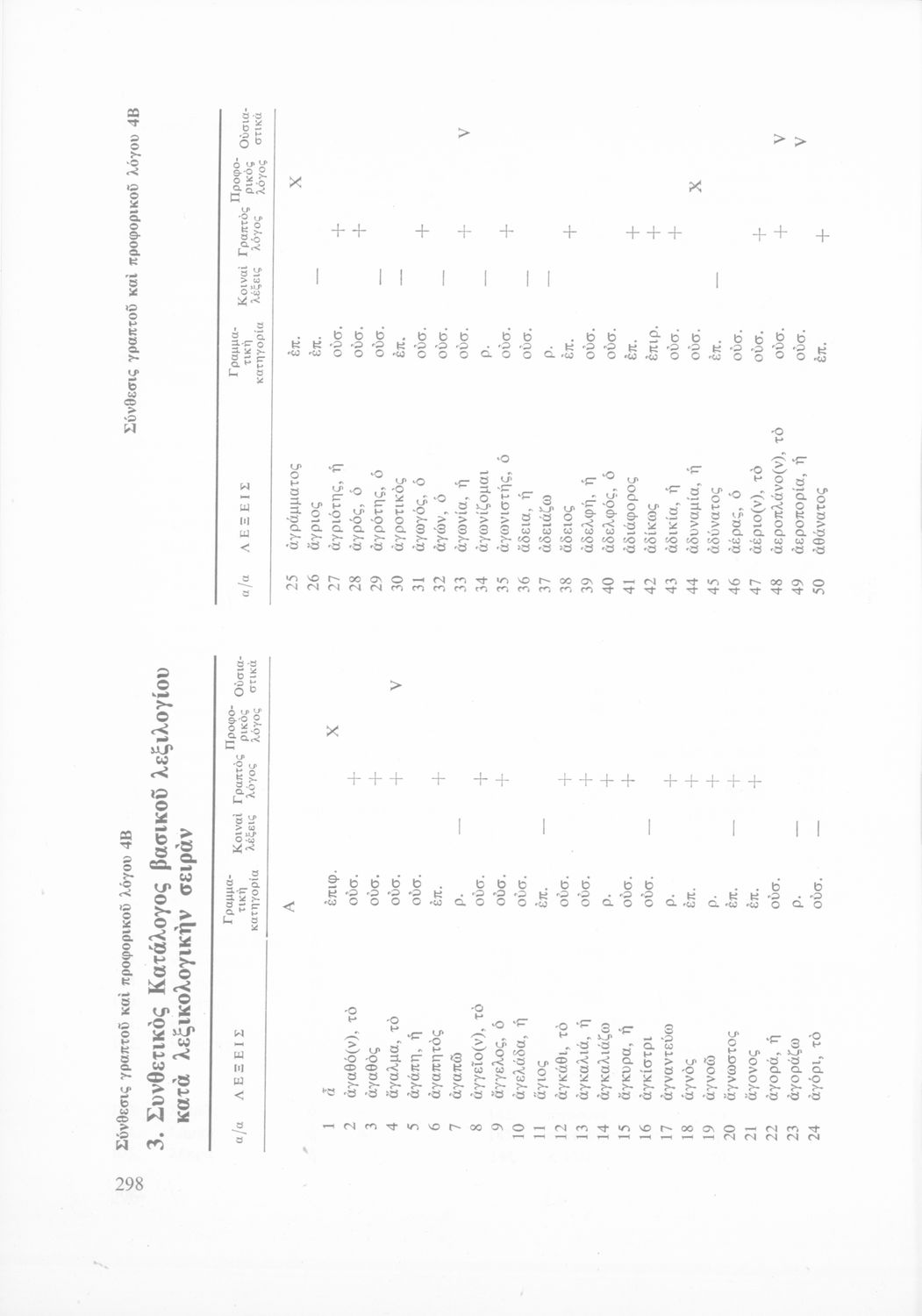 Έρευνα πάνω στη νέα ελληνική που αποσκοπεί στην κατάρτιση και διδασκαλία ενός βασικού λεξιλογίου και της ορθογραφίας του. Φέρει το σύμβολο της δικτατορίας.