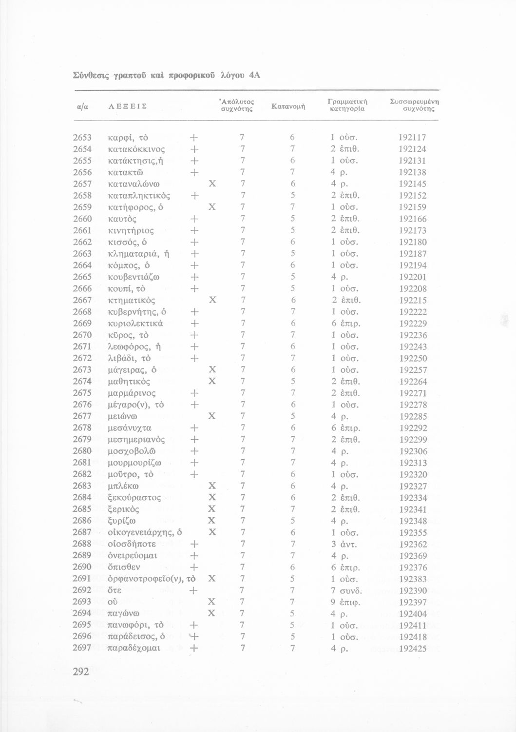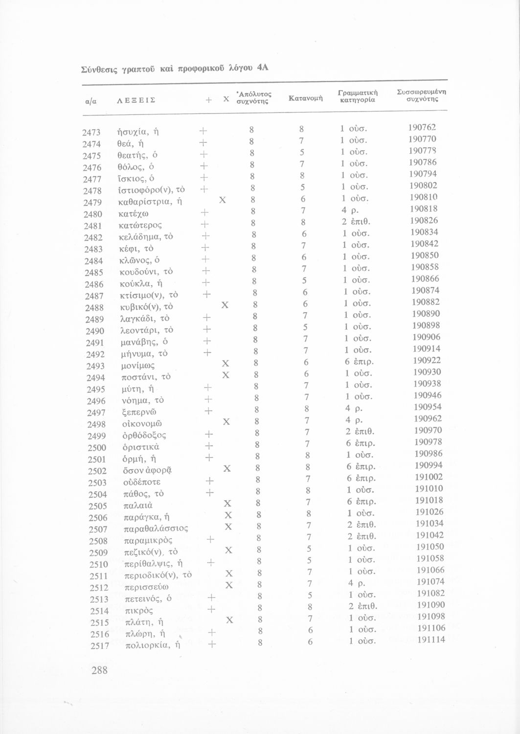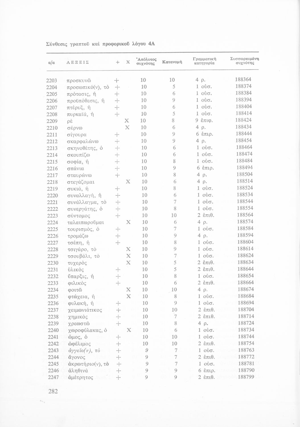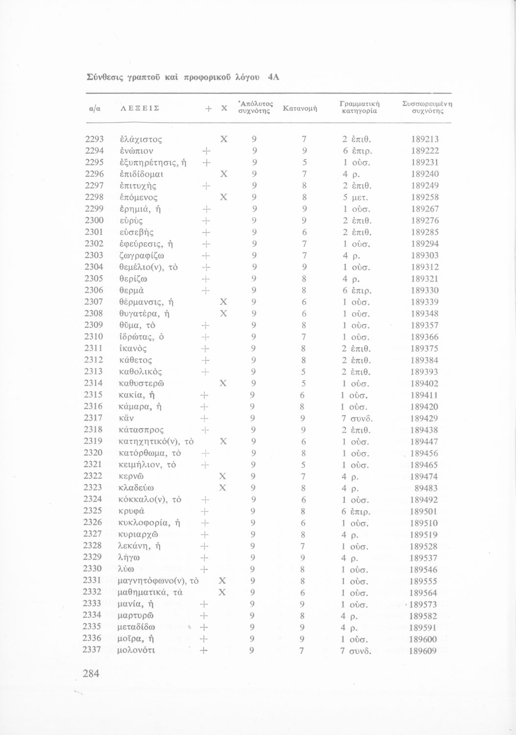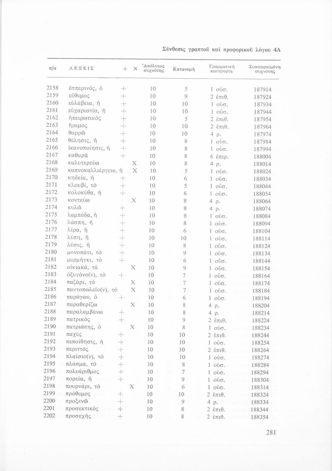 Έρευνα πάνω στη νέα ελληνική που αποσκοπεί στην κατάρτιση και διδασκαλία ενός βασικού λεξιλογίου και της ορθογραφίας του. Φέρει το σύμβολο της δικτατορίας.