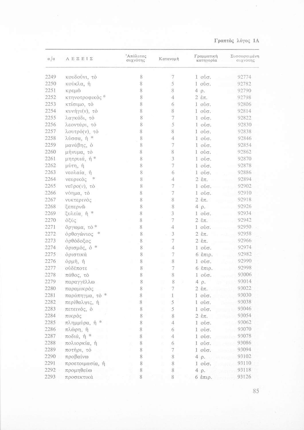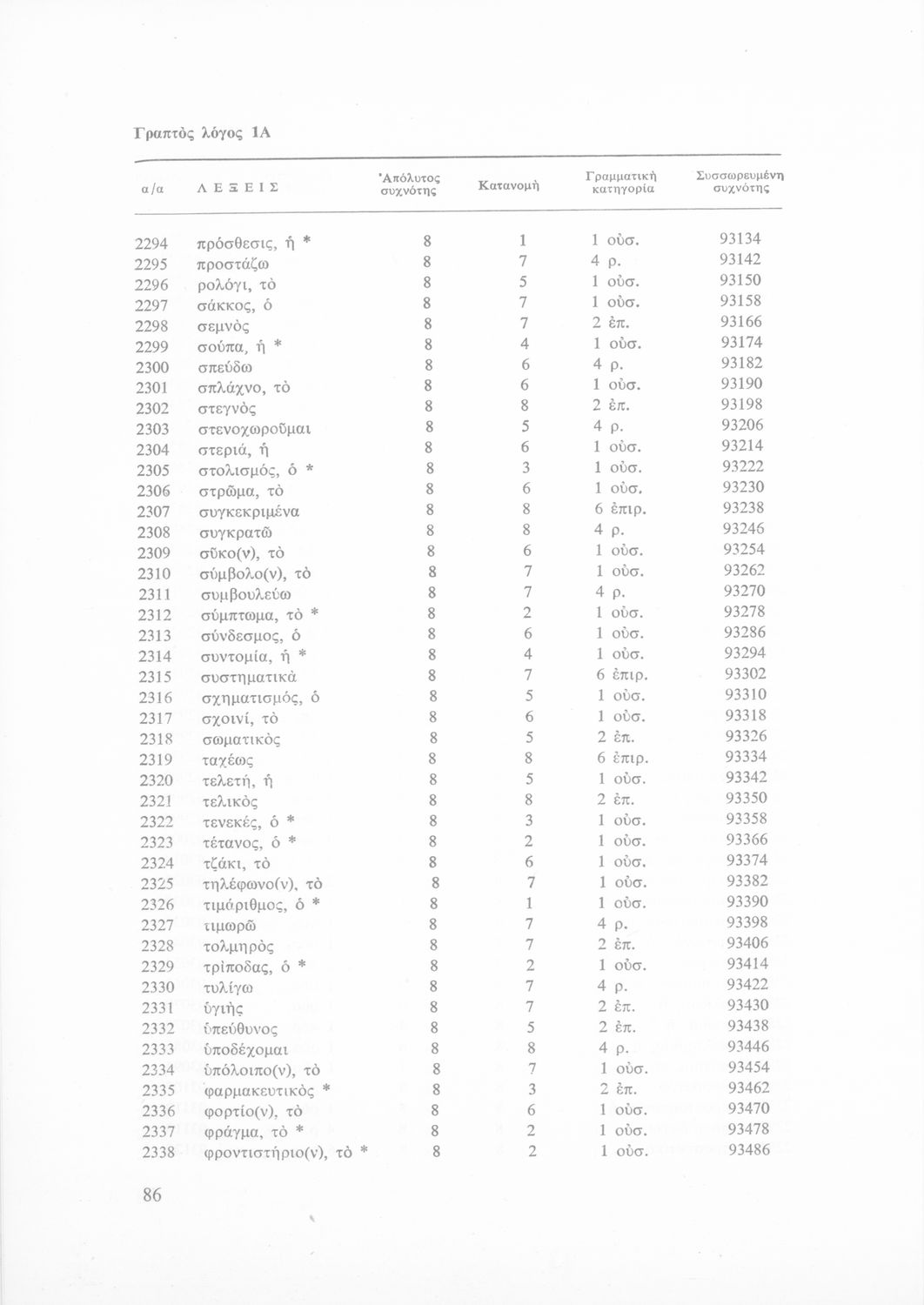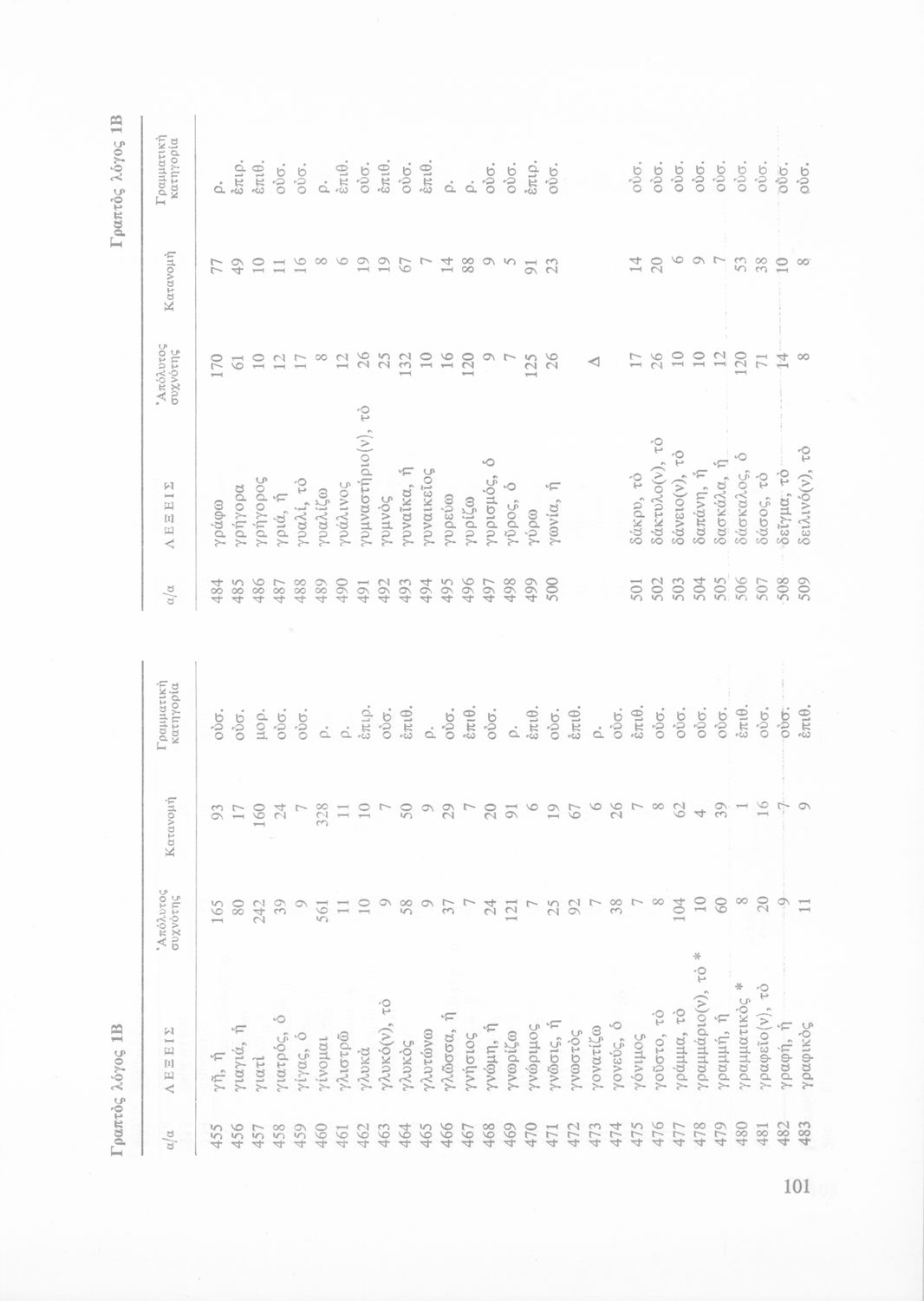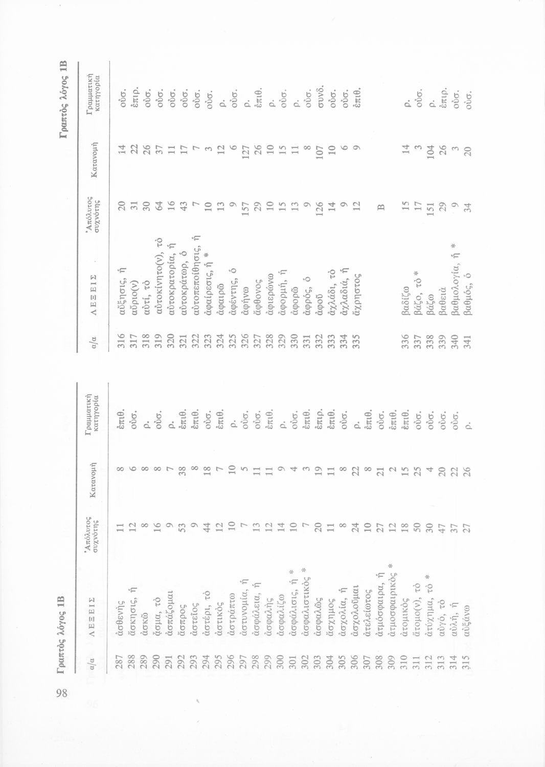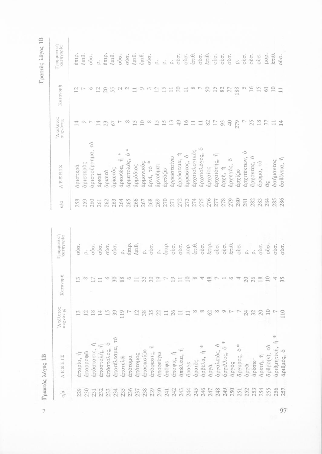 Έρευνα πάνω στη νέα ελληνική που αποσκοπεί στην κατάρτιση και διδασκαλία ενός βασικού λεξιλογίου και της ορθογραφίας του. Φέρει το σύμβολο της δικτατορίας.