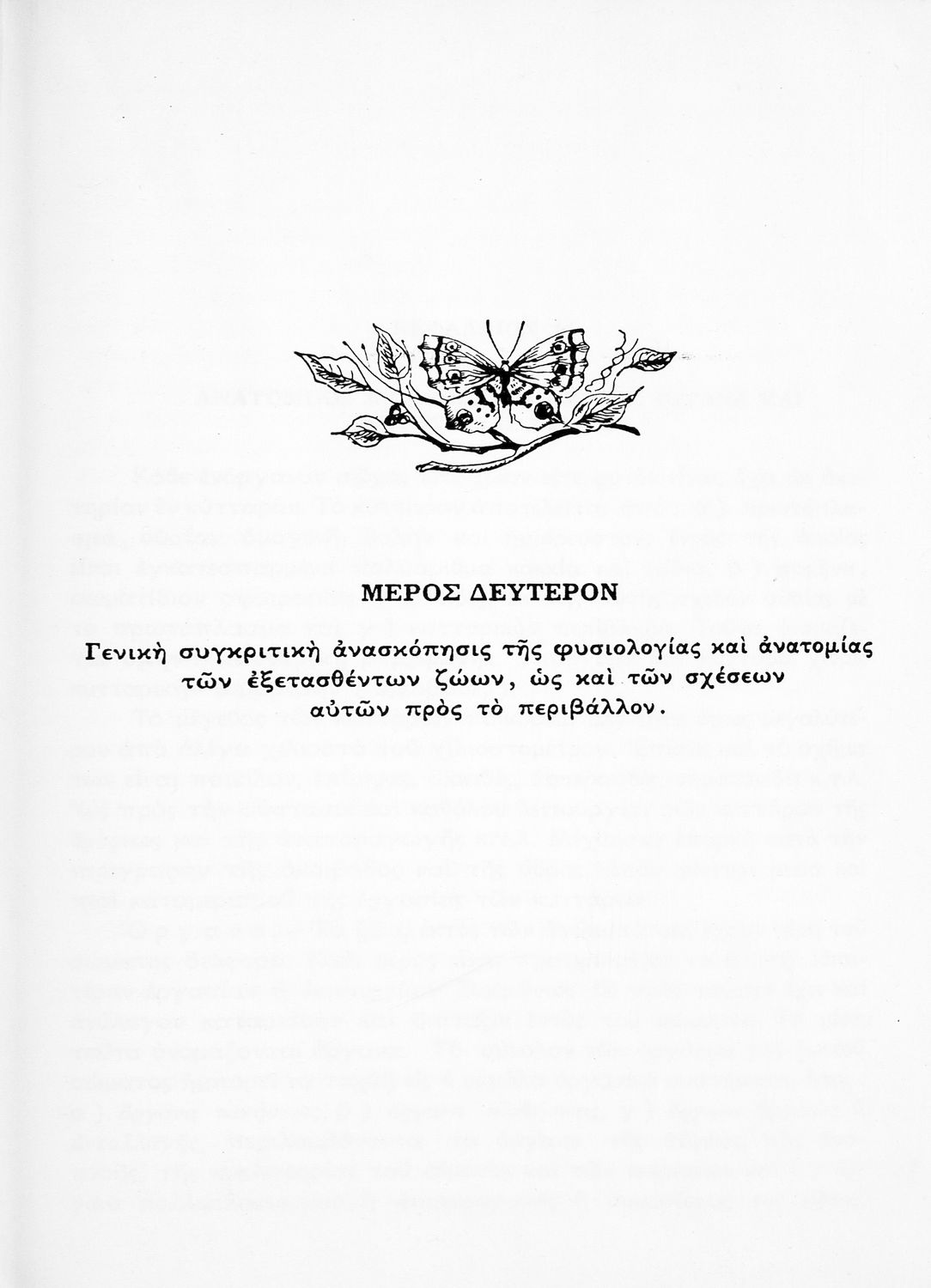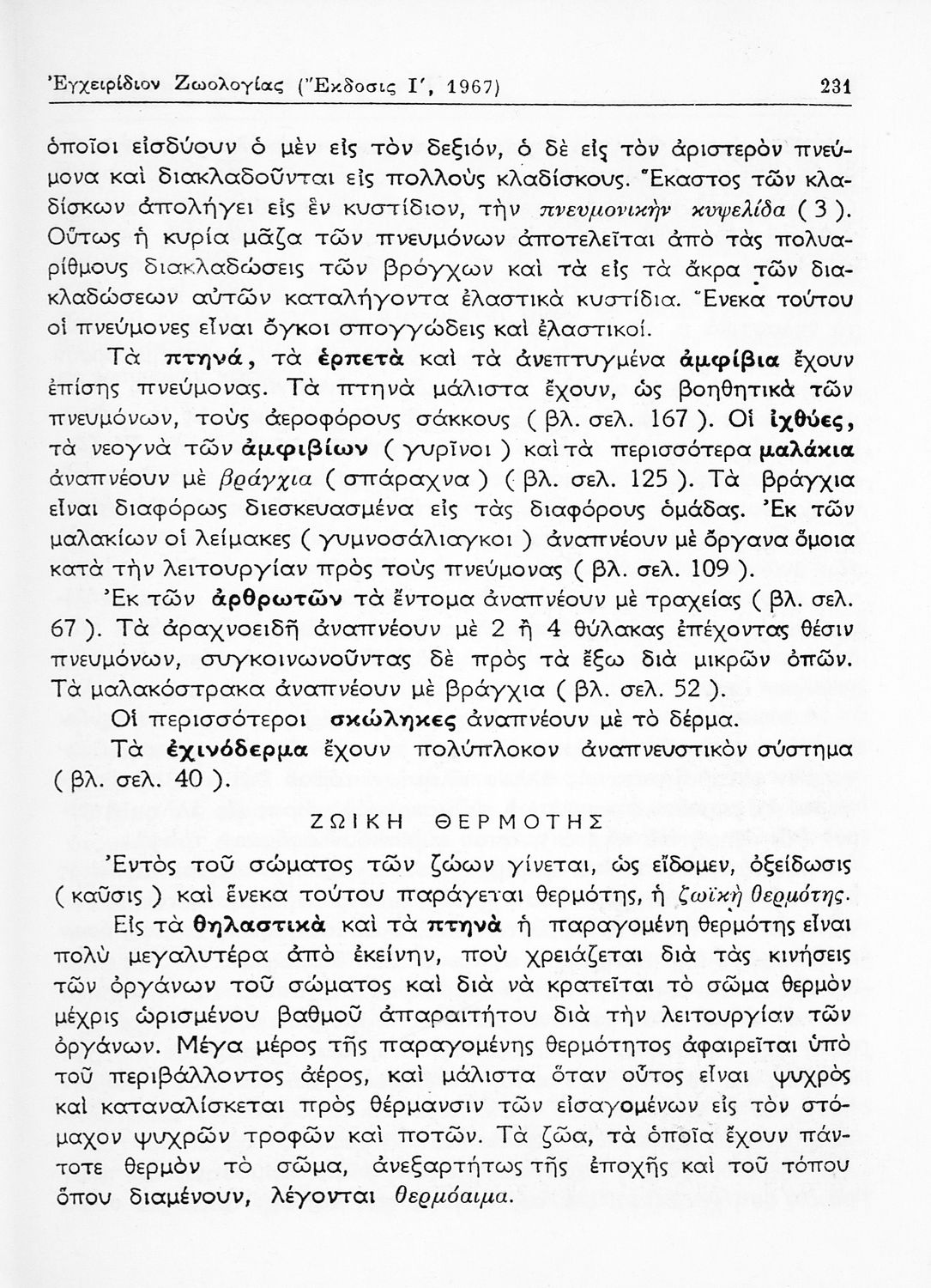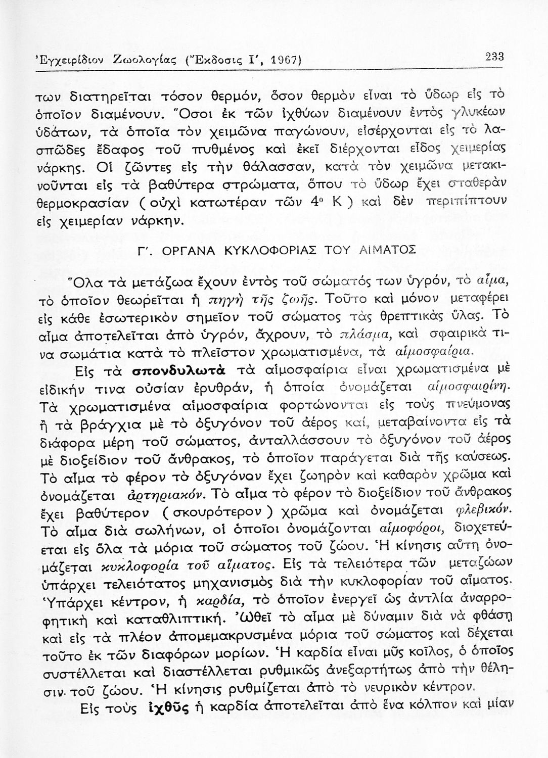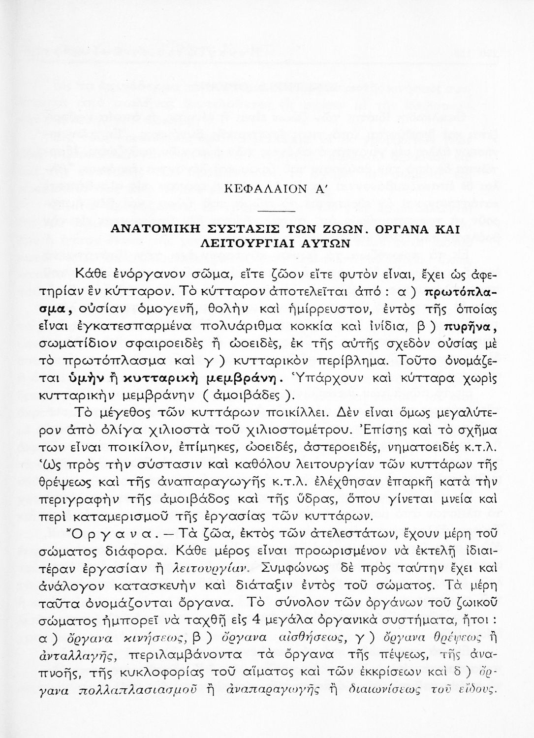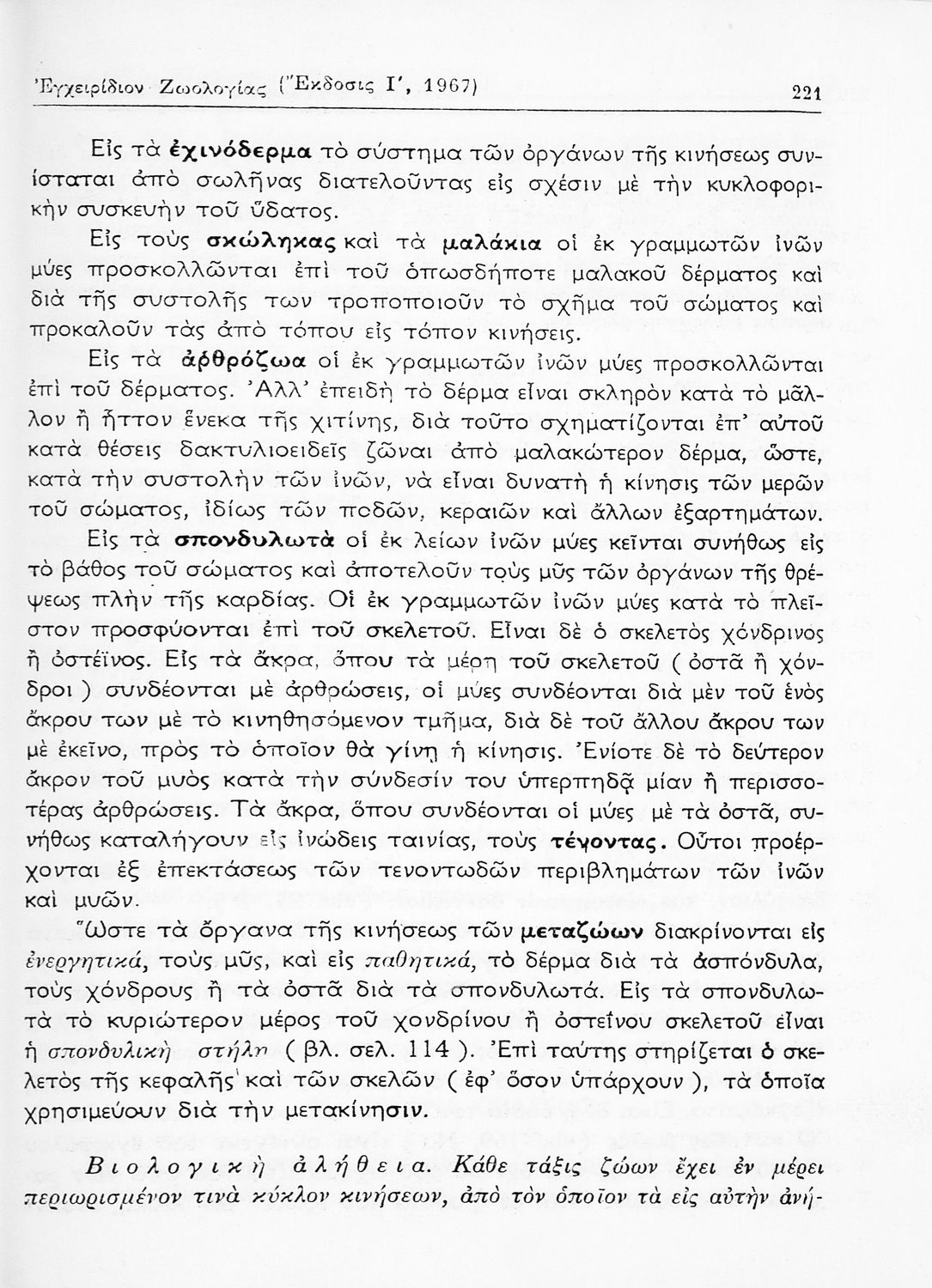 Σχολικό εγχειρίδιο Ζωολογίας Α΄ Γυμνασίου που εστιάζει στη φυσιολογία και ανατομία και παρουσιάζει τα διάφορα ζώα ανάλογα με την συνομοταξία στην οποία ανήκουν. Φέρει το σύμβολο της δικτατορίας.