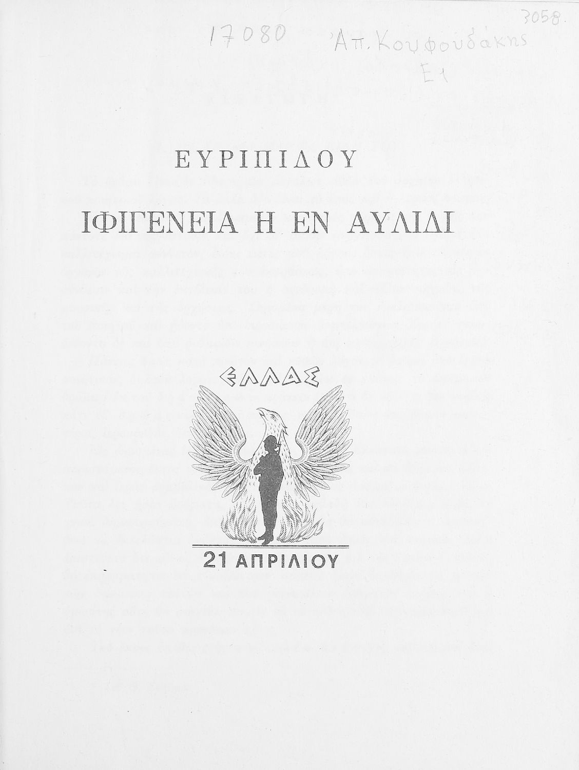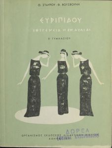 Σχολικό εγχειρίδιο Αρχαίων Ελληνικών Ε΄ Γυμνασίου που περιέχει εισαγωγή στο αρχαίο δράμα και στη ζωή και το έργο του Ευριπίδη, αποσπάσματα από την Ιφιγένεια η εν Αυλίδι και ερμηνευτικά σχόλια. Φέρει το σύμβολο της δικτατορίας.