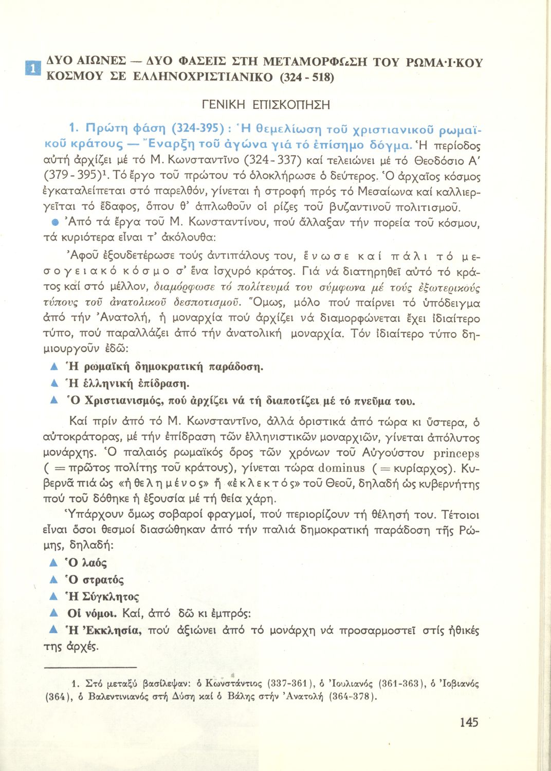 Σχολικό εγχειρίδιο Ιστορίας Β΄ και Ε΄ Γυμνασίου που καλύπτει την περίοδο από την άνοδο του Μ. Κωνσταντίνου στο θρόνο μέχρι και την άλωση της Κωνσταντινούπολης. Παρουσιάζει και τα πνευματικά και καλλιτεχνικά ...