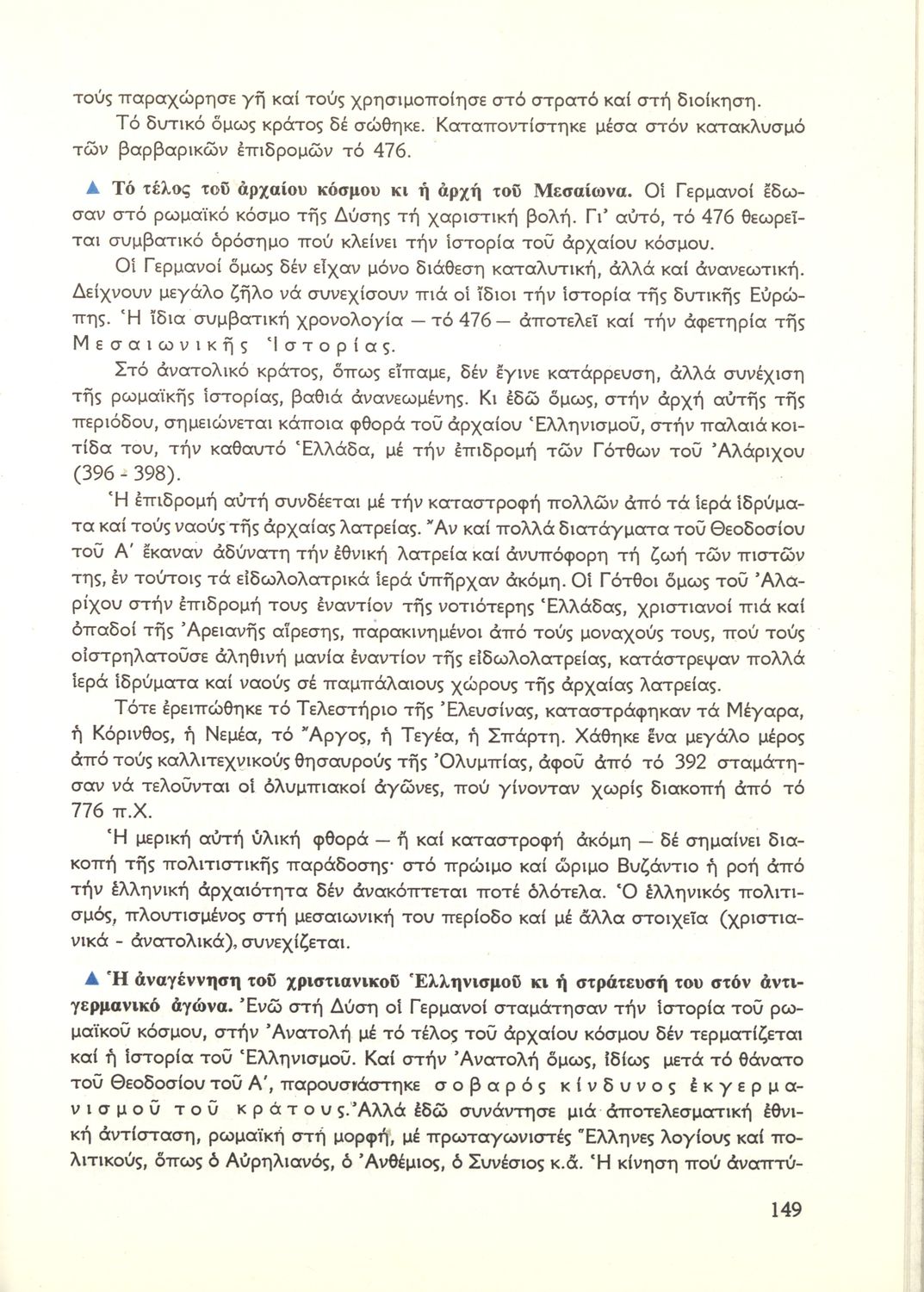 Σχολικό εγχειρίδιο Ιστορίας Β΄ Γυμνασίου που καλύπτει την περίοδο από την κατάληψη της Ελλάδας από τους Ρωμαίους ως την πτώση της Βυζαντινής Αυτοκρατορίας. Γίνεται ιδιαίτερη μνεία στο χριστιανικό και ελληνικό στοιχείο του Βυζαντίου. Προτείνει μια υλιστική ανάγνωση της Ιστορίας την οποία διαβάζει από την οπτική των κοινωνικών συγκρούσεων.