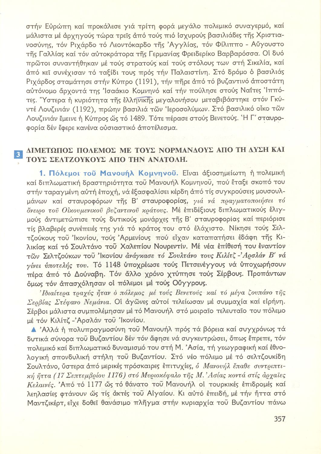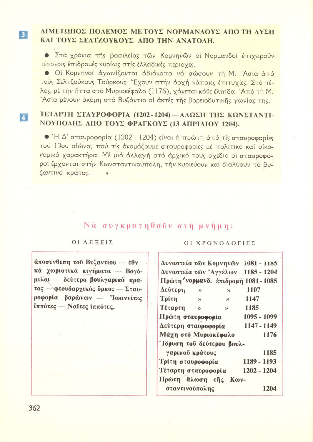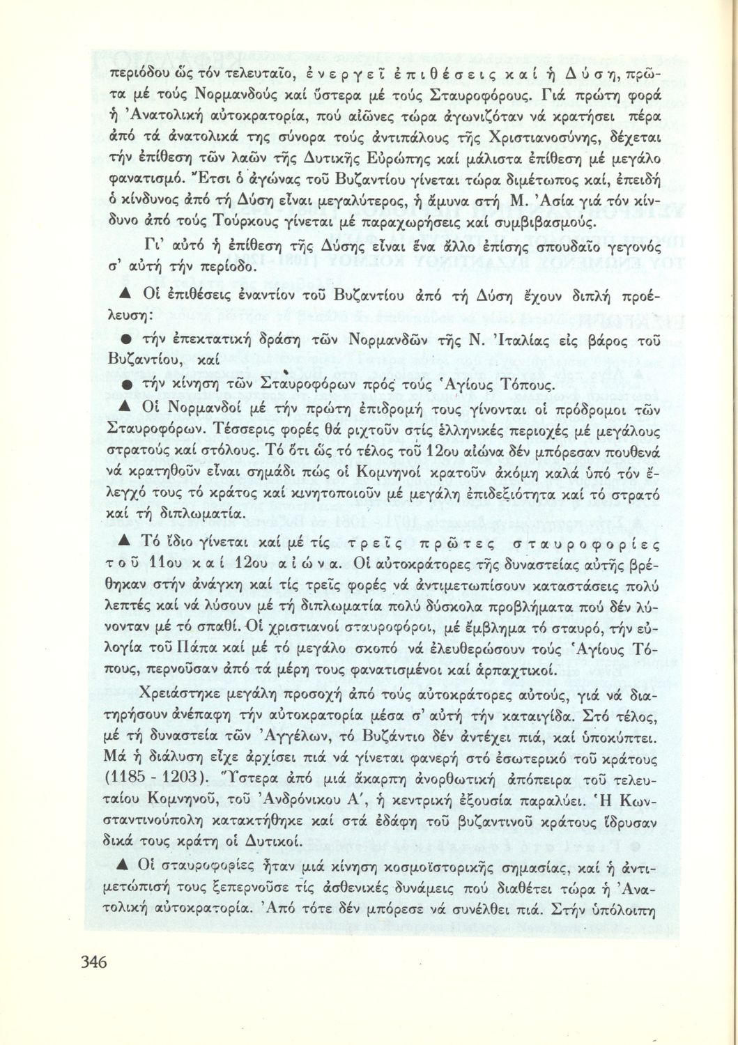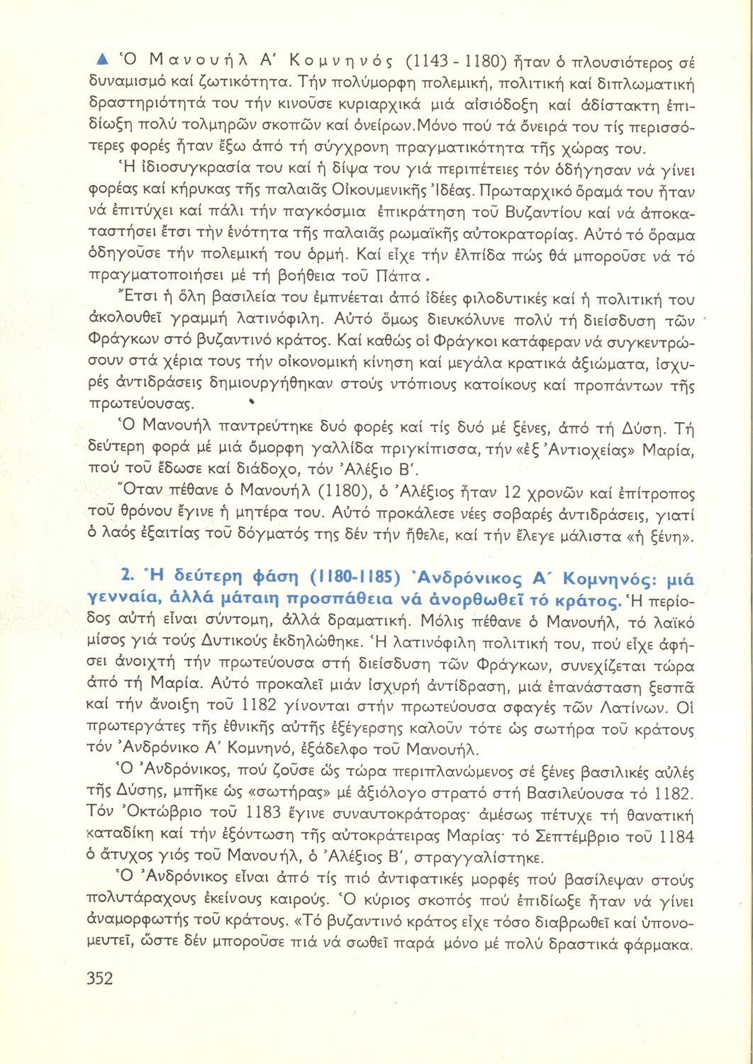Σχολικό εγχειρίδιο Ιστορίας Β΄ Γυμνασίου που καλύπτει την περίοδο από την κατάληψη της Ελλάδας από τους Ρωμαίους ως την πτώση της Βυζαντινής Αυτοκρατορίας. Γίνεται ιδιαίτερη μνεία στο χριστιανικό και ελληνικό στοιχείο του Βυζαντίου. Προτείνει μια υλιστική ανάγνωση της Ιστορίας την οποία διαβάζει από την οπτική των κοινωνικών συγκρούσεων.